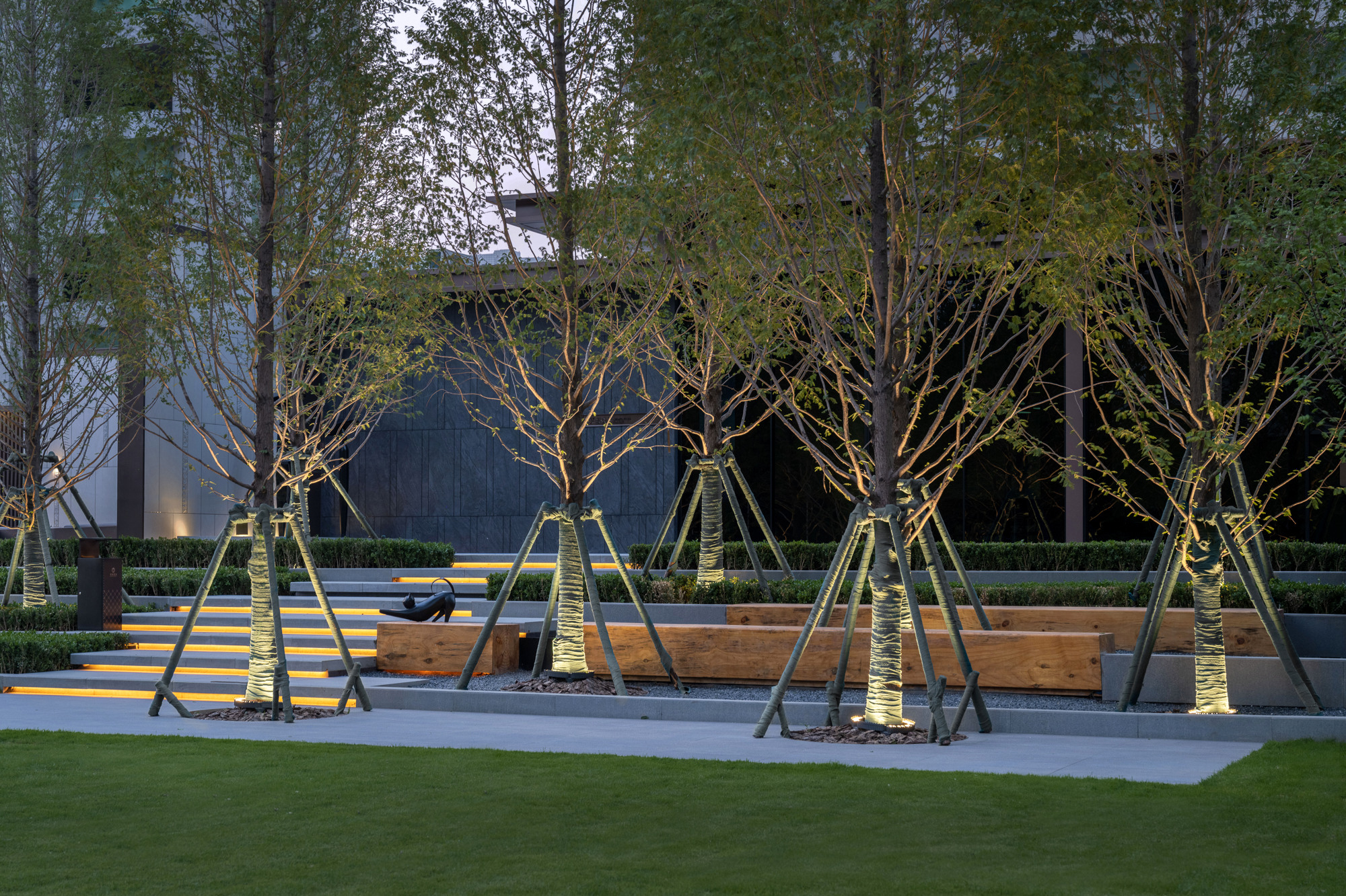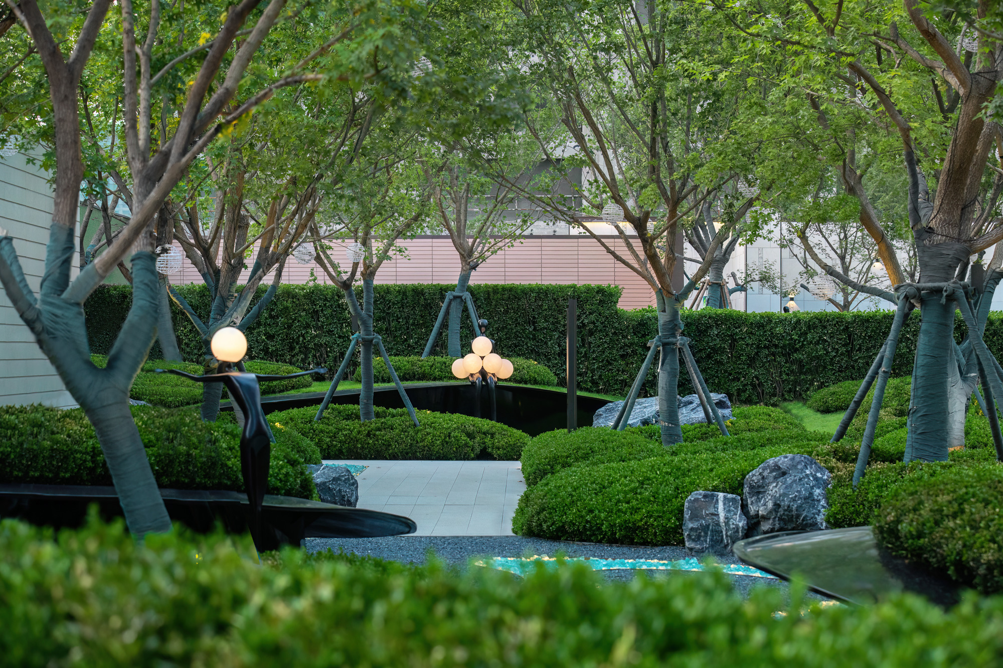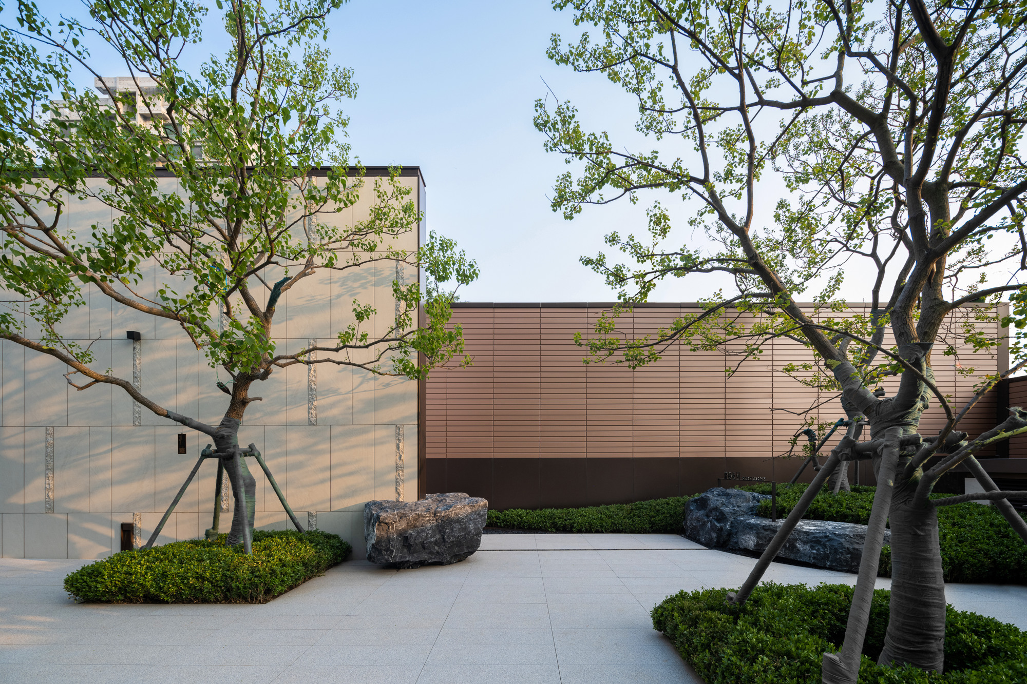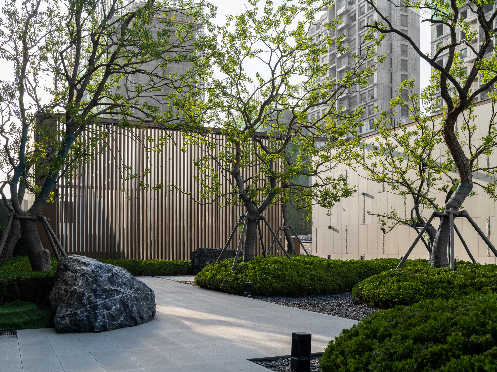 植林成院,覓歲月安然。點(diǎn)植的喬木,礫石、地被、平臺(tái)的分割,使整個(gè)空間充滿節(jié)奏感,置石點(diǎn)綴意境,豐富細(xì)節(jié)。自然永遠(yuǎn)是人類最本真的渴望,在城市中造一片林,歸于自然,在自然里共生。