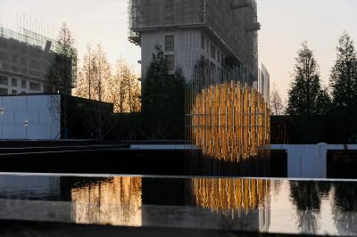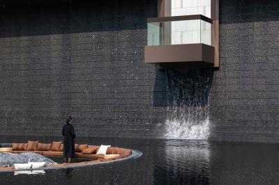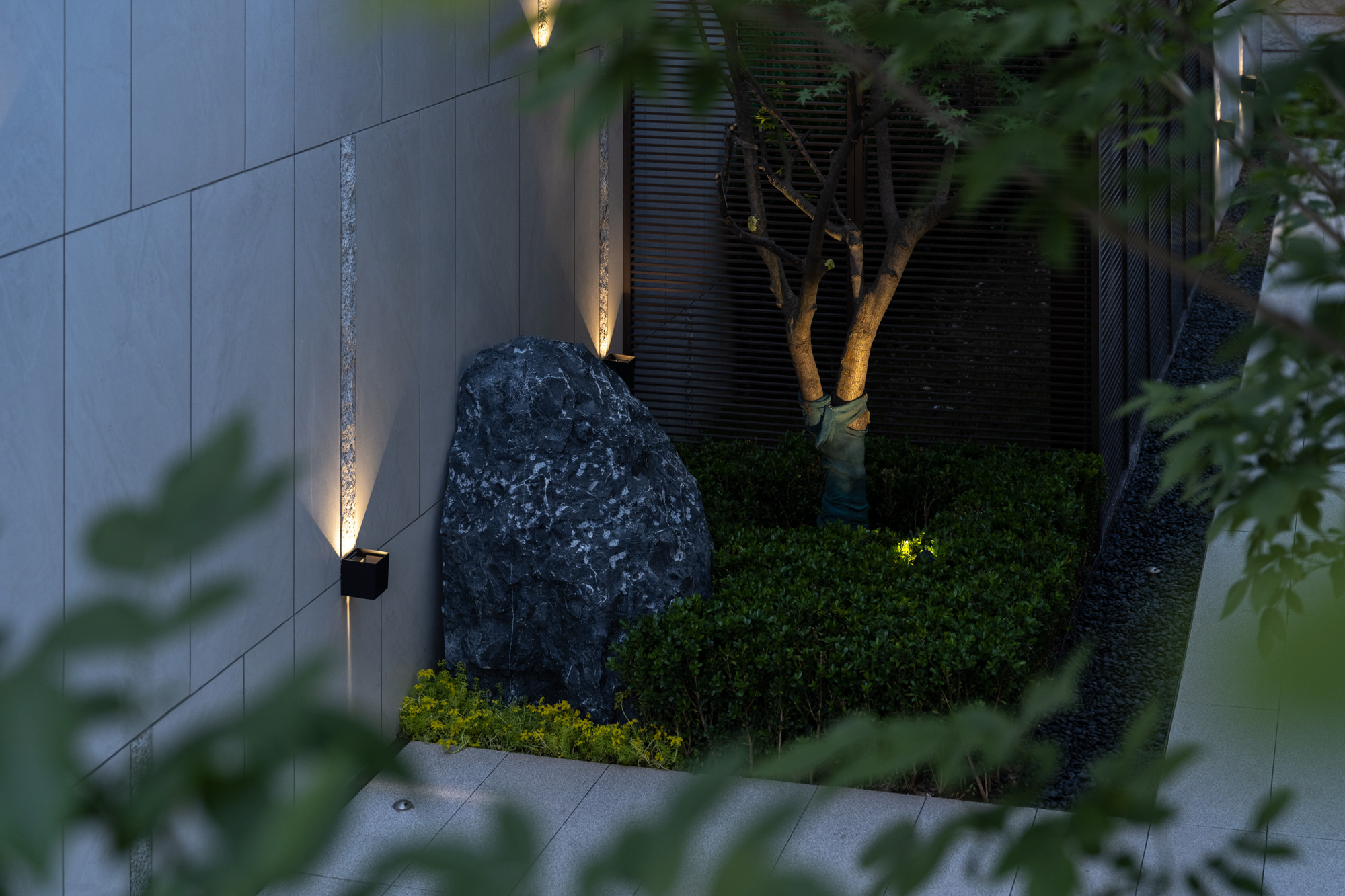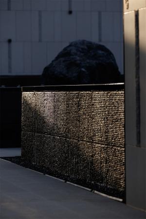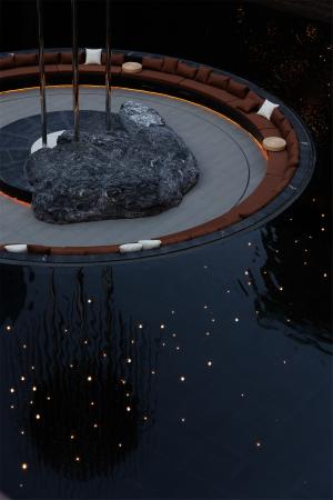 隨著開(kāi)闊山形,信步向前,未聞人語(yǔ),先聞“落澗寒聲泉虢虢”,巨石裝置仰面于熒光水景之上,對(duì)望凝視間,“石”為天地之骨,“瀑”為川流不息,水之潤(rùn)澤豐沛寧?kù)o,虛實(shí)相生,入世畫境,巨型黑山石靜逸高遠(yuǎn),經(jīng)時(shí)間研磨與場(chǎng)地統(tǒng)一新生。