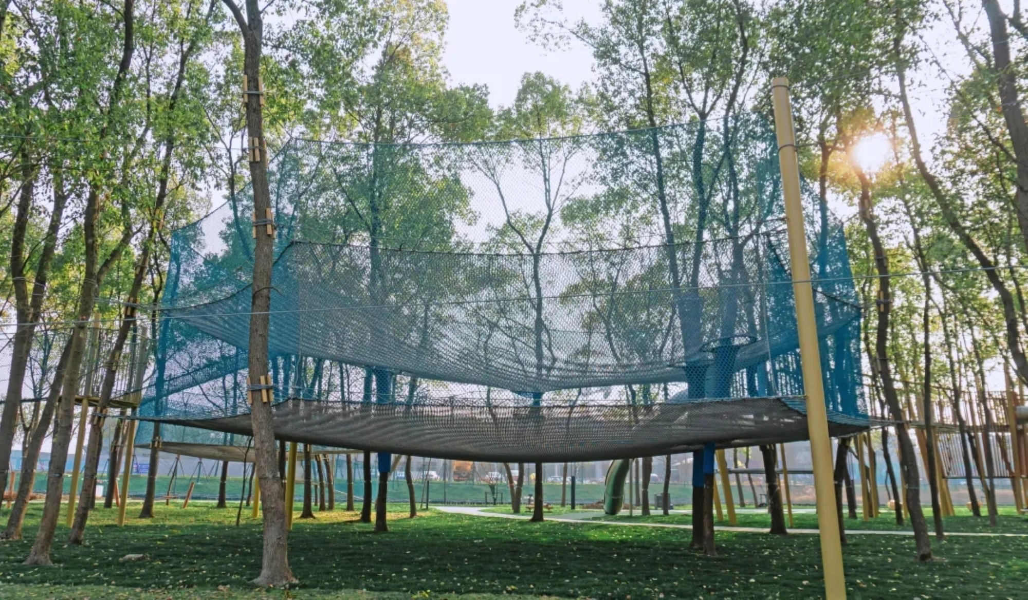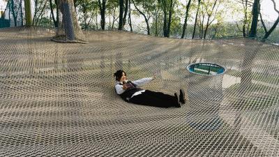 以場地中自然樹木為載體,在加設(shè)部分結(jié)構(gòu)立柱的基礎(chǔ)上而設(shè)計(jì)出的叢林魔網(wǎng),為家長和孩子們創(chuàng)造了一個(gè)柔軟和彈力的游戲空間。一大一小的爬網(wǎng)結(jié)合不同的高度設(shè)計(jì),滿足了各年齡段的游玩需求,全程被網(wǎng)面保護(hù),不需要考慮安全問題,孩子們可以盡情的在魔網(wǎng)上攀爬跳躍。心跳之余大家還可以在魔網(wǎng)上稍事休息,看看周圍美好的風(fēng)景。