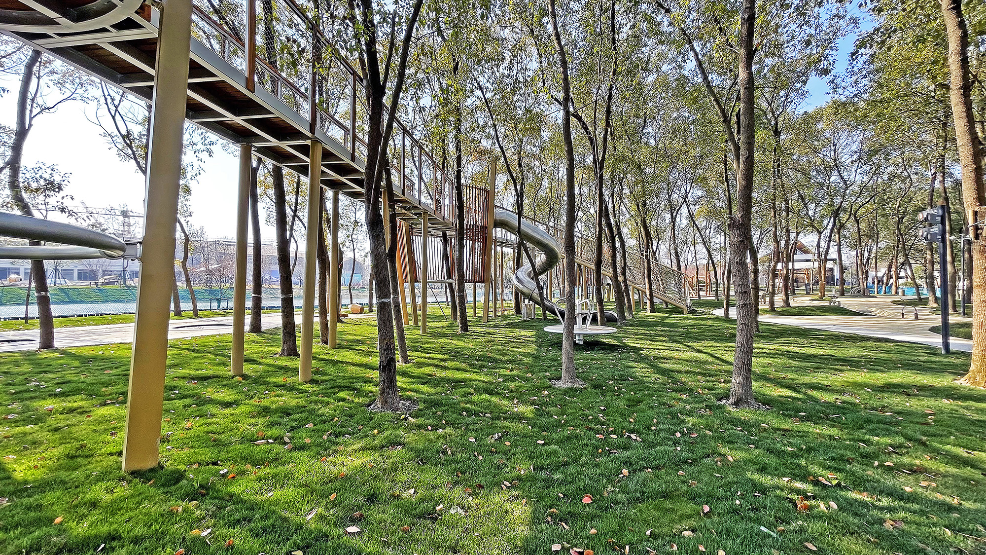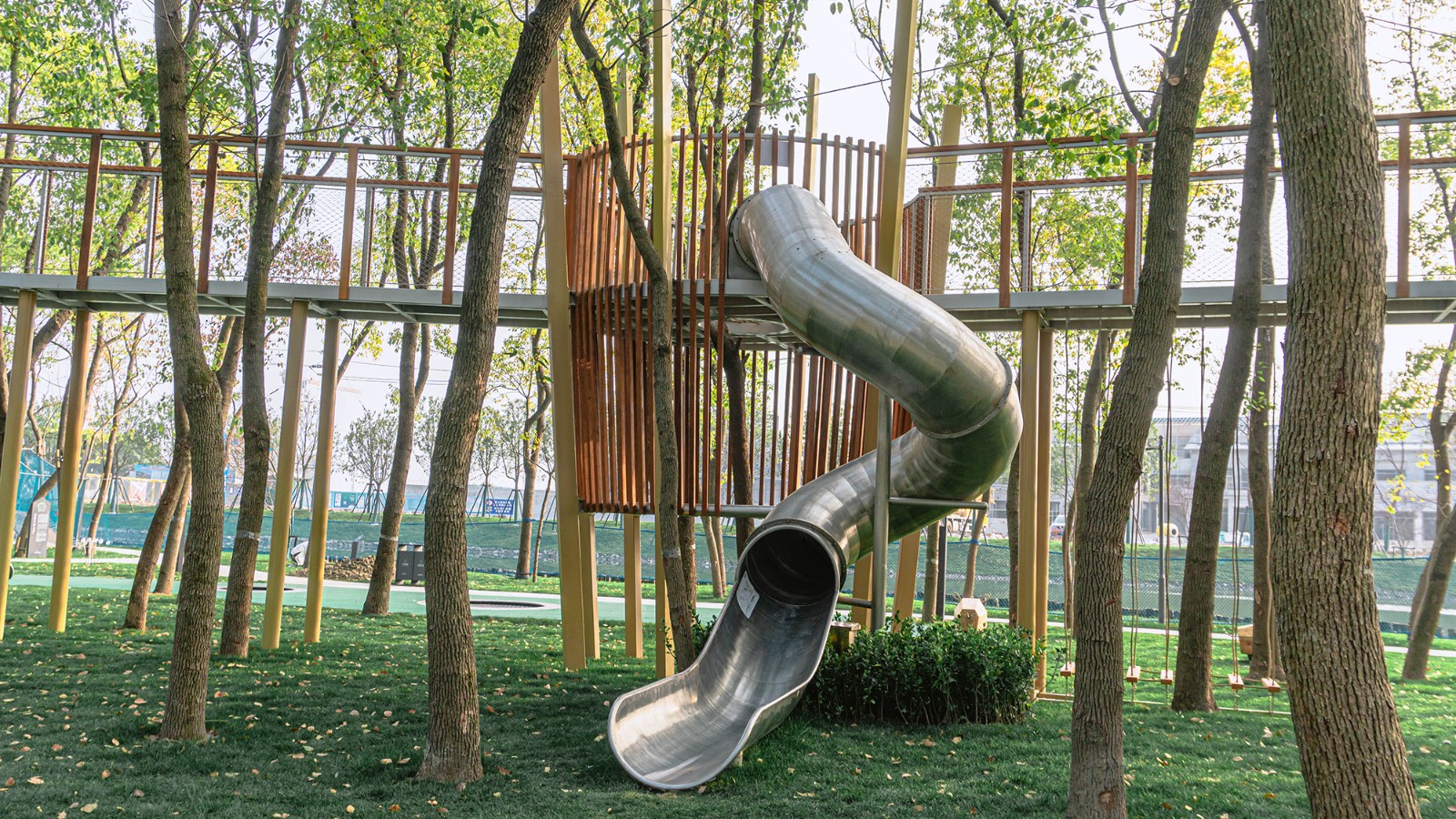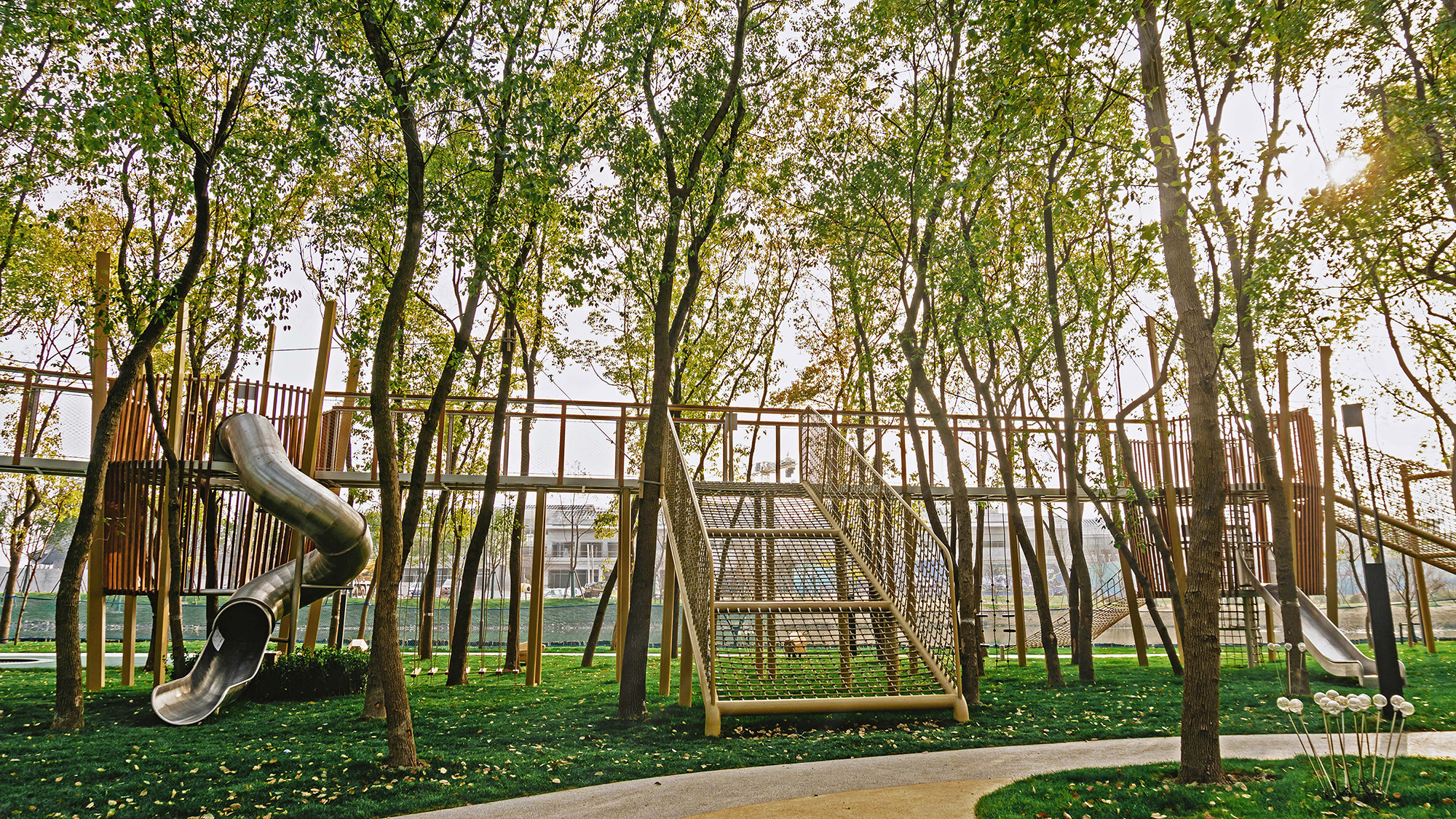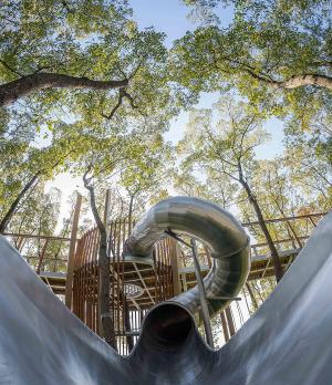 不分年齡的空中棧道及塔樓包含了復(fù)雜、創(chuàng)新和富有挑戰(zhàn)性的游戲體驗(yàn),同時(shí)可以俯瞰整個(gè)兒童場地的景觀。另外,在體驗(yàn)過程中可以近距離的接觸樹梢,親近自然樹林,不同一般的自然體驗(yàn),也是該設(shè)施所擁有的獨(dú)特魅力。