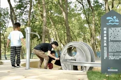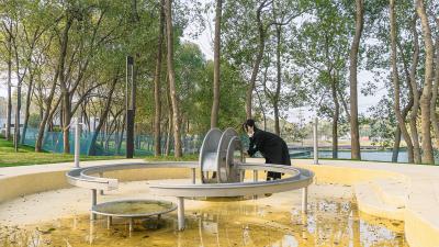“玩水”是孩子們的天性。其實(shí),愛玩水與孩子的認(rèn)知發(fā)展存在莫大關(guān)聯(lián)。人從胚胎開始,就在媽媽子宮的羊水中成長。因此,人與水,從生命的最初就結(jié)下了不解之緣。在反復(fù)的操作中,裝置隱含奇妙的物理原理,孩子們潛移默化地感受著物理世界的法則,流水通過小徑緩緩流動(dòng)到多個(gè)戲水節(jié)點(diǎn),在玩耍戲水同時(shí)獲得水利科普知識。