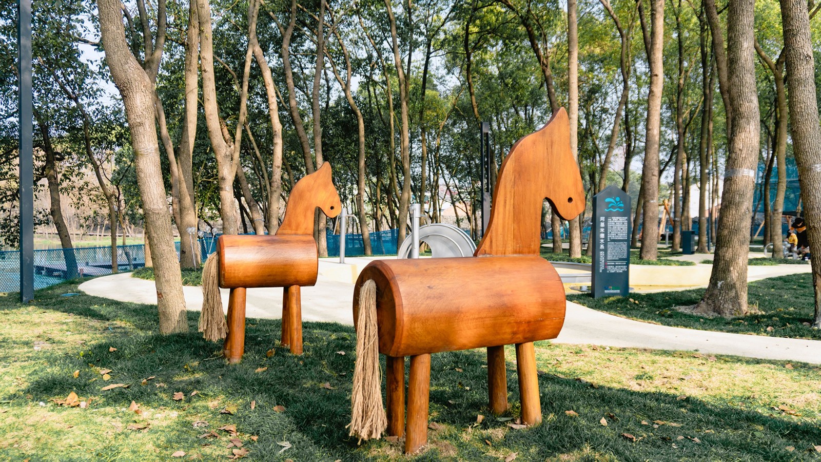 A few wooden horses create a unique childhood scene in the forest, and also activate the childhood memories of adults.