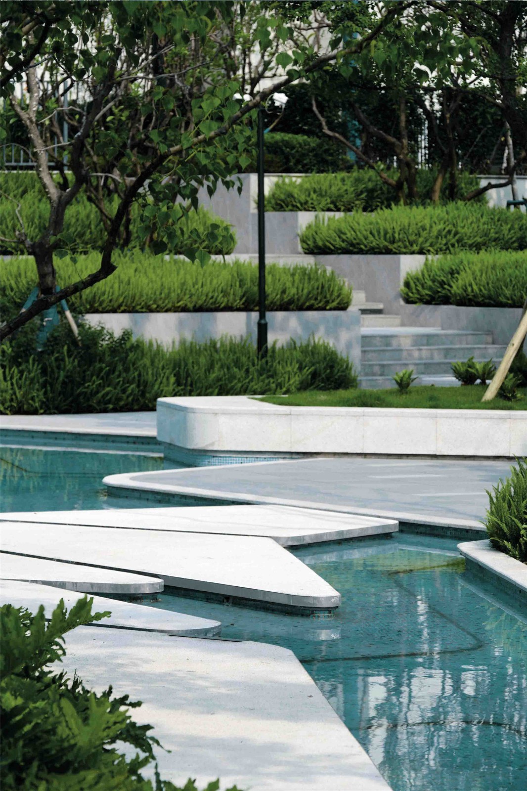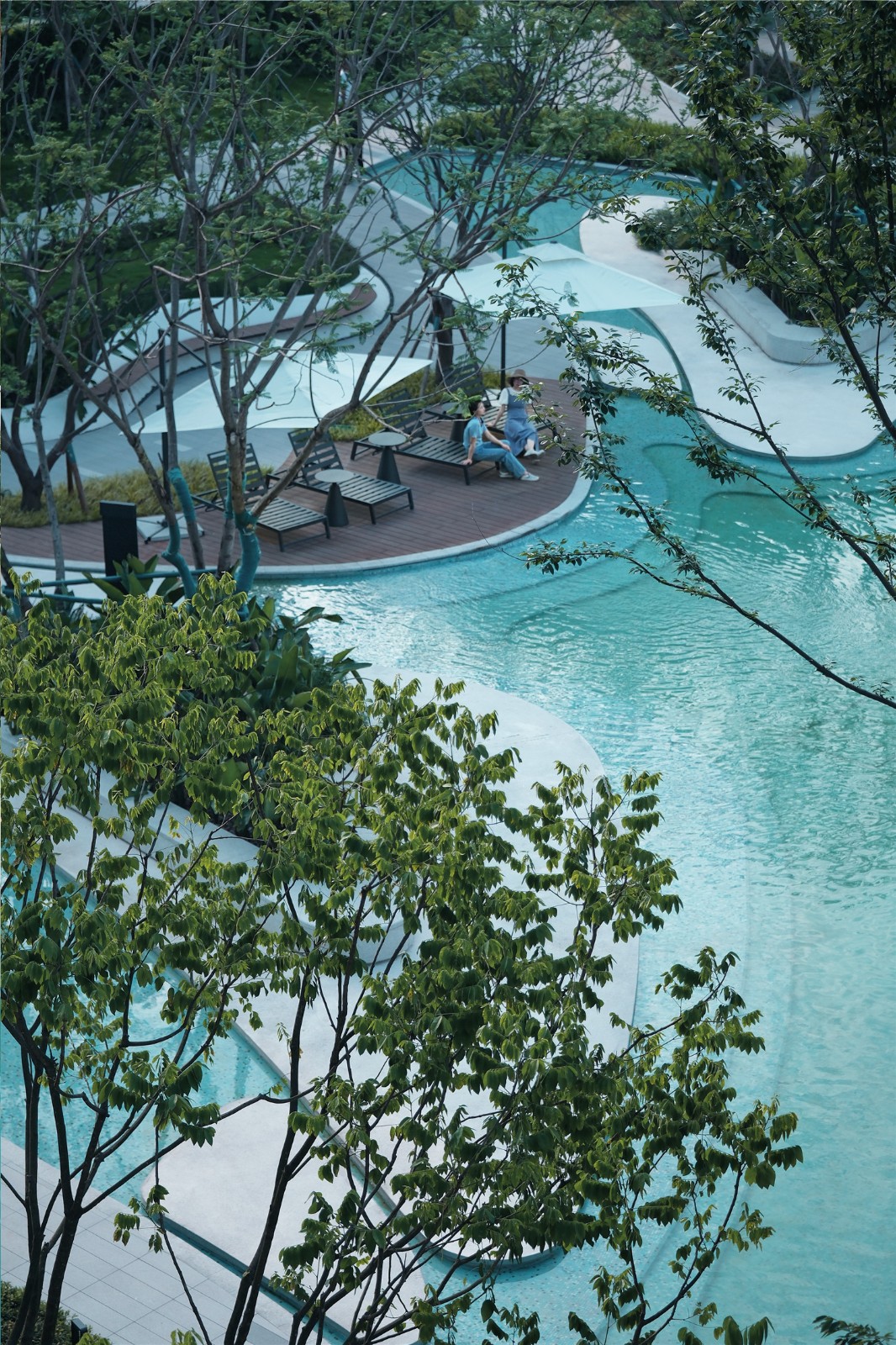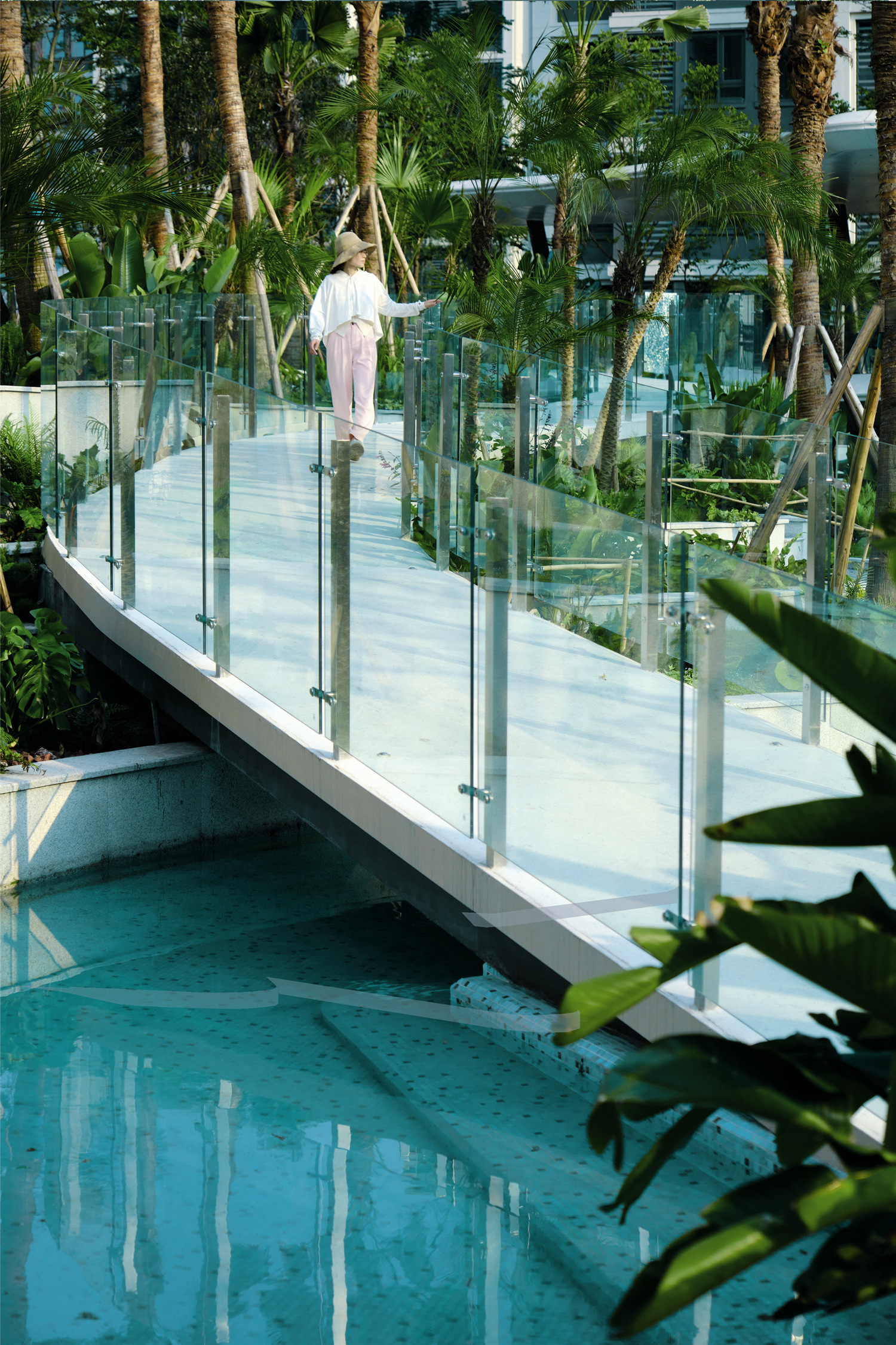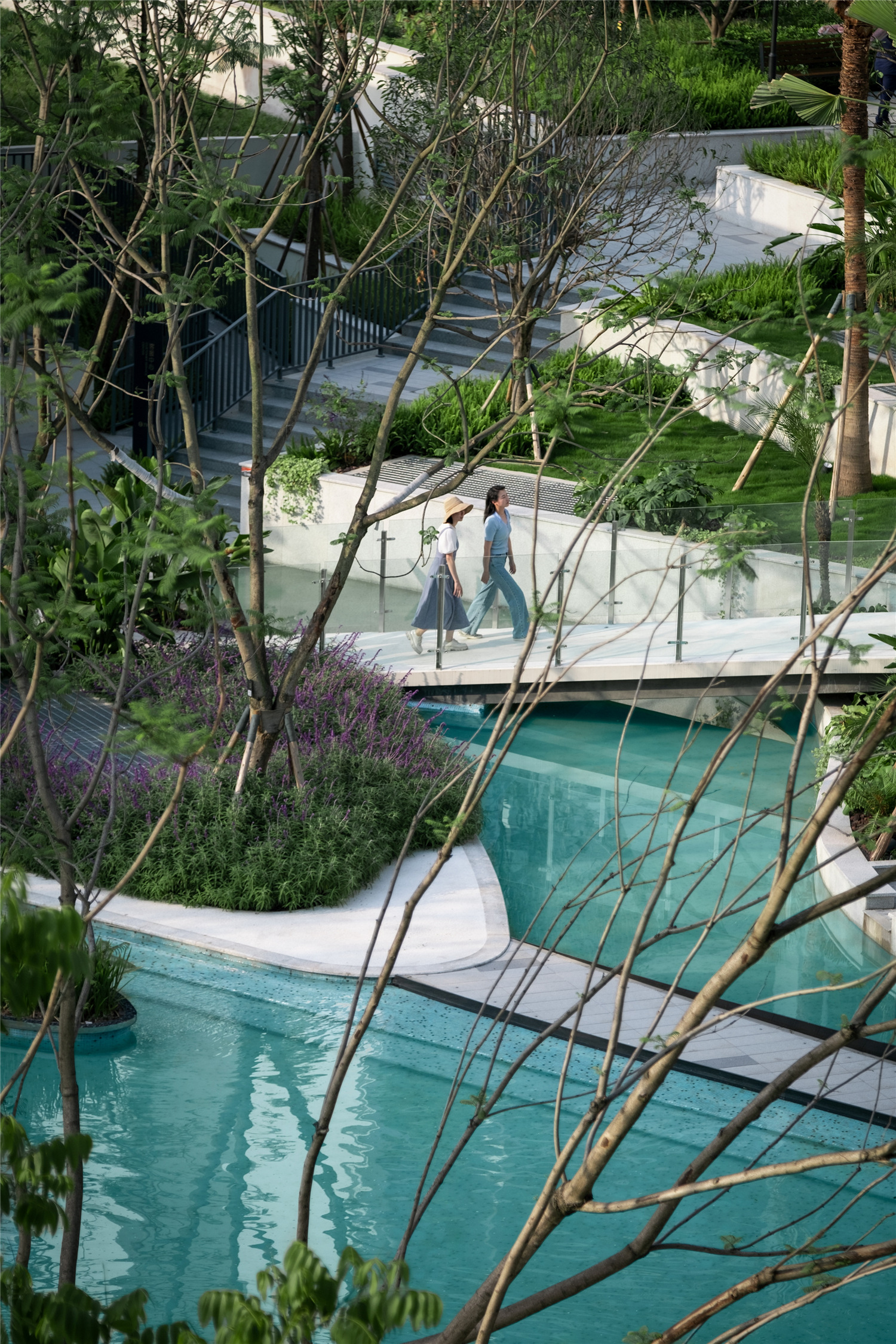 The designed site height difference brings a rich sense of hierarchy to the landscape vertically. The layered terraced plants, while cleverly digesting the height difference, bring a magnificent visual perception of the tropical jungle. They connect different levels of landscape space, providing residents with water-friendly atmosphere, such as watching the water, pressing close to the water, and playing in the water.