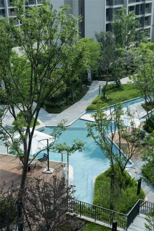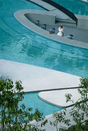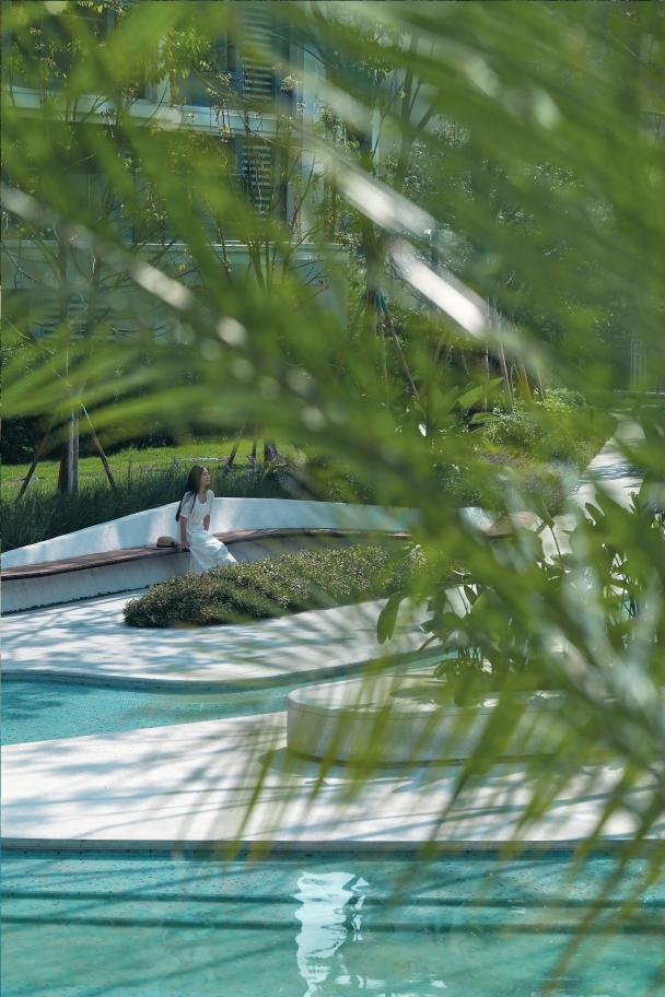 Stepping stones on water surface, waterfront falling water, waterborne platforms, water-based seats, and water shore club.... These "shoals" seemingly "washed out" by the flowing oases bring more vacation experience to the residents.