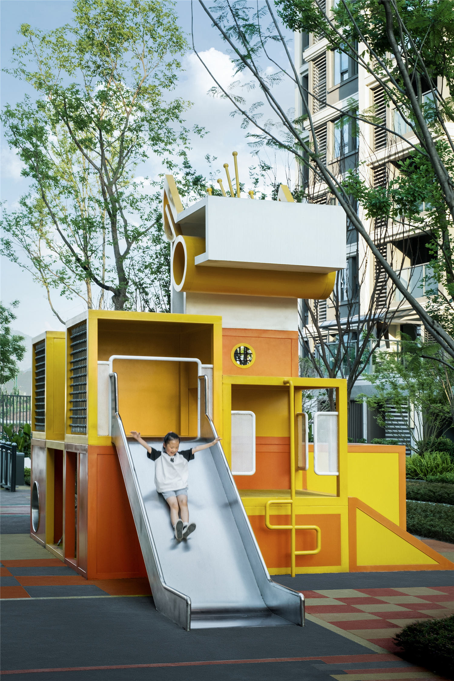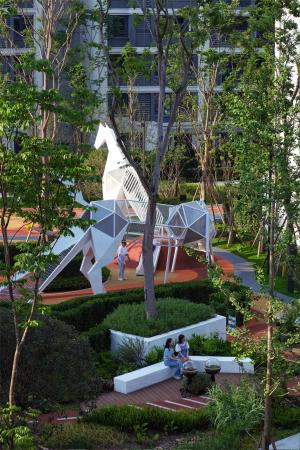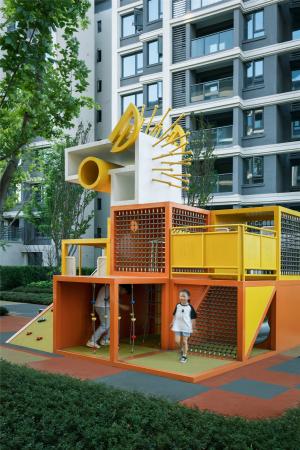 錯(cuò)落的線條勾勒出一首立體的詩、一幅流動(dòng)的畫。大至中庭,近至樓下,每行一步都有著不同的景致,讓忙碌歸家的人們都等不及想出來坐坐。或約三五好友,或和小朋友相約來一次親子冒險(xiǎn),或?qū)ひ惶帾?dú)處,讓度假感受浸入日常生活里。