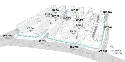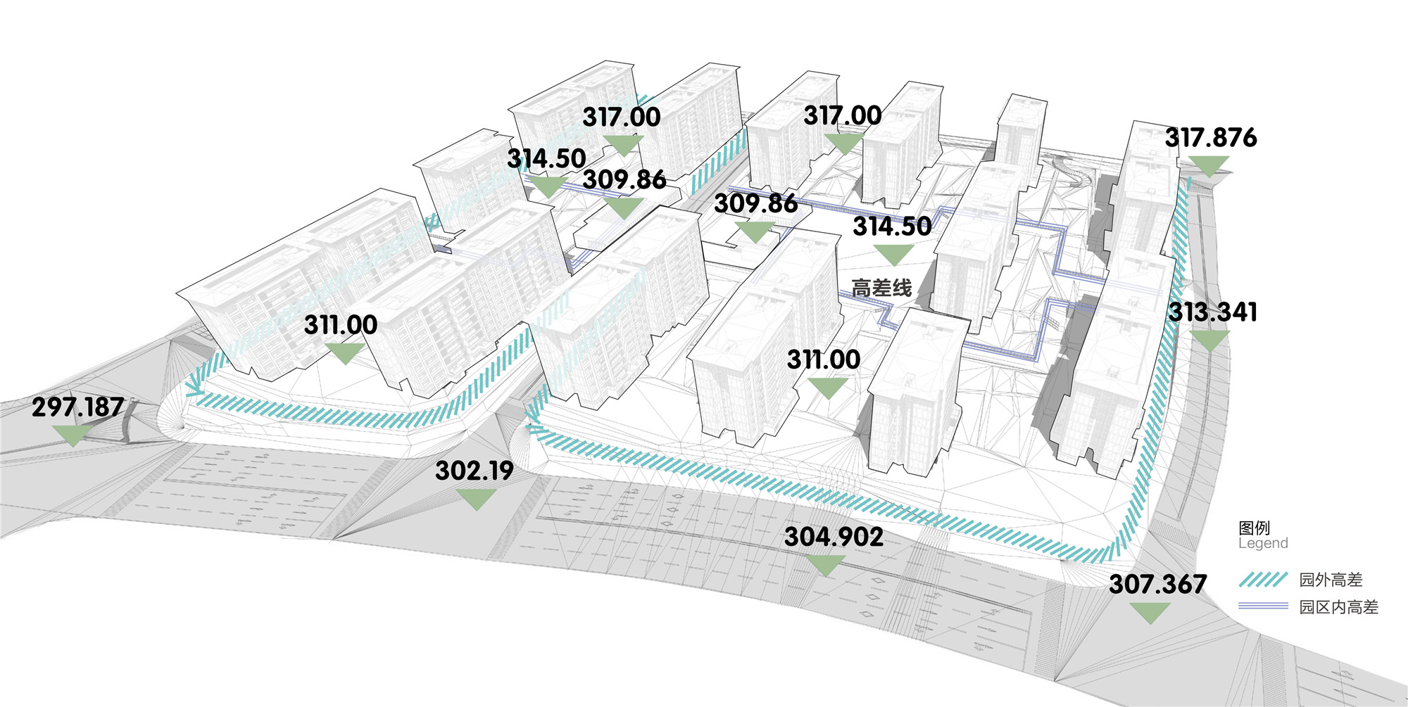場地東高西低形成了三個(gè)遞進(jìn)式臺(tái)地式高差,三個(gè)臺(tái)地整體高差近6米。建筑在場地呈排列布局,并且位于三個(gè)不同標(biāo)高之上,這使得三個(gè)臺(tái)地把場地分割成了三部分,割裂了場地之間的聯(lián)系。