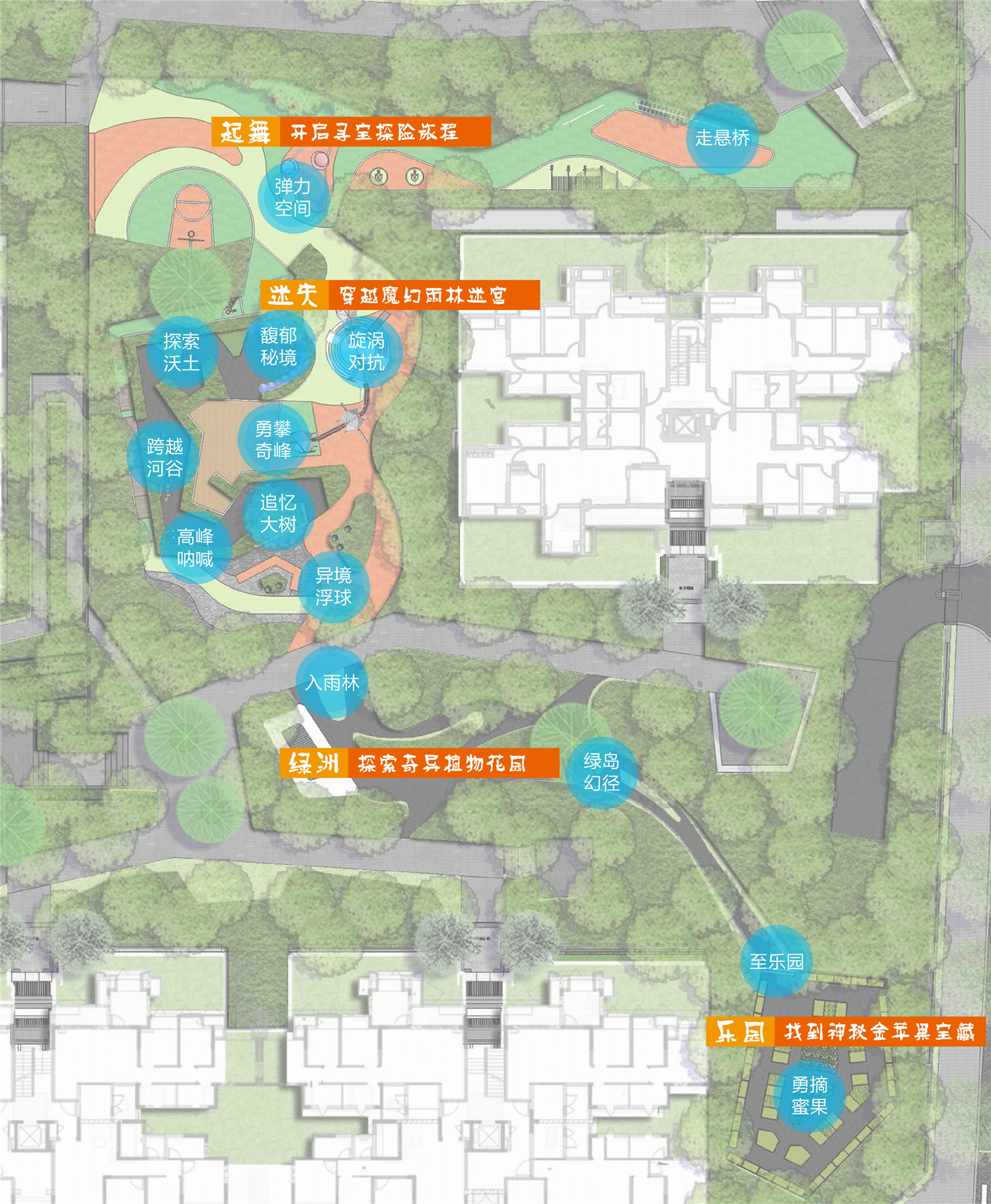 通過“雨林迷蹤”這一精彩的故事線,我們將成人健身,兒童活動(dòng),植物科普,老年康養(yǎng)場地串聯(lián)起來,各場地之間相互交叉又各自獨(dú)立,滿足了兒童,老年,需要看護(hù)的需求。