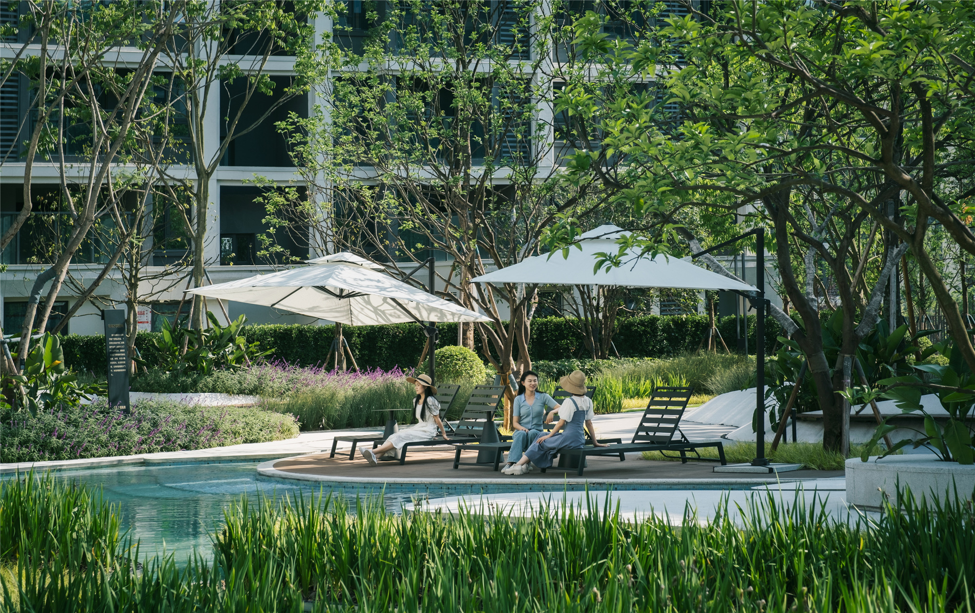 水上汀步、水岸疊水、親水平臺(tái)、水上卡座以及水岸泛會(huì)所...這些形似被流動(dòng)的綠洲“沖刷出”的“淺灘”為居者帶來了更多度假體驗(yàn)。