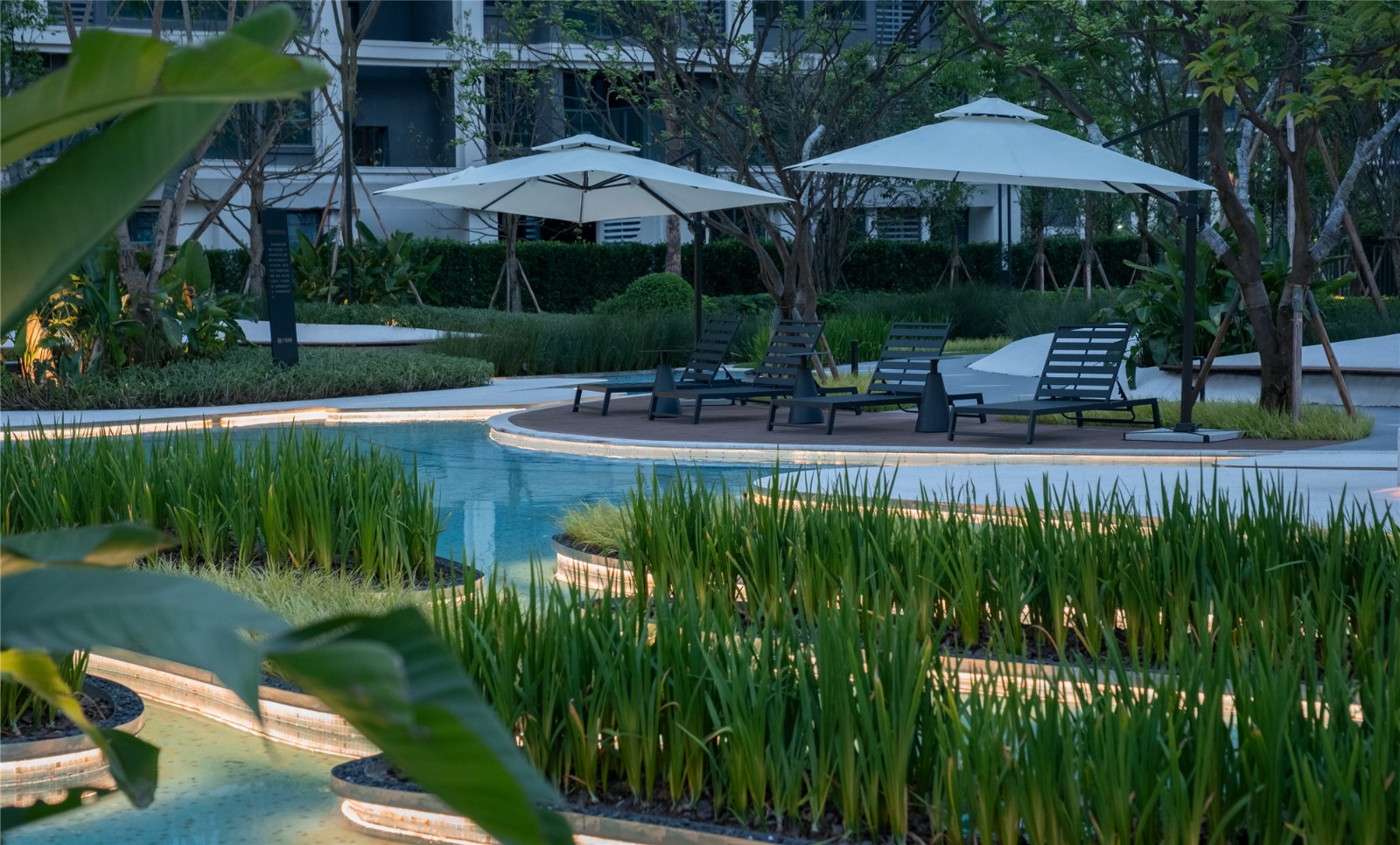 設(shè)計(jì)利用場地高差在豎向上為景觀帶來了豐富的層次感,層疊的梯田式植物種植,巧妙消化高差的同時(shí),帶來壯美的熱帶叢林視覺觀感,并聯(lián)通著不同層級(jí)的景觀空間,為居者提供望水,鄰水,戲水等不同的親水氛圍。