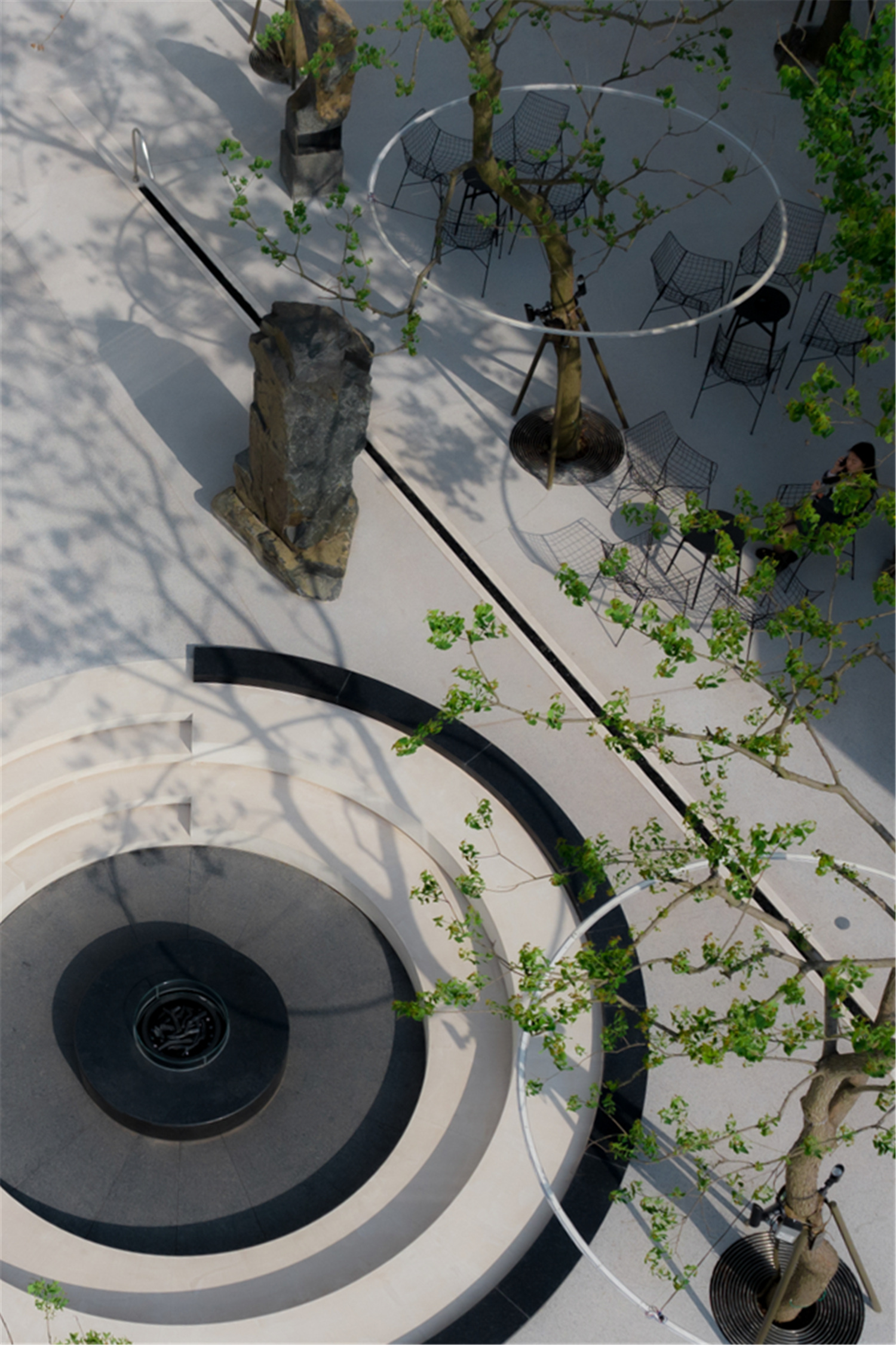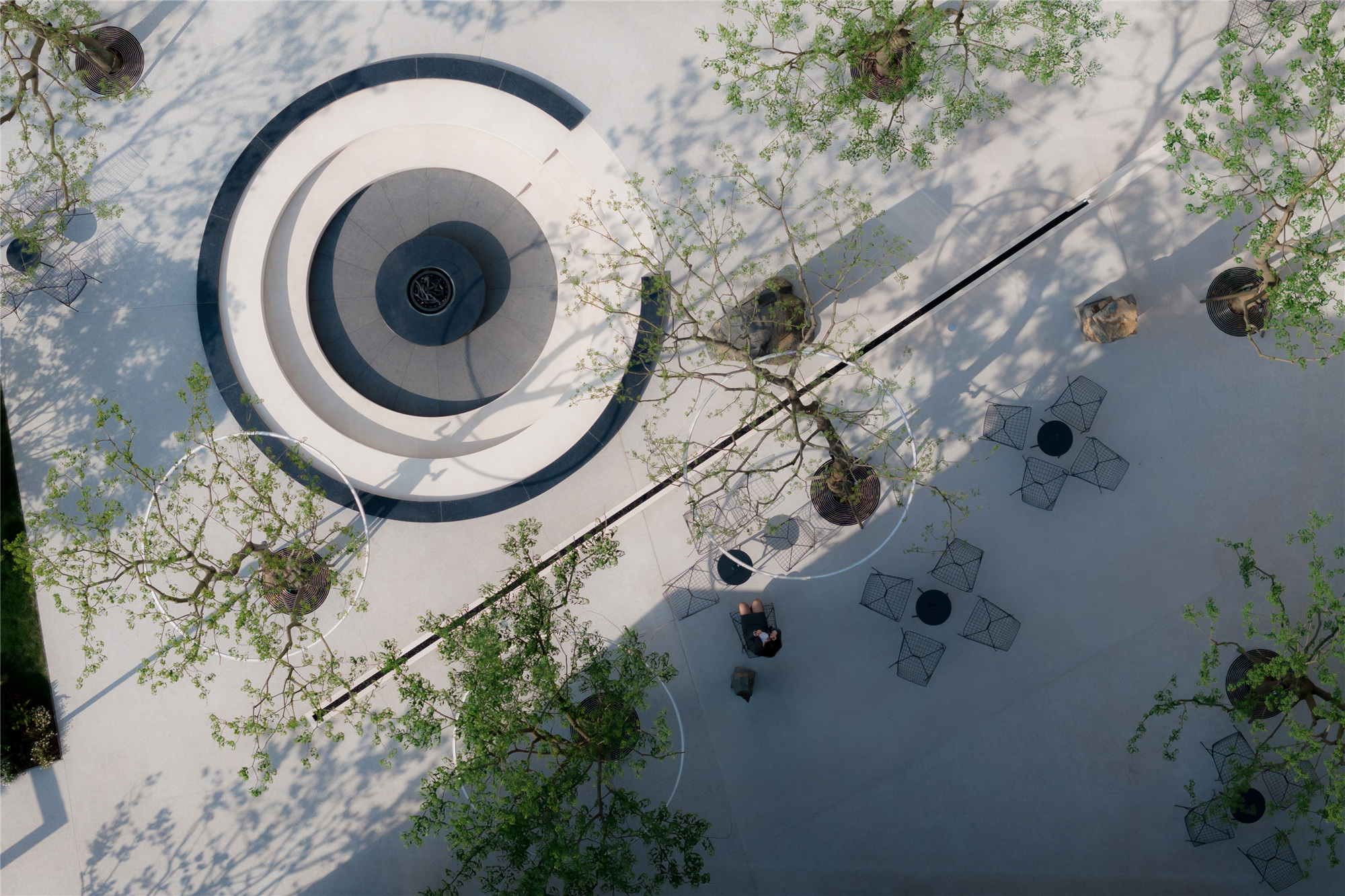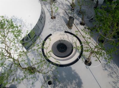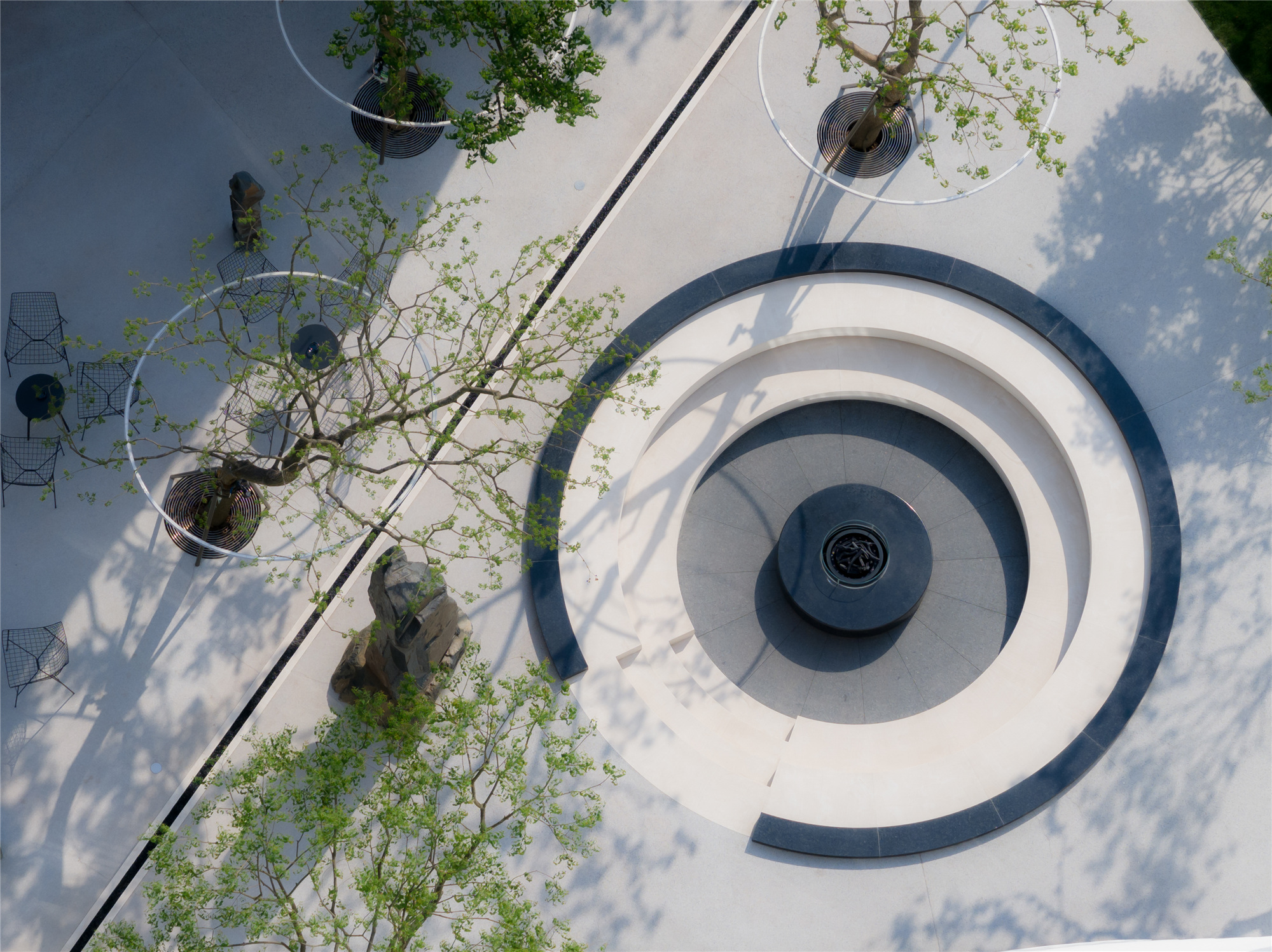 The circular sunken activity area continues to echo the building. Functionally, it also provides more possibilities for people to gather and socialize. In addition, we use a series of landscaped "captures" to seize natural spectacles, like the undulation of water, the refraction of sunlight, and the swaying tree shadows.