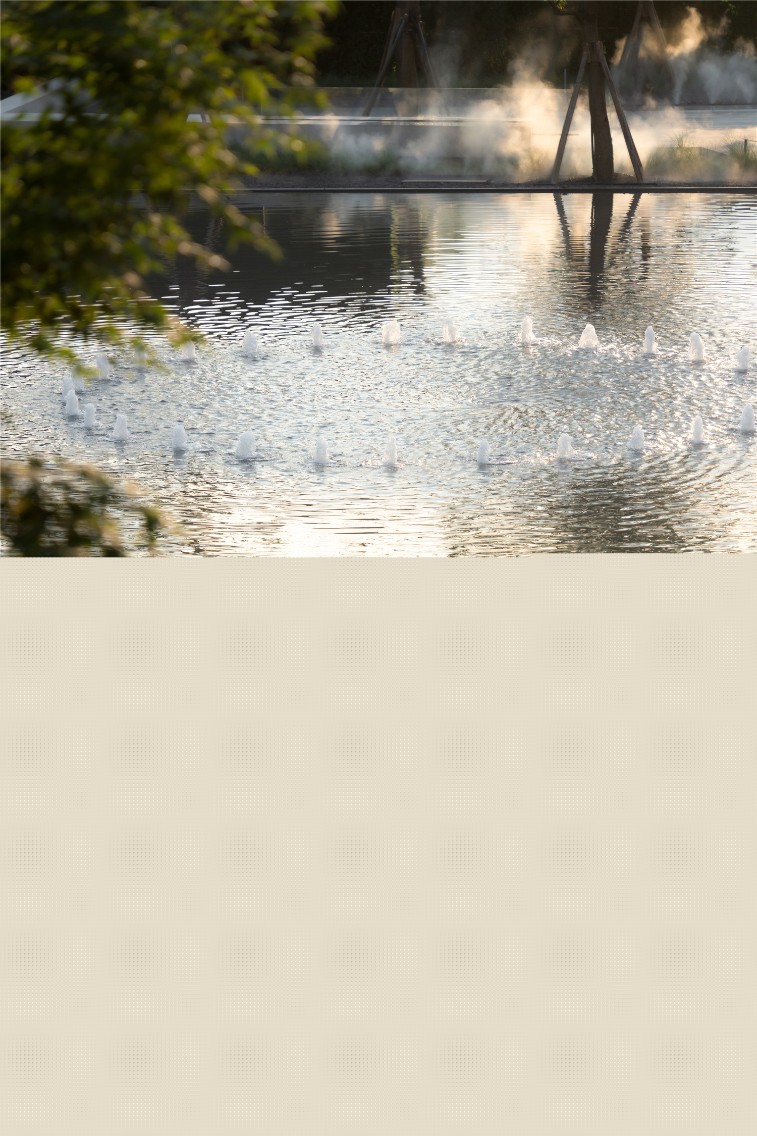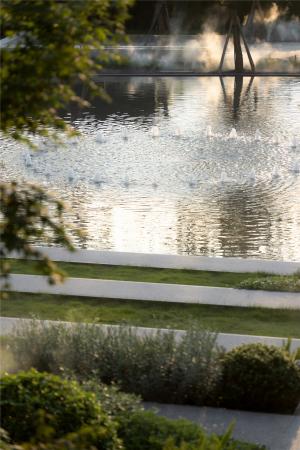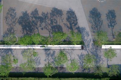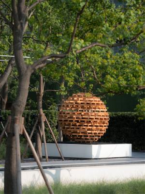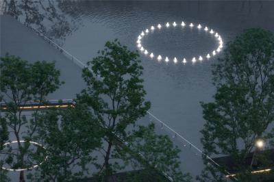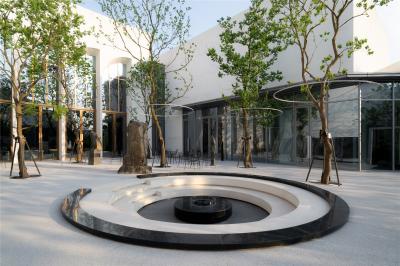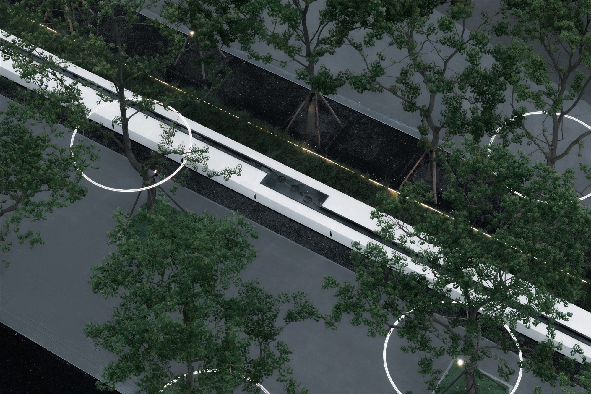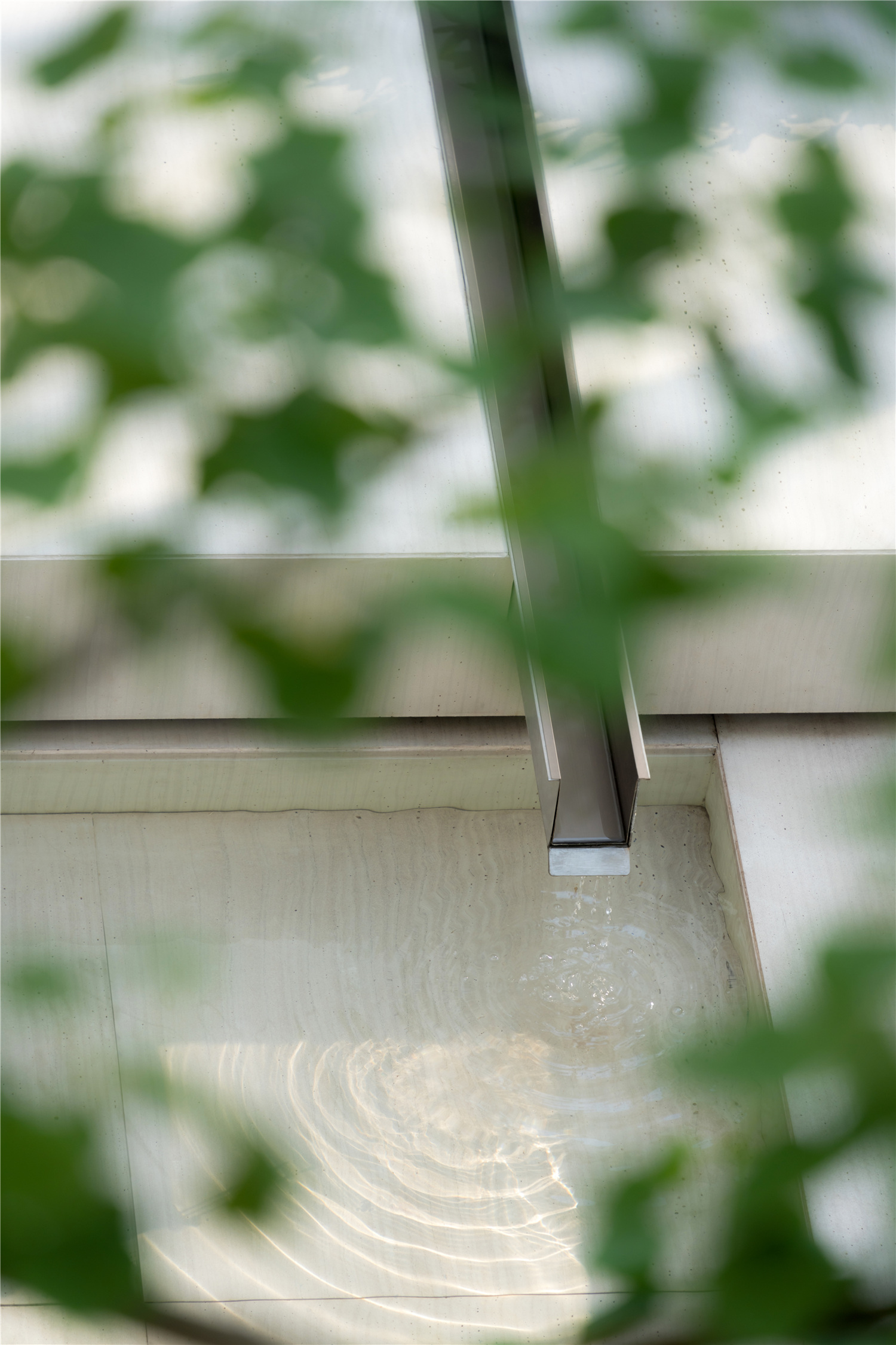 The circular sunken activity area continues to echo the building. Functionally, it also provides more possibilities for people to gather and socialize. In addition, we use a series of landscaped "captures" to seize natural spectacles, like the undulation of water, the refraction of sunlight, and the swaying tree shadows.