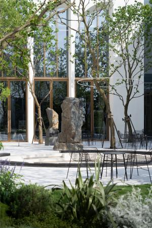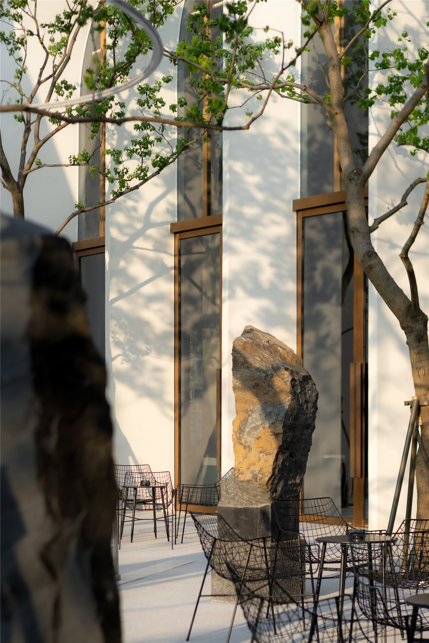 梯步的盡頭是建筑的外場(chǎng),一處被建筑半包裹的庭院,這里仿佛是天然的戶外展廊。我們把藝術(shù)作為該區(qū)域的焦點(diǎn),通過藝術(shù)雕塑來聚焦視線,粗狂的石頭與精致的庭院形成碰撞,藝術(shù)與寫實(shí)的強(qiáng)烈對(duì)比,具有獨(dú)特的藝術(shù)情緒表達(dá)。