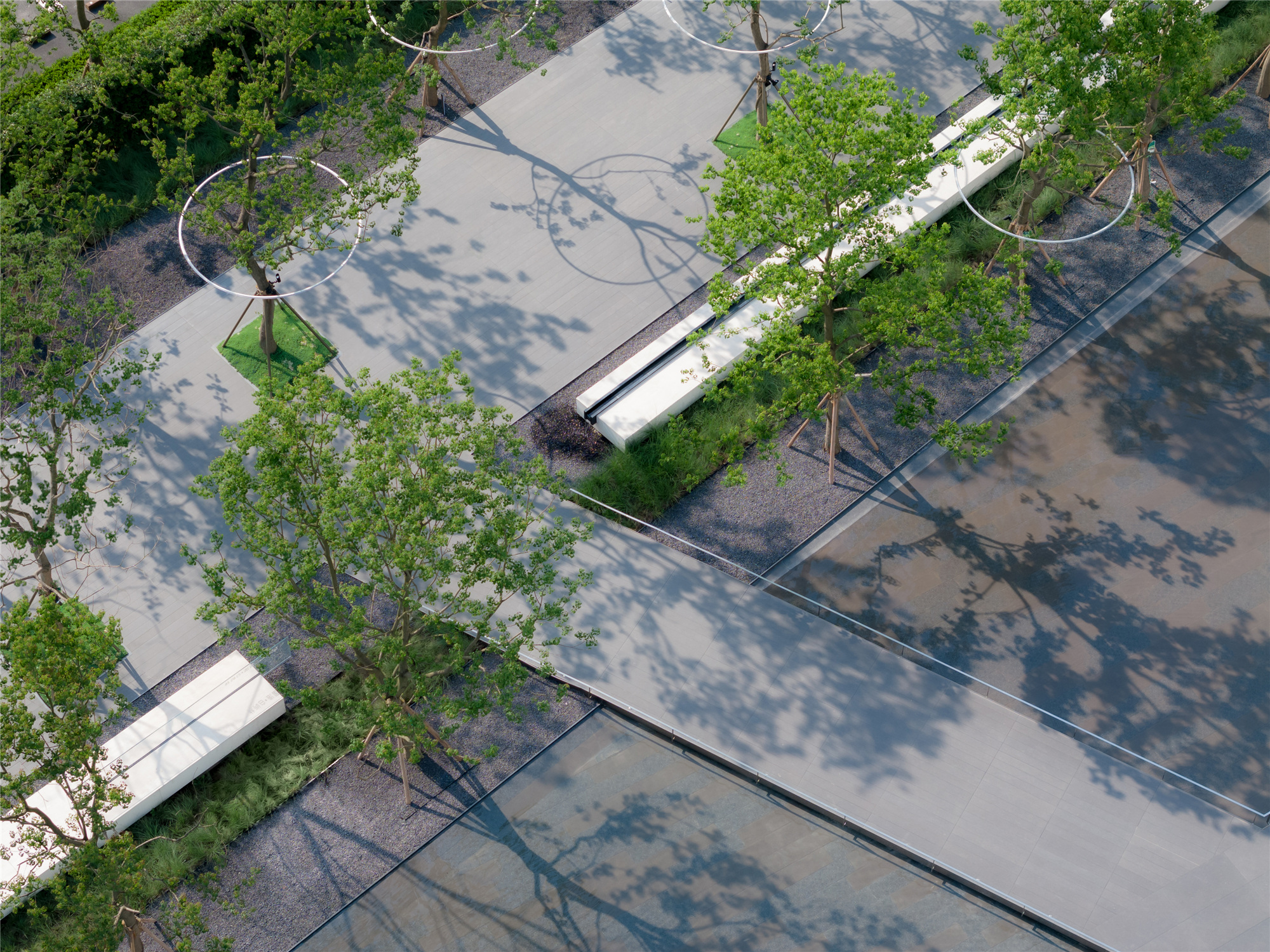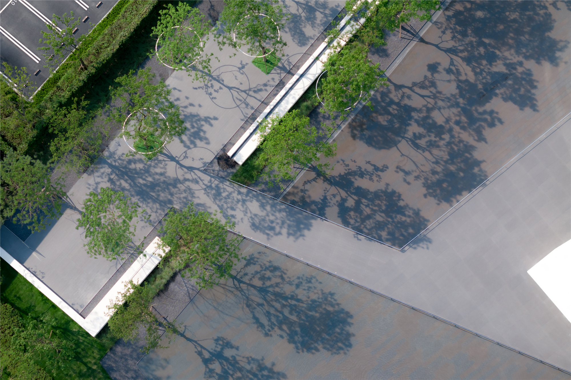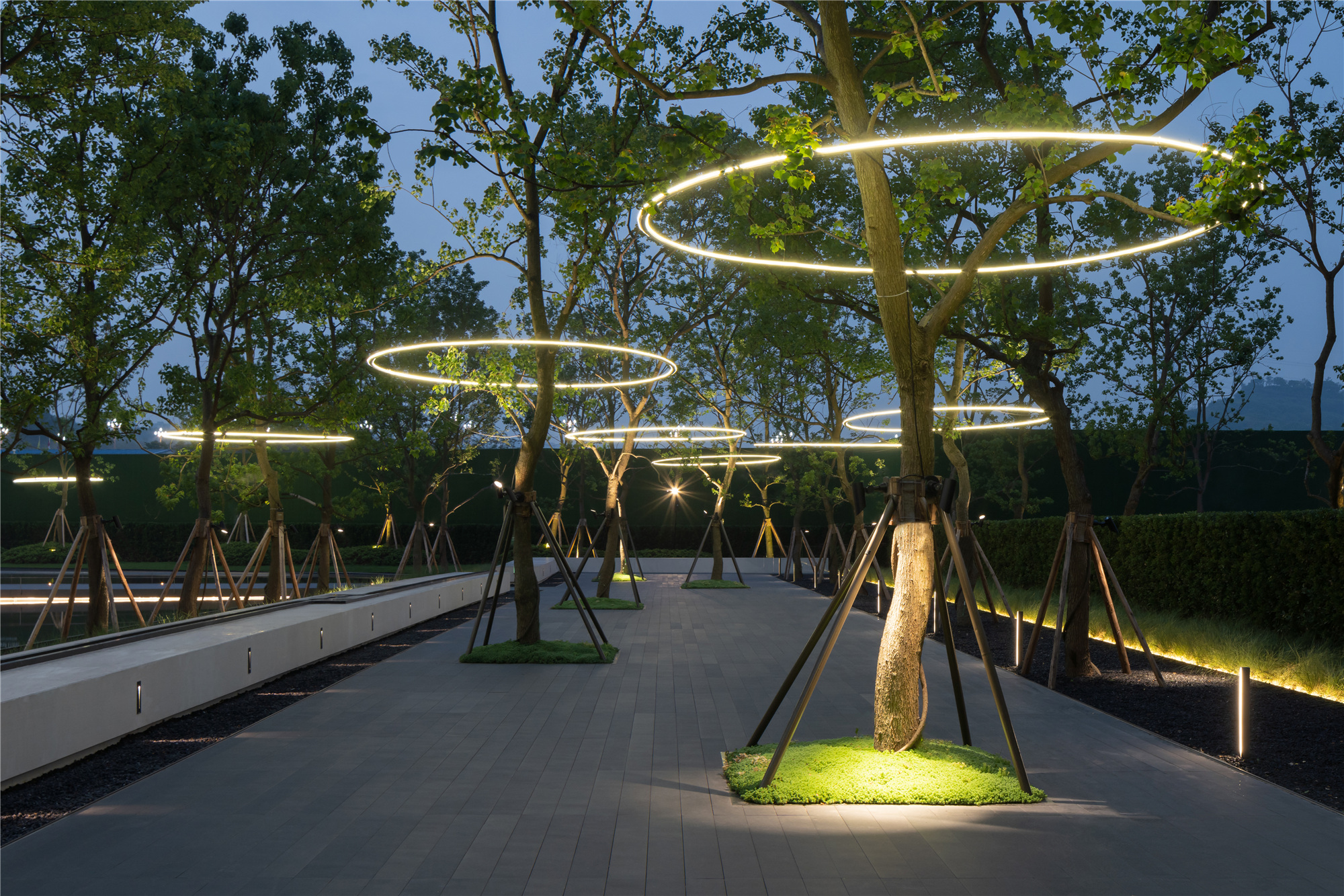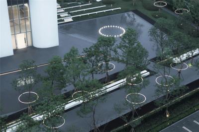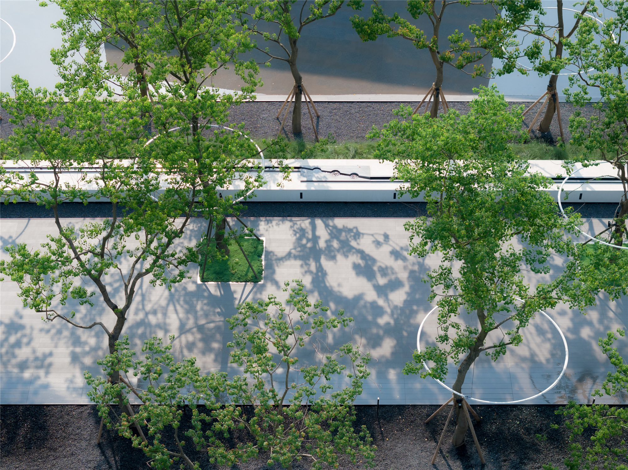 首先是景觀對(duì)建筑形態(tài)進(jìn)行延伸,比如利用豐富的線條與方圓等幾何形態(tài)將開敞的前場(chǎng)進(jìn)行切割,散落的圖形既串聯(lián)起整個(gè)前場(chǎng),又破局原本看上去呆板無趣的空間構(gòu)成。