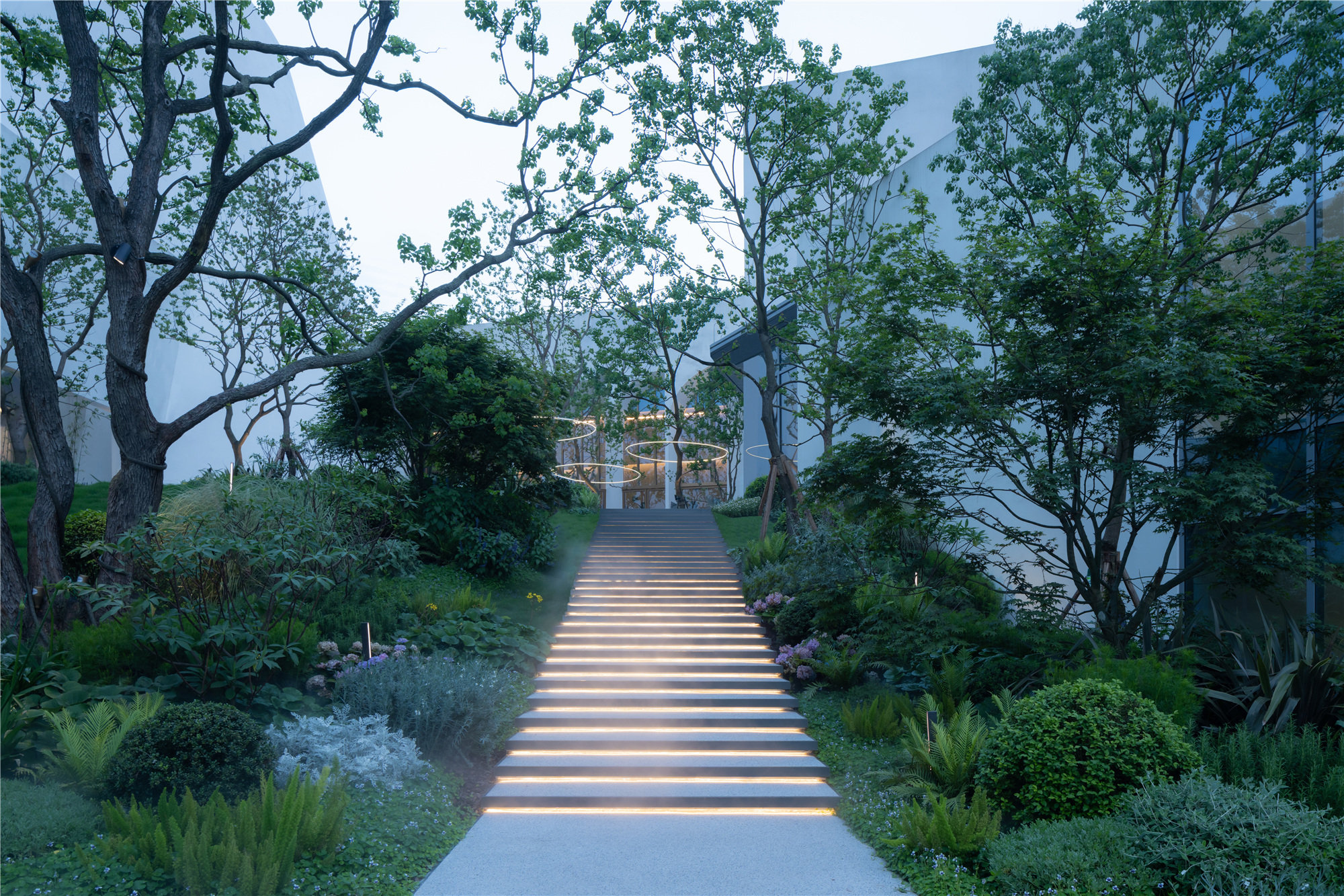 After crossing the water area, the terrain begins to rise gradually. We use steps to address approximately a 5m height difference, which also generates a mid-field passage. We spread plants along both sides of the passage. Plants offer a soft and romantic expression and provide the smoothest and most natural transition. They are like carefully crafted paintings displayed on both sides of the passage for people to admire.