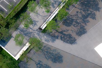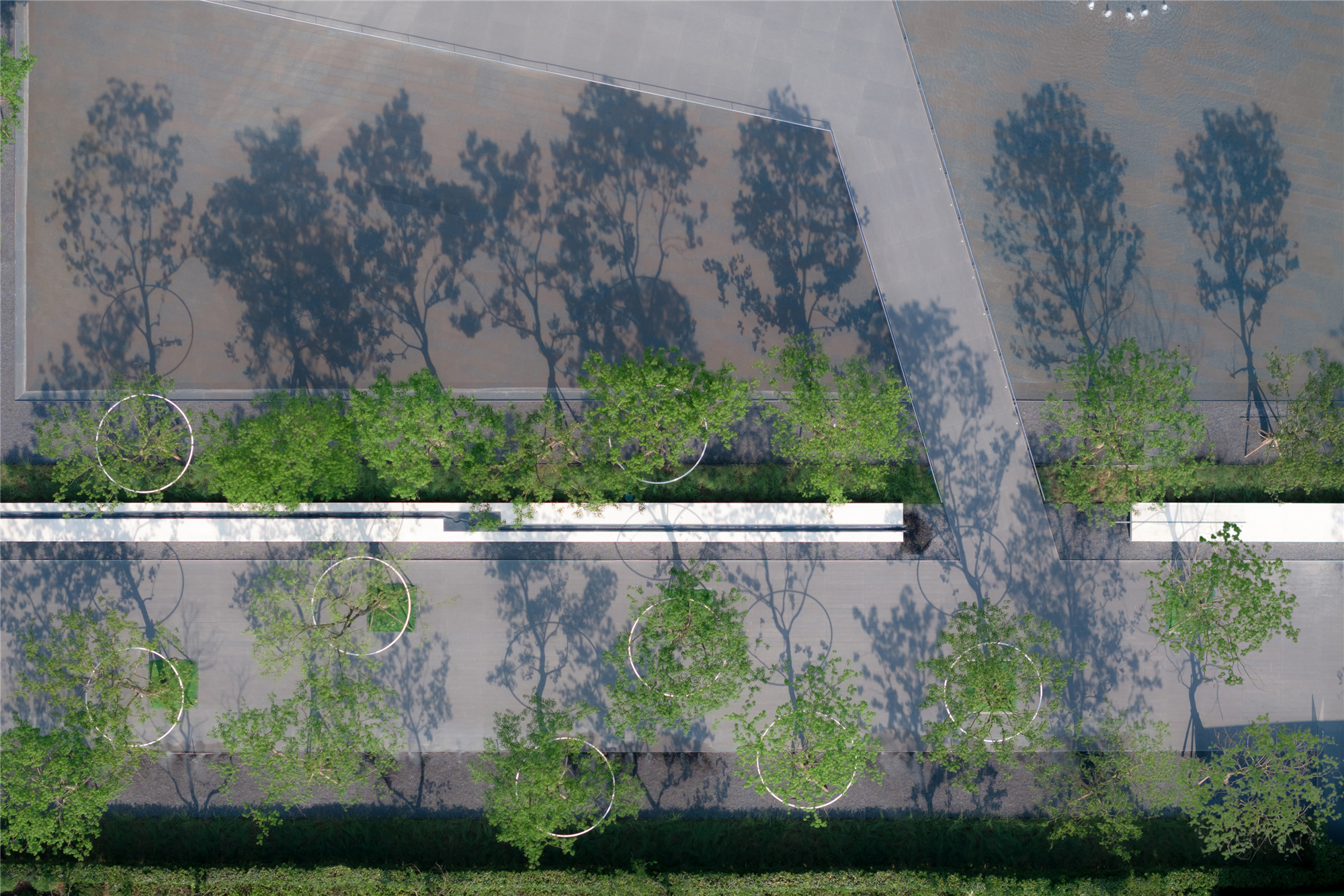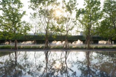These elements disrupt and reassemble the site structure, redefining it in terms of paving, color, and function. Symmetrical Chinese Tallow forests guide people into the shallow waters in front of the building. The shimmering water surface reflects the building and tree shadows, enhancing the sense of dynamism in the space.