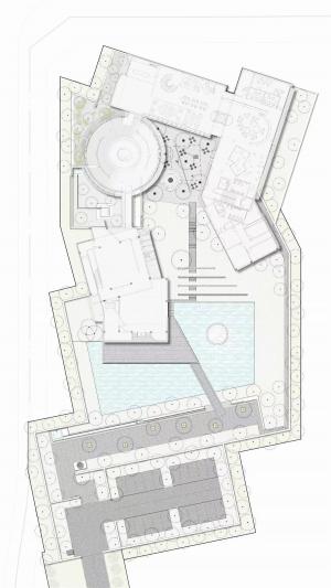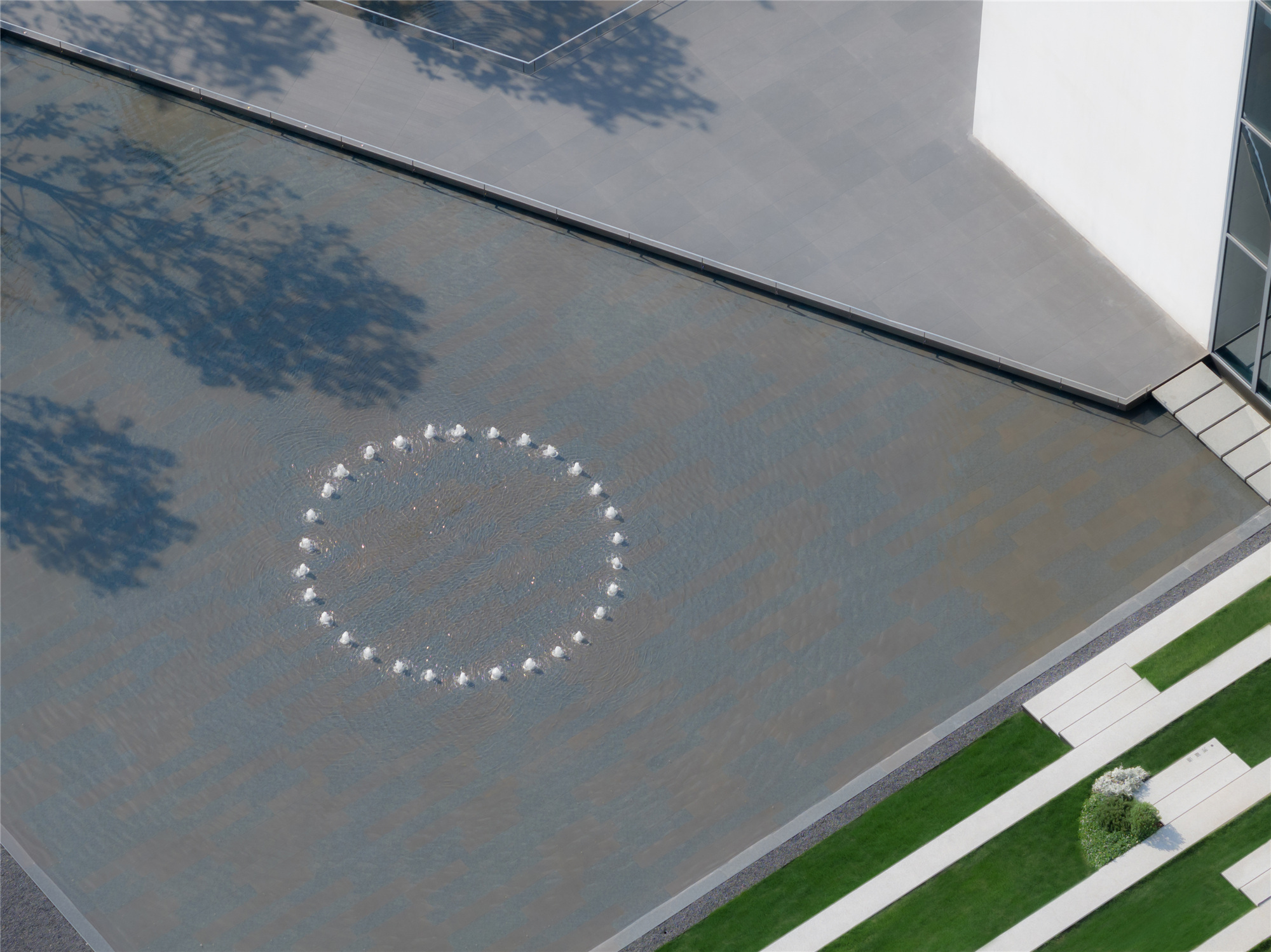 Firstly, the landscape extends the architectural form. For instance, the open forecourt is divided using an array of lines and geometric shapes like circles and squares. The scattered figures not only link up the entire forecourt but also disrupt what would otherwise be a dull and uninteresting spatial composition.
