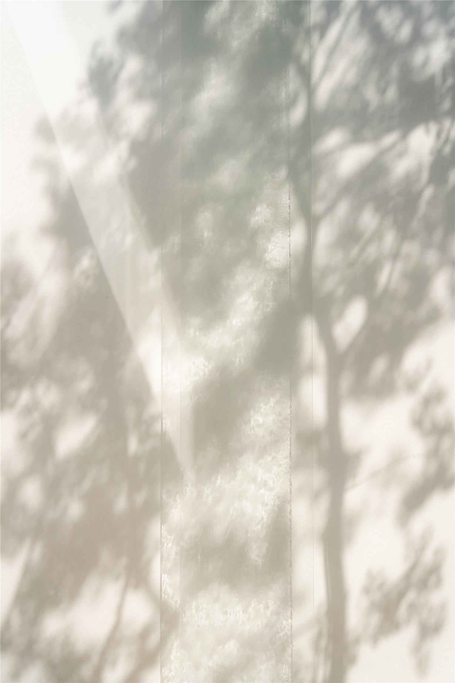 作為“戶外”的展場(chǎng),它天然的與自然萬物發(fā)生交集。自然中的水與光,樹與影等元素因此被納入其中,與干凈的建筑輪廓共同構(gòu)成極簡(jiǎn)的景觀敘事。總之,我們的設(shè)計(jì)目標(biāo)是創(chuàng)造出一個(gè)自然純凈的藝術(shù)空間。