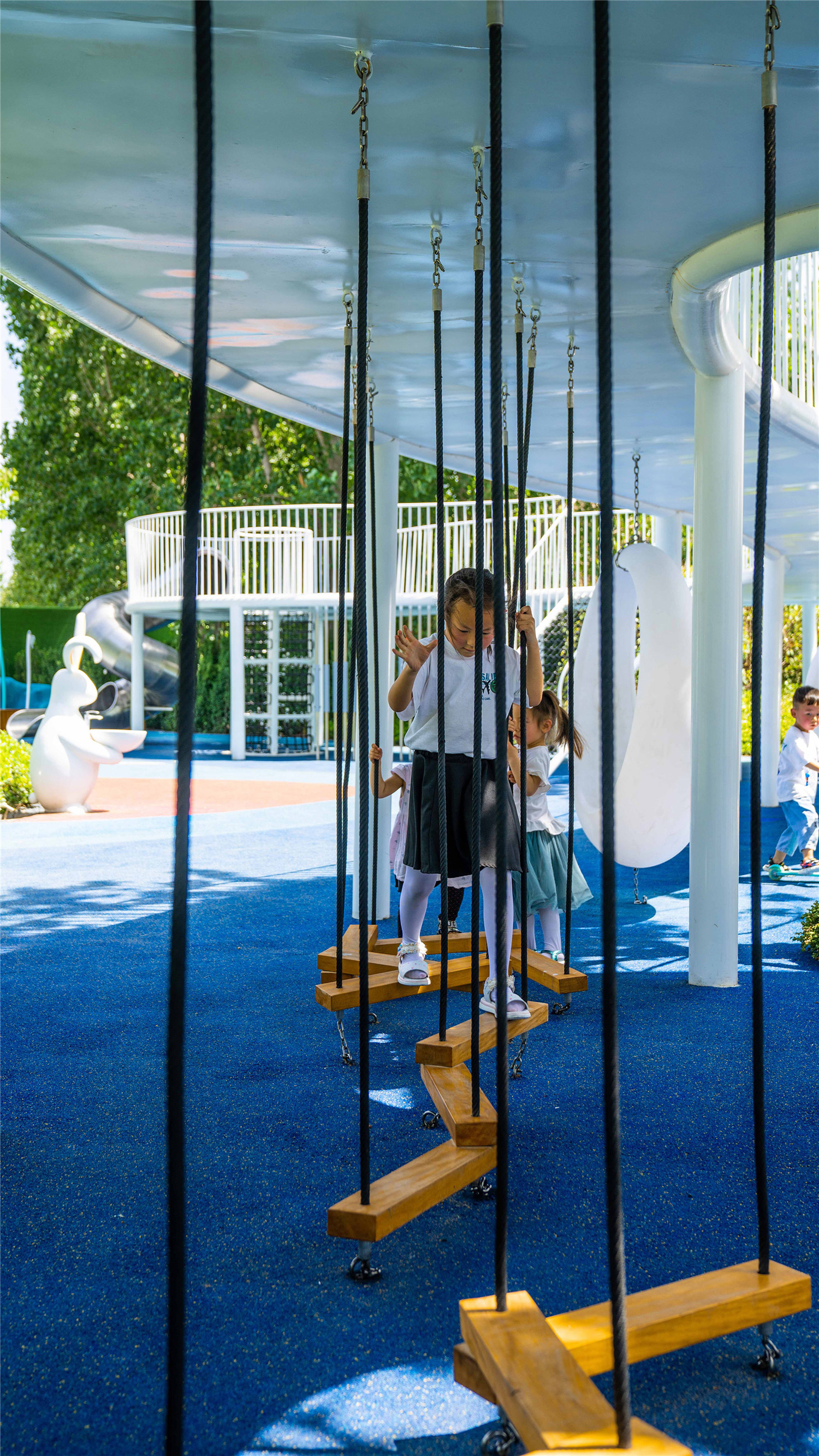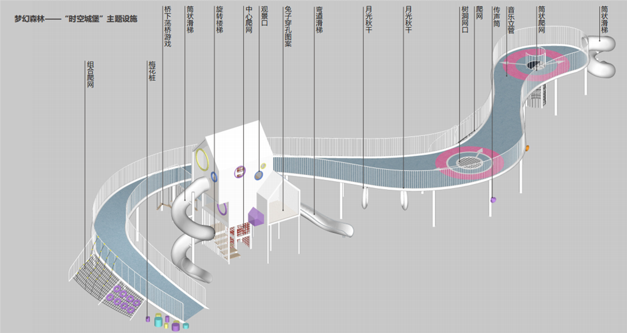 The white space-time plank road winds and extends around the space-time castle. Reproduce Alice's story scene of chasing the time machine on the space-time plank road. However, this is not an ordinary plank road. Designers integrate rich game interactive devices with the plank road. The high and low plum blossom piles, the rotating and rising combination climbing, the bright and pure moonlight swing, the tinkling music combination pipe, and the spiral end slide guide the children to explore and discover.