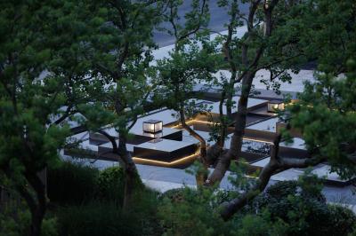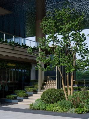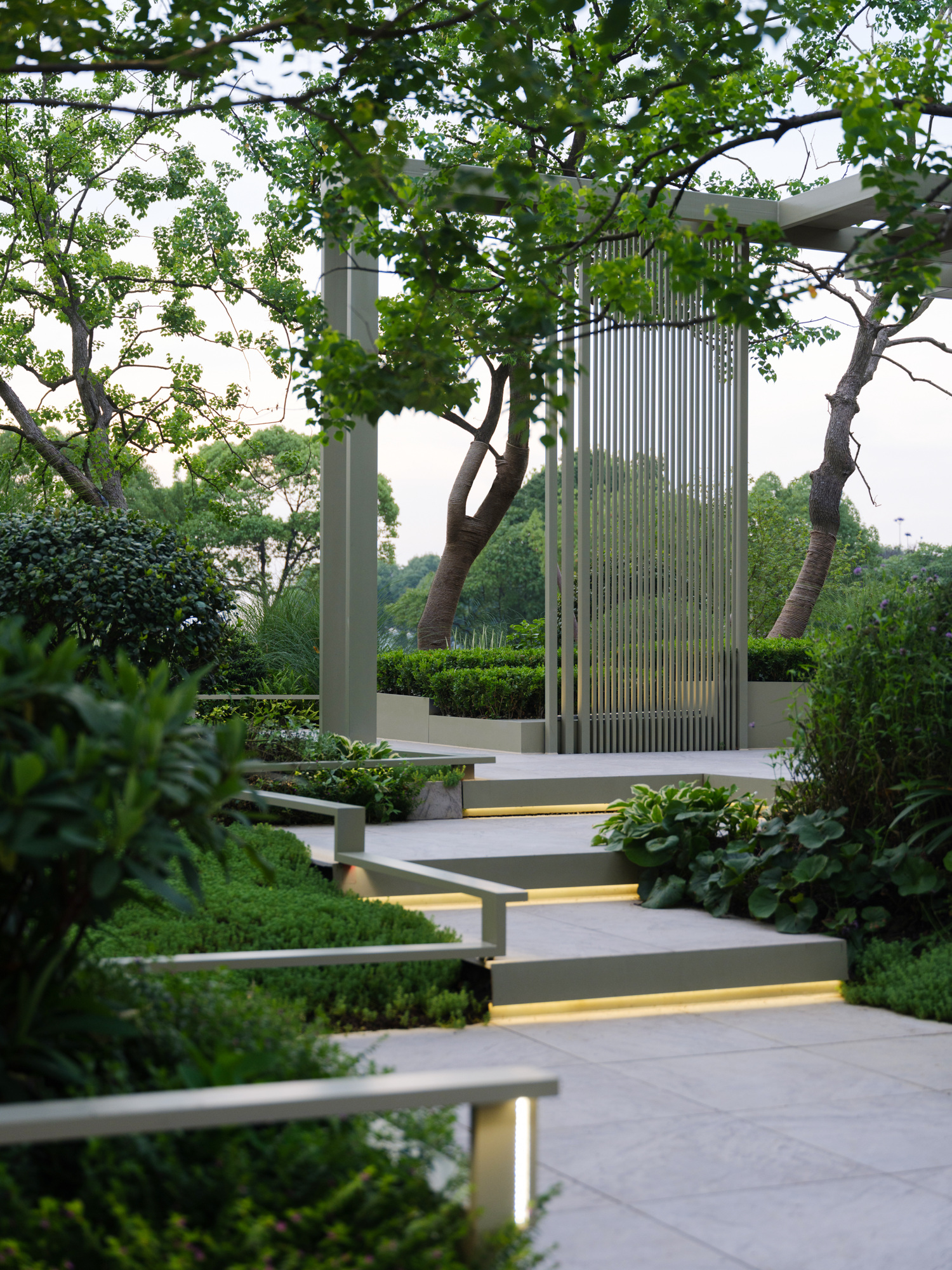 禮儀入口,景觀空間以層級(jí)錯(cuò)落的溢水平臺(tái)來(lái)作為人視點(diǎn)的第一昭示面,融合開(kāi)合有序,鱗次櫛比的植物組團(tuán),虛實(shí)之間,層層遞進(jìn),隨著線性引導(dǎo)的鋪裝形式引路向前,一種大巧若拙,大美若樸的精神轉(zhuǎn)譯為空間注腳,邂逅立體森境。