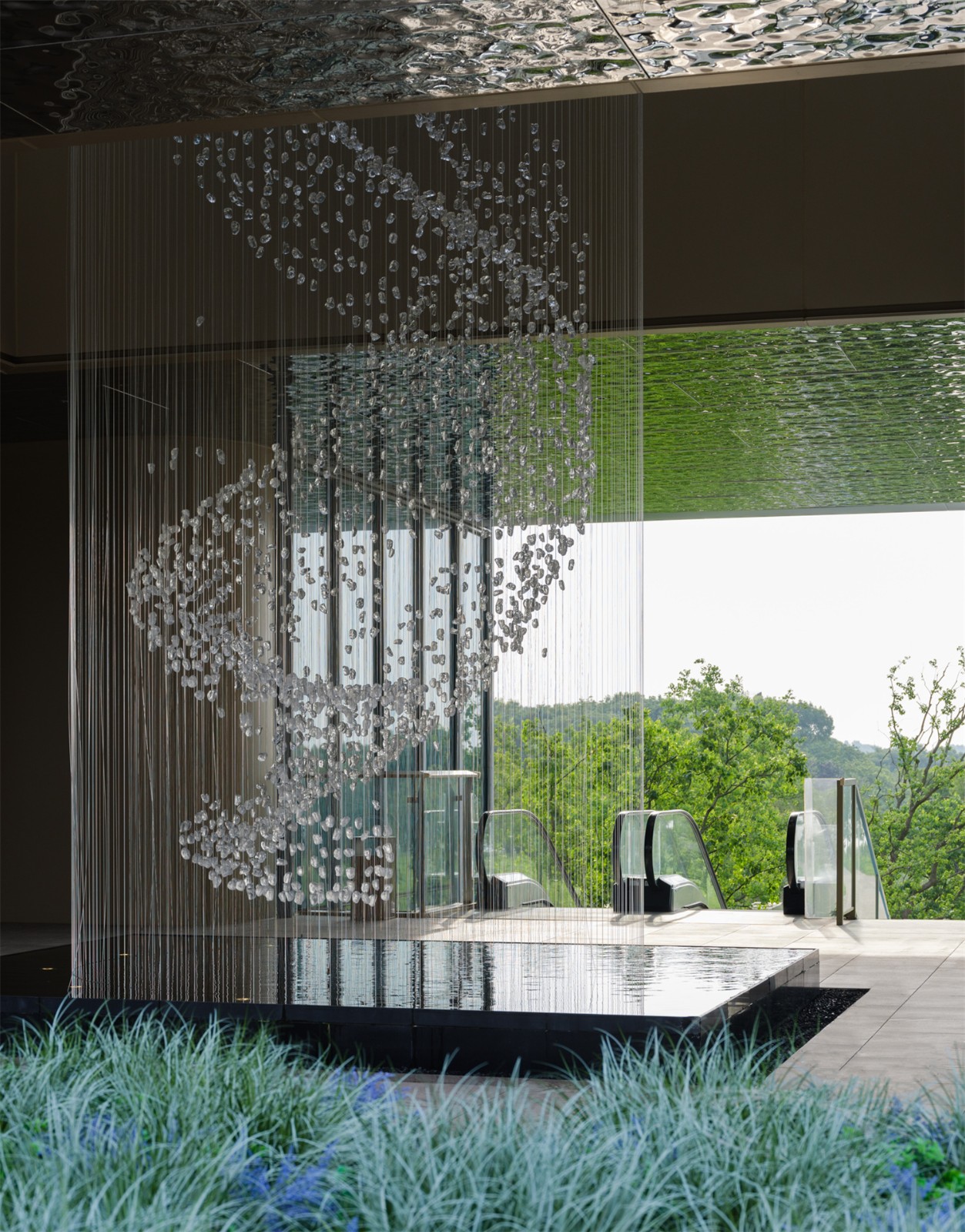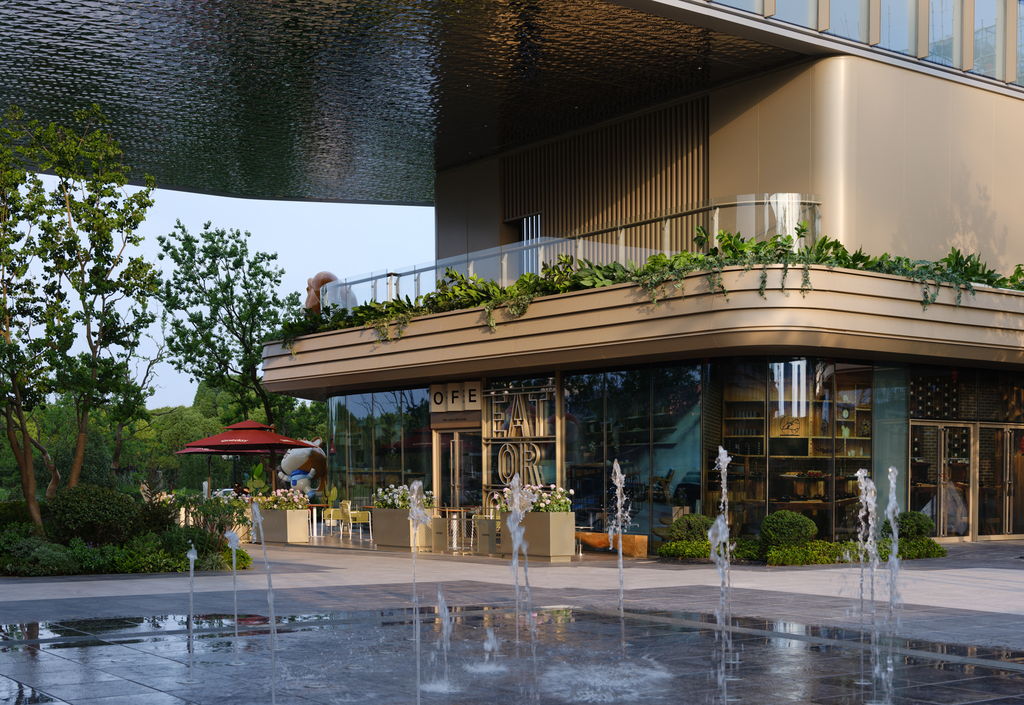 慢慢步入中庭空間,音樂(lè)響起,噴泉隨著燈光秀舞動(dòng),煥發(fā)生機(jī)。來(lái)到二樓藝術(shù)開(kāi)放空間,映入眼簾的是“螺旋新生”的藝術(shù)雕制裝置設(shè)計(jì),以輕盈柔美之姿柔化建筑的硬朗與植物生境活力共生。于浪漫間,于勃勃生機(jī)中,擁抱森林生活,與一樓的生態(tài)商業(yè)相生相伴,羽化新生。