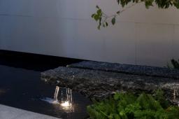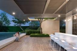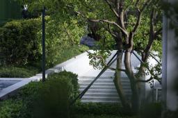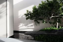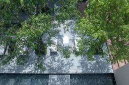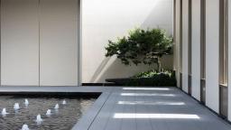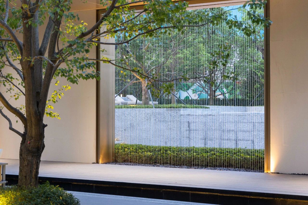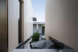 設(shè)計將林、水、光引入宅間,光影與微風交織成樂,植物與日光、水面、玻璃結(jié)合起來,形成了時刻變幻的光影之美,林泉交翠,帶水溶溶。設(shè)計以純?yōu)蹊炅譃楸尘?,不追求多維空間的厚密度種植,而是讓光影做功,讓綠植自然生長、營造干凈、簡潔、疏朗的空間效果,令人視線通達,繁而化簡,心生舒暢。