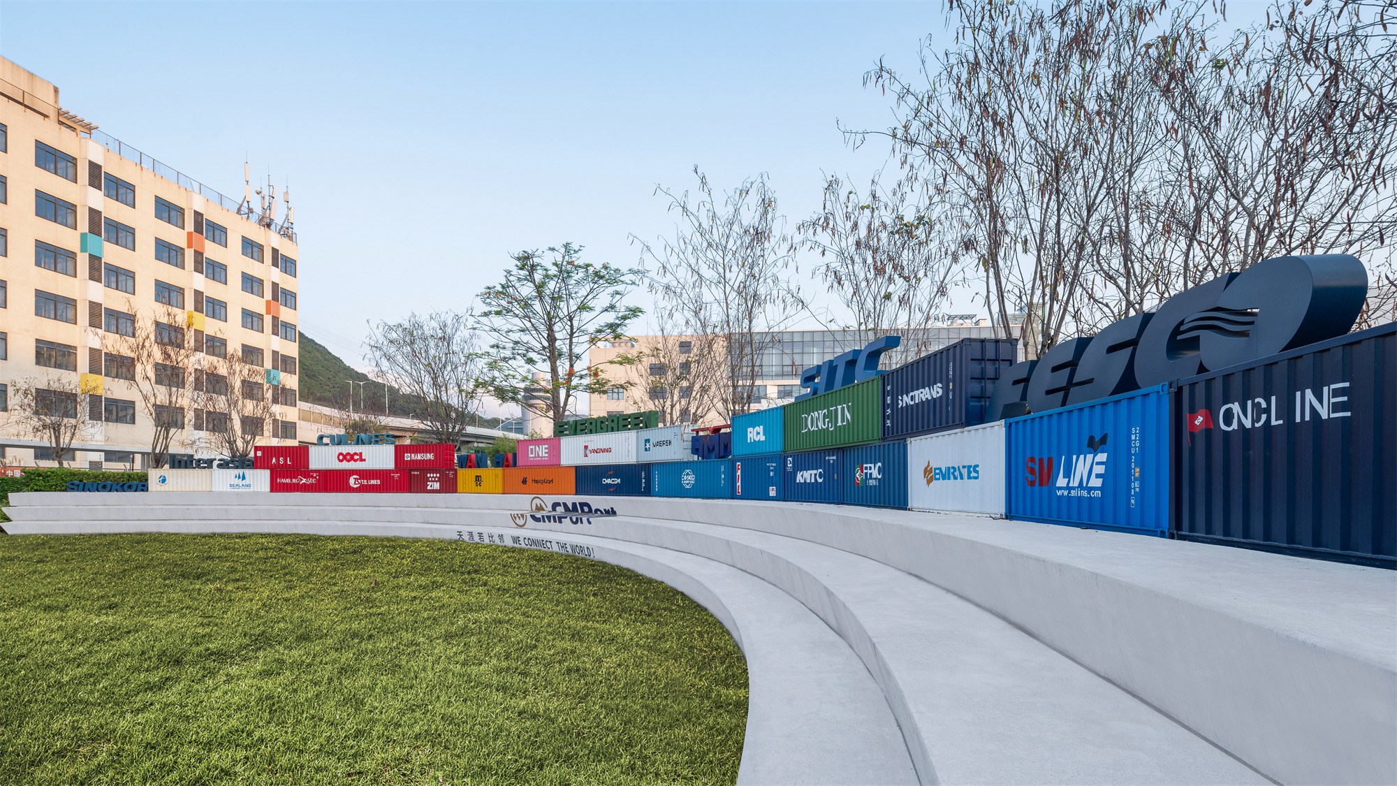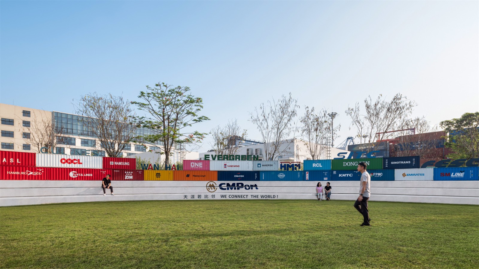 The intensive car parking arrangement leaves space for the sunshine lawn, which is the spiritual place of the park people. It is surrounded by a flat lawn with a multi-level streamlined terrace, which meets the demand for rest and leisure, and people can either sit on the terrace or enjoy the sunshine and sea breeze in the center of the lawn. On the periphery of the terrace is a wall of mini containers spray-painted with the shipping company's logo, reflecting the value concept of "inspiring newness and self-improvement, integrating and win-win" of the Ma Wan Port, and it has also become a regular stopping point for the team-building activities or visitors' photo-taking.