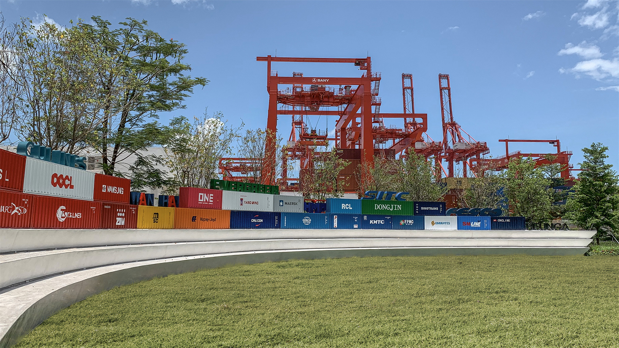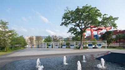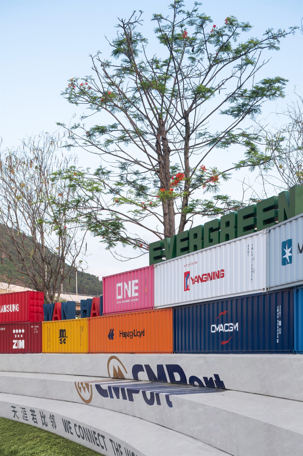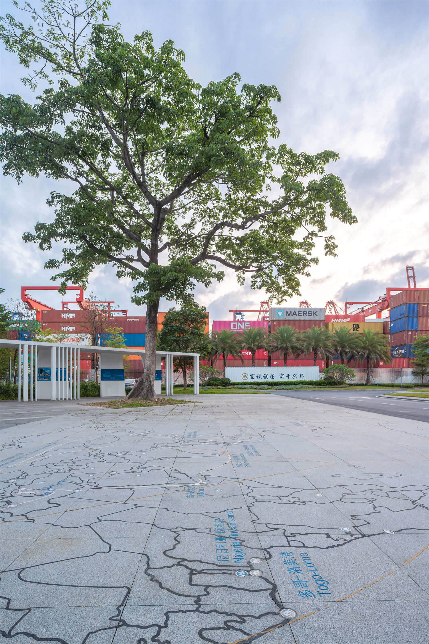The uniquely planted kapok stands up like a hero, and the ground is engraved with the port's global network map, which is both the business map of China Merchants Port and the dream of China Merchants Port. The culture wall takes the port container as the background, and the wall continues the vertical texture of the container, reflecting the industrial characteristics. The inscription on the wall reads "Empty talk is misleading to the country, practical work will build up the country", which is the best illustration for the struggle history of China Merchants Group in the past hundred years. The sea breeze passes through the Phoenix sylvestris’ forest, and the ships are weaving like the heartbeat of the times, knocking out a strong and unceasing sound.