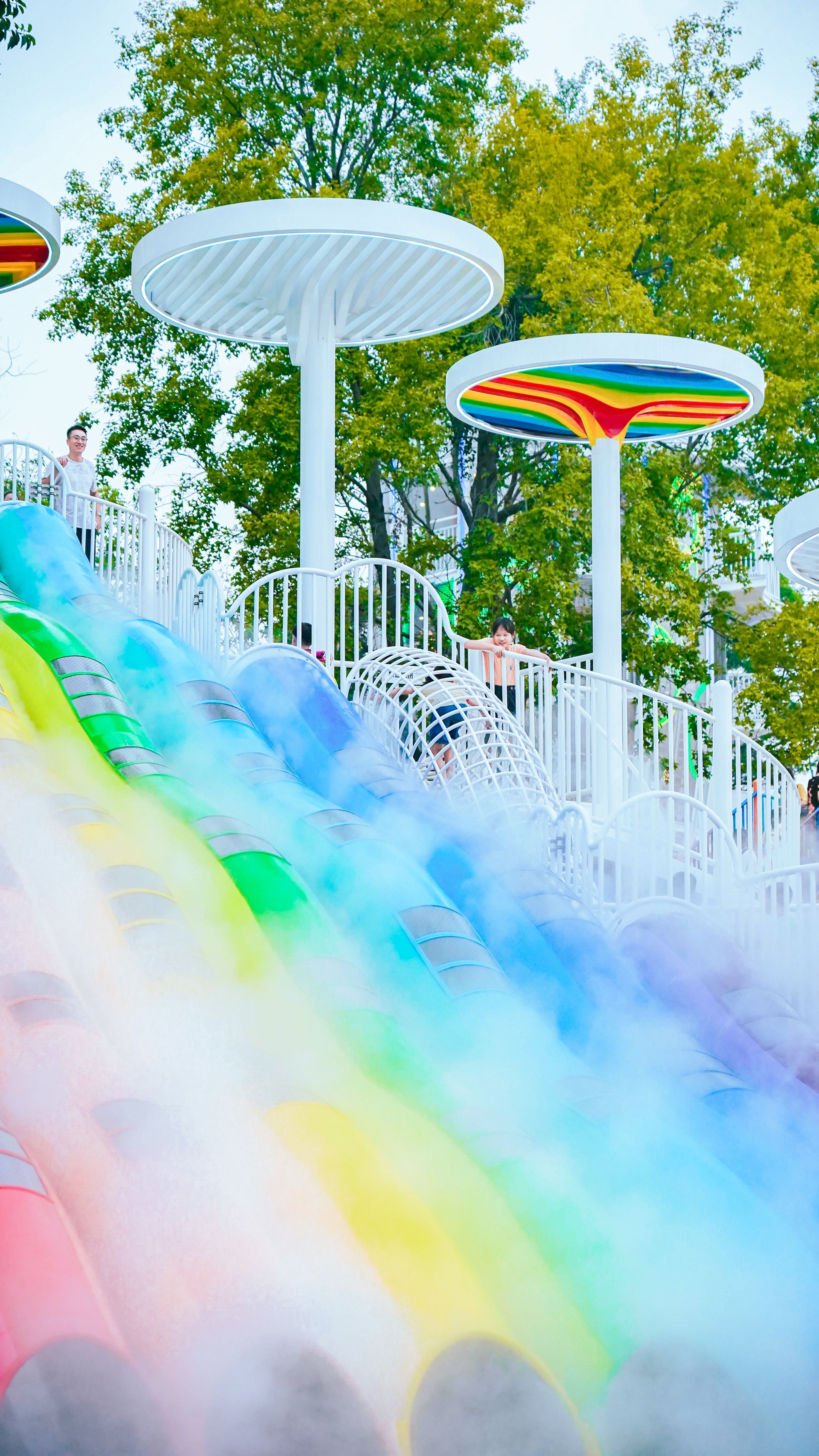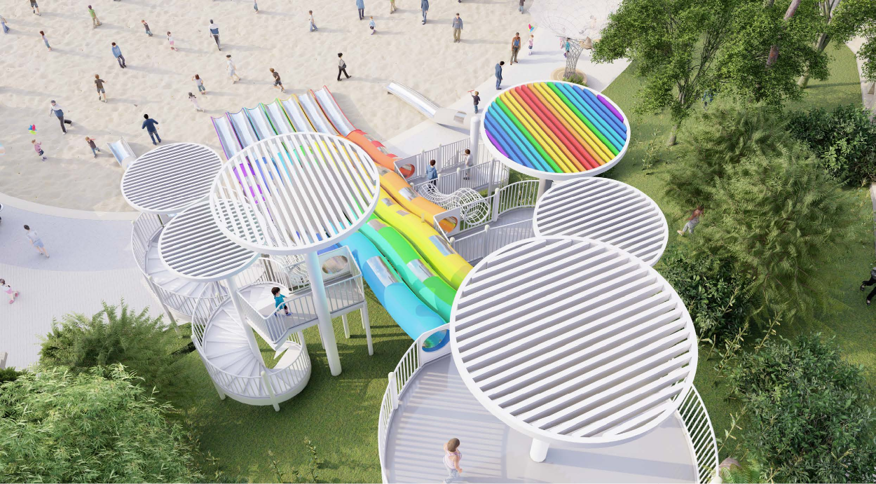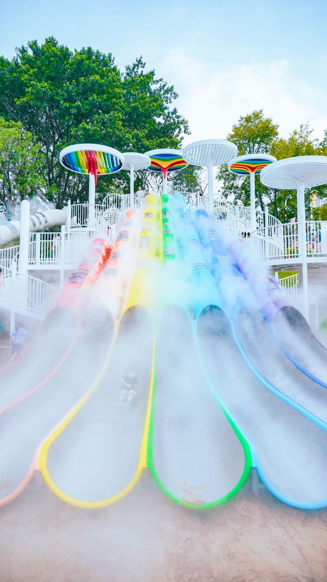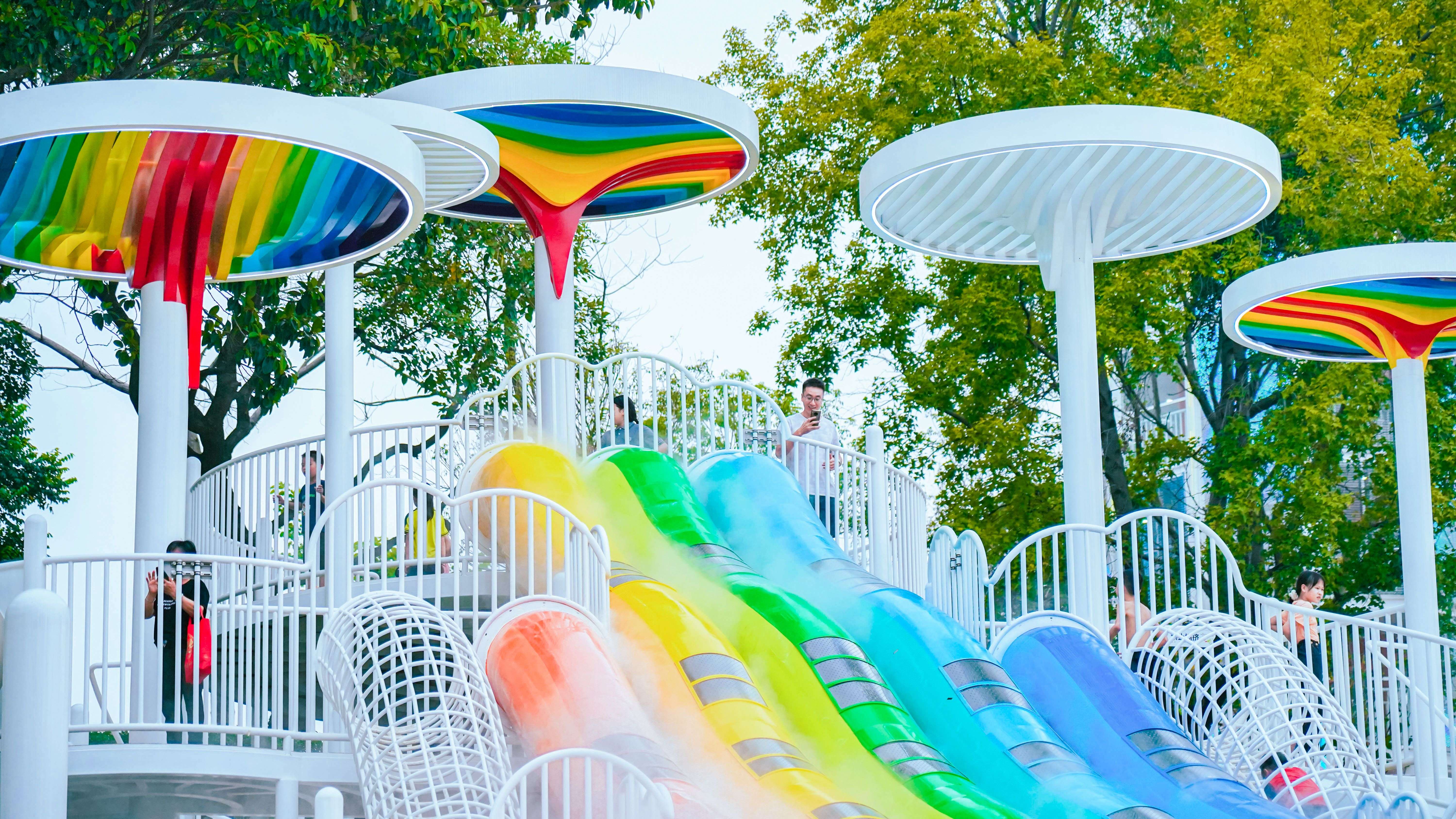 公園集合了各類滑梯、爬網(wǎng)、蹦床、戲水池、沙池、索道等功能的設(shè)計,21米長的彩虹滑滑梯、2000㎡的戲水池、可以同時容納20人的大蹦床,突破成人和兒童空間獨(dú)立的壁壘,創(chuàng)造出更多親子互動和社交兼容的可能性,賦予場地新的發(fā)展機(jī)遇。