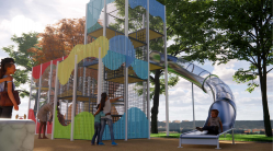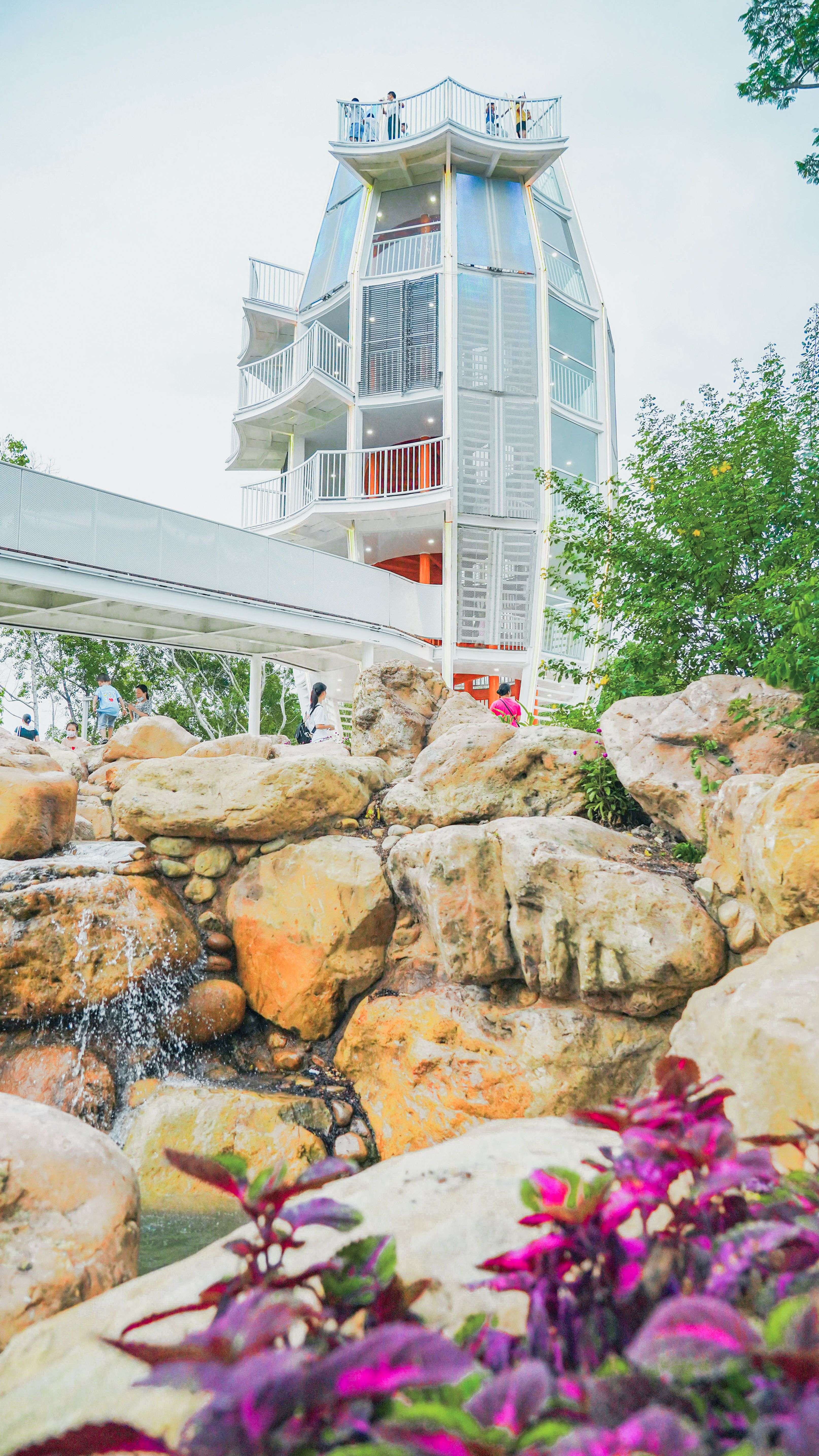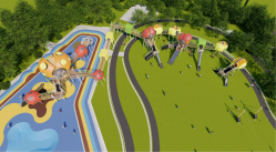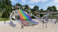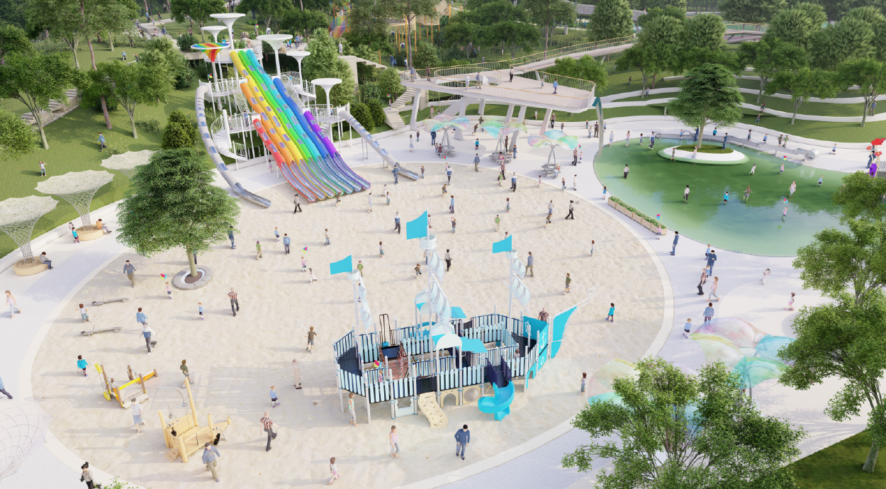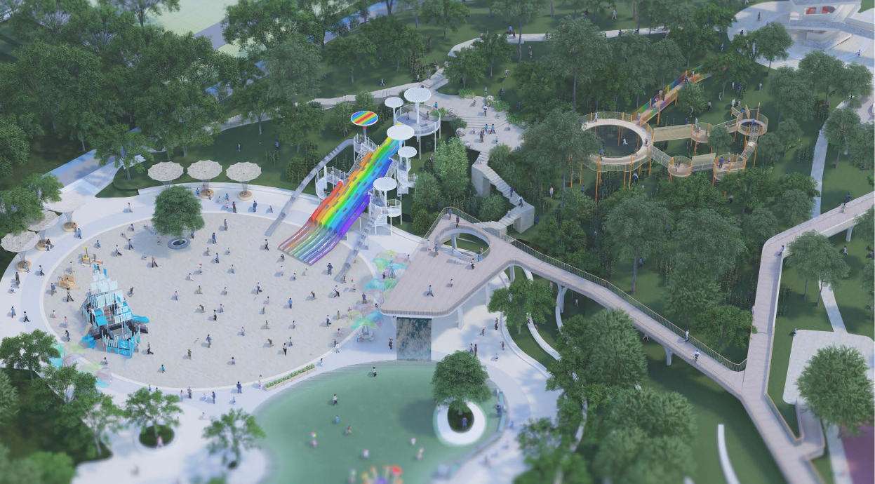 公園集合了各類滑梯、爬網(wǎng)、蹦床、戲水池、沙池、索道等功能的設(shè)計,21米長的彩虹滑滑梯、2000㎡的戲水池、可以同時容納20人的大蹦床,突破成人和兒童空間獨(dú)立的壁壘,創(chuàng)造出更多親子互動和社交兼容的可能性,賦予場地新的發(fā)展機(jī)遇。