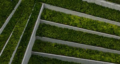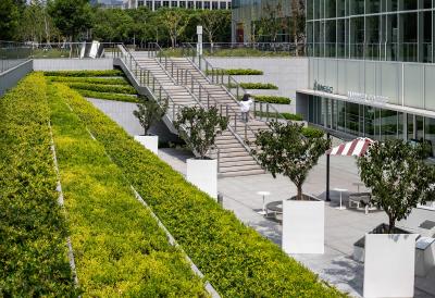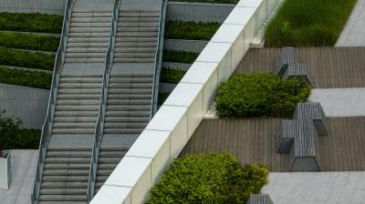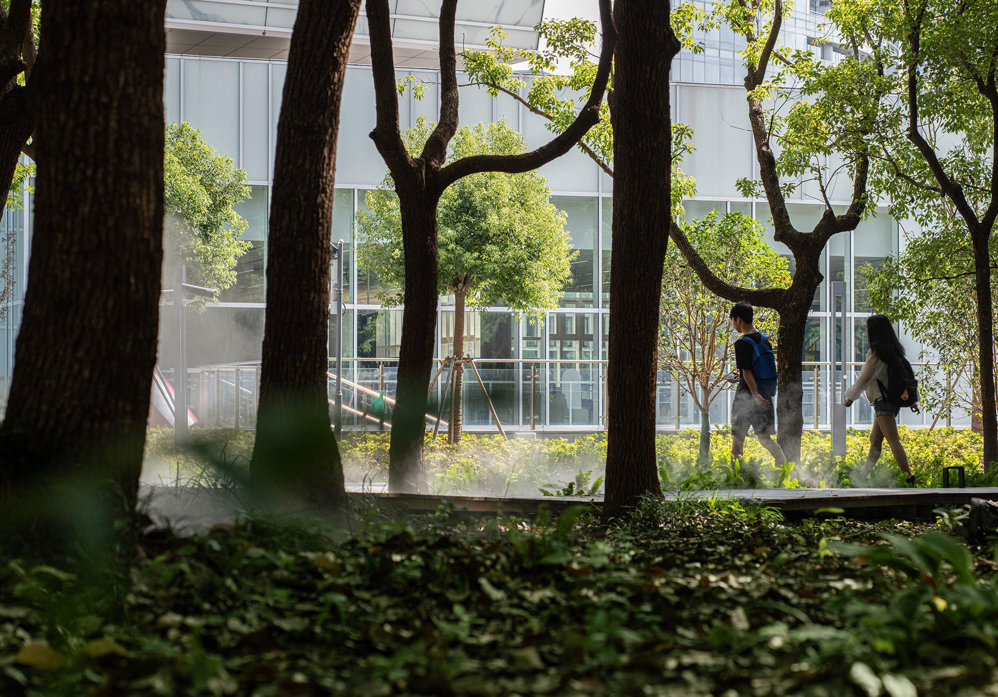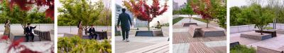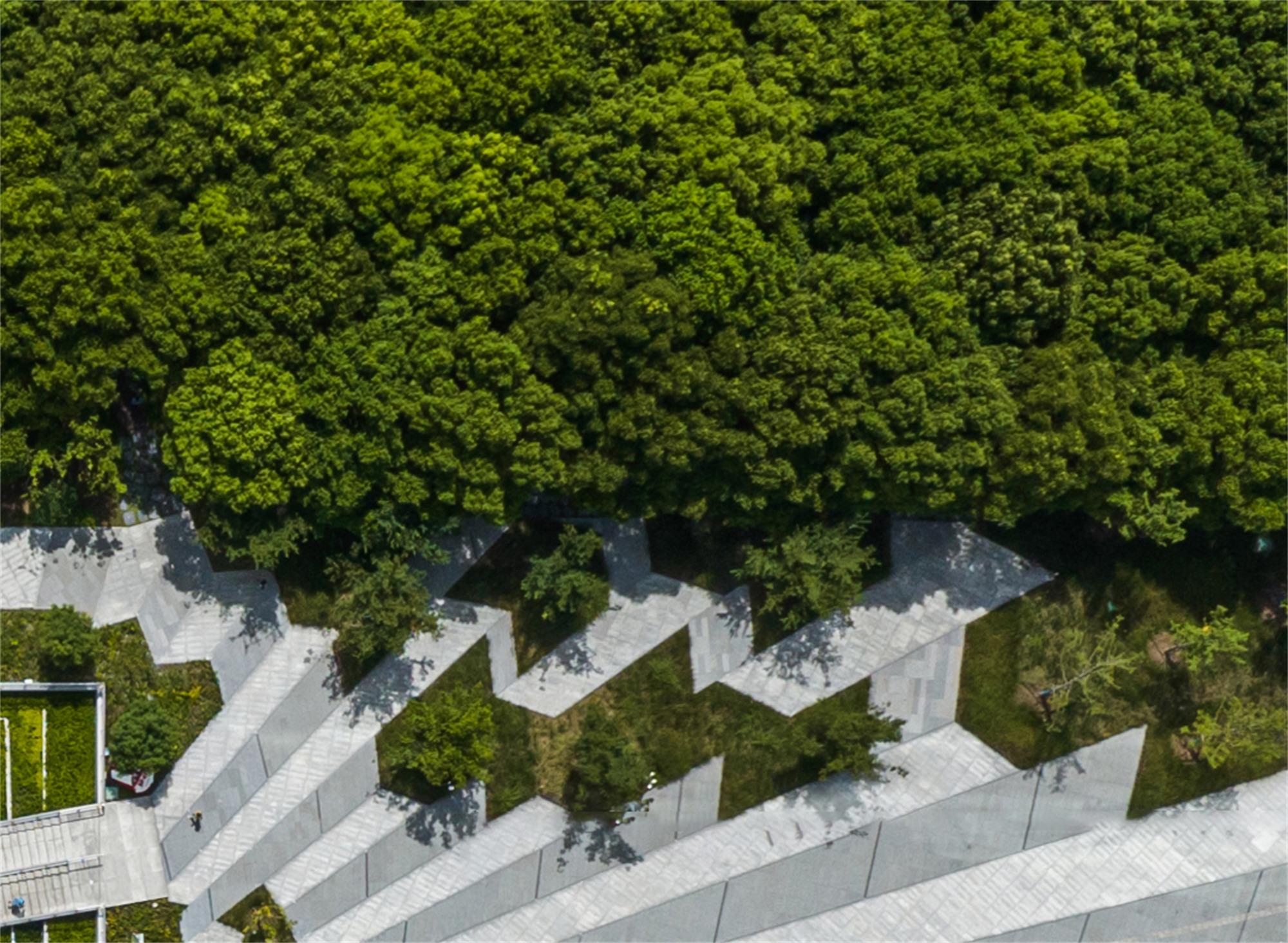 下沉廣場(chǎng)意在營(yíng)造一個(gè)安靜閑適的氛圍空間,容納輕松的社交活動(dòng)、輕餐飲和較親密的小型互動(dòng)。設(shè)計(jì)師以“曲轉(zhuǎn)空間”為設(shè)計(jì)手法,以層次錯(cuò)落盤轉(zhuǎn)向上的植被臺(tái)地打破原本沉悶的垂直擋墻,讓更多的自然光滲透進(jìn)來(lái),優(yōu)美的林冠映照在更低層的地面上,為漫步其中的人們提供多維、綠意環(huán)繞的空間體驗(yàn)。