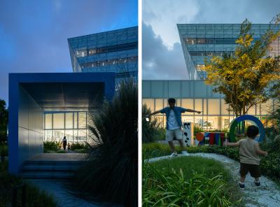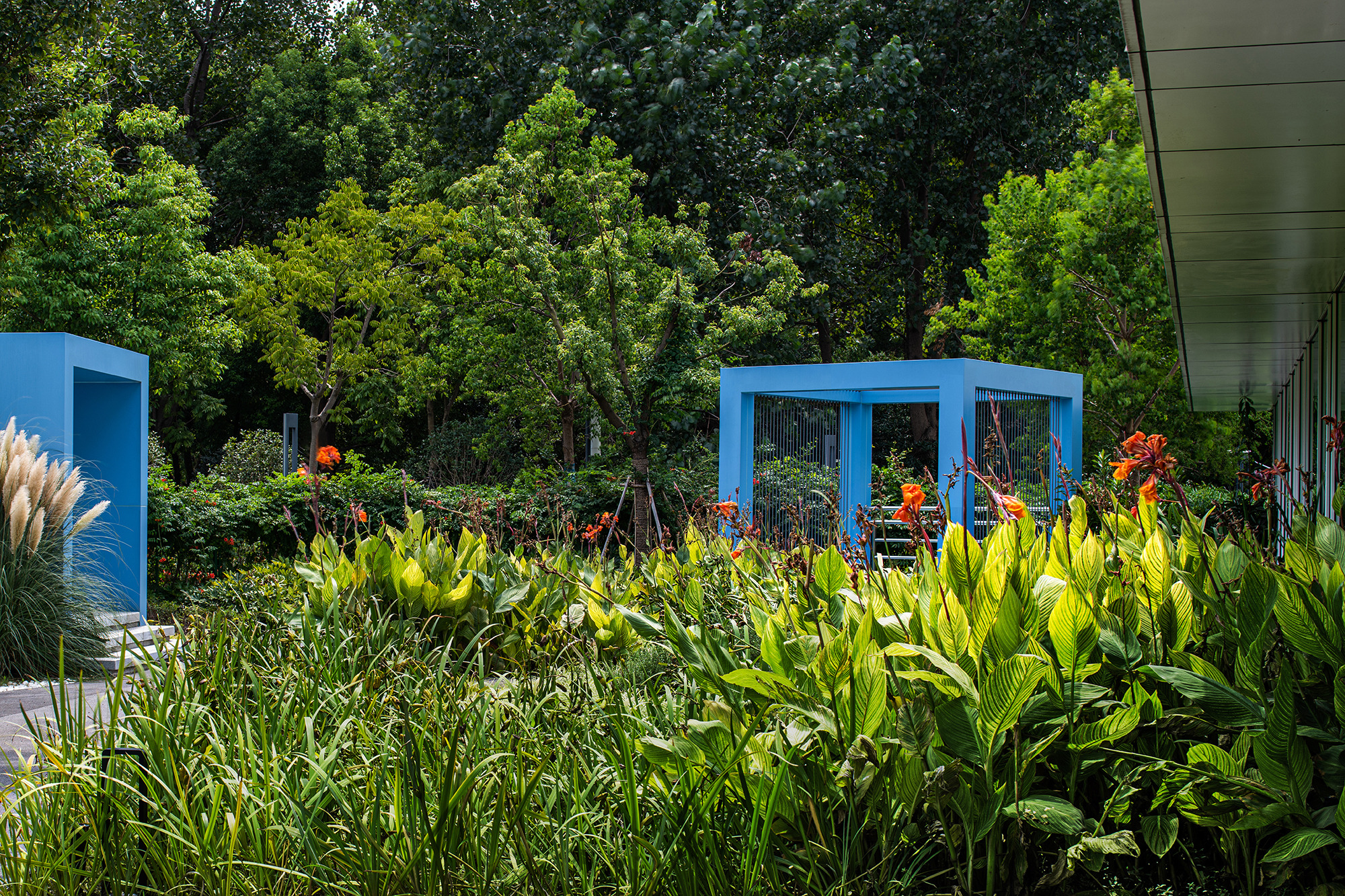 在兒童游樂(lè)空間的設(shè)計(jì)中,ASPECT的設(shè)計(jì)師們以“親生物環(huán)境”為主旨,將室內(nèi)兒童圖書(shū)區(qū)域向室外延伸。雨水花園激發(fā)了小朋友們的感官與探索的好奇心,而色彩繽紛的“學(xué)習(xí)艙”則擴(kuò)大了戶外教學(xué)和閱讀空間,并形成了一條通往林蔭的自然小徑。