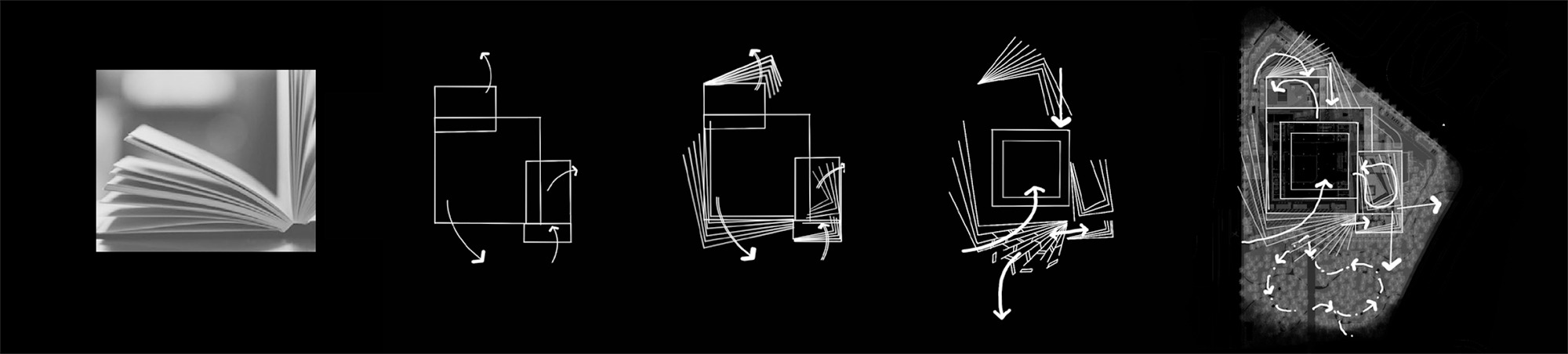 為了提升人在綠色空間中的體驗(yàn)感,我們對(duì)每個(gè)空間對(duì)進(jìn)行了慎重的考慮和細(xì)節(jié)的處理,希望將人與戶外環(huán)境進(jìn)行空間和視覺(jué)上的鏈接,將閱讀體驗(yàn)延伸到室外空間。場(chǎng)地的邊緣和立面經(jīng)過(guò)折疊、轉(zhuǎn)合和分層等設(shè)計(jì)手法,將建筑與地面連接起來(lái),就像書(shū)頁(yè)一樣躍然在大地上。起伏的木質(zhì)小品與中國(guó)傳統(tǒng)的“竹簡(jiǎn)”元素遙相呼應(yīng),成為城市居民會(huì)面、休憩或集會(huì)的目的地。