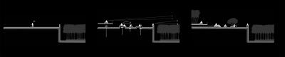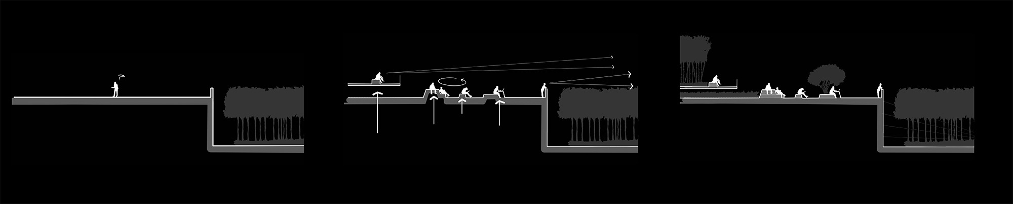其中,到達(dá)廣場(chǎng)是可滿足大型市民集會(huì)和慶典的場(chǎng)所,也是通往城市內(nèi)部的主要人行通道。在廣場(chǎng)的邊緣,一系列互相連通的雨水花園嵌入林地中,層次豐富的植被空間形成了引人入勝林間秘境,同時(shí)這也是通往林蔭人行道的入口。