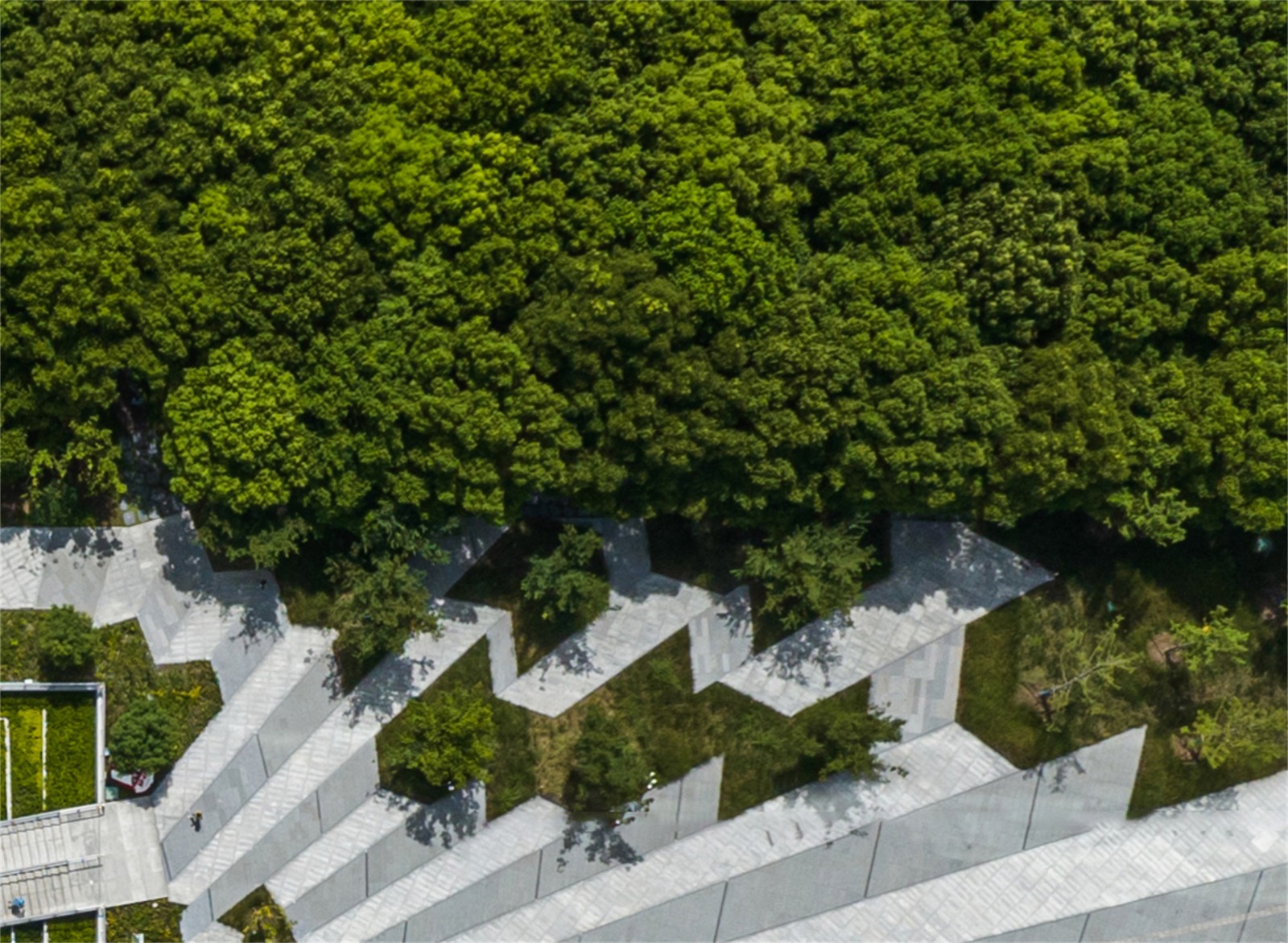 在這里,場(chǎng)地空間與自然親密聯(lián)系,自然綠色環(huán)境帶來(lái)多重體驗(yàn),無(wú)論是功能上還是環(huán)境上都將圖書(shū)館和周邊環(huán)境融為一體,與緊鄰的世紀(jì)公園連接呼應(yīng) 。