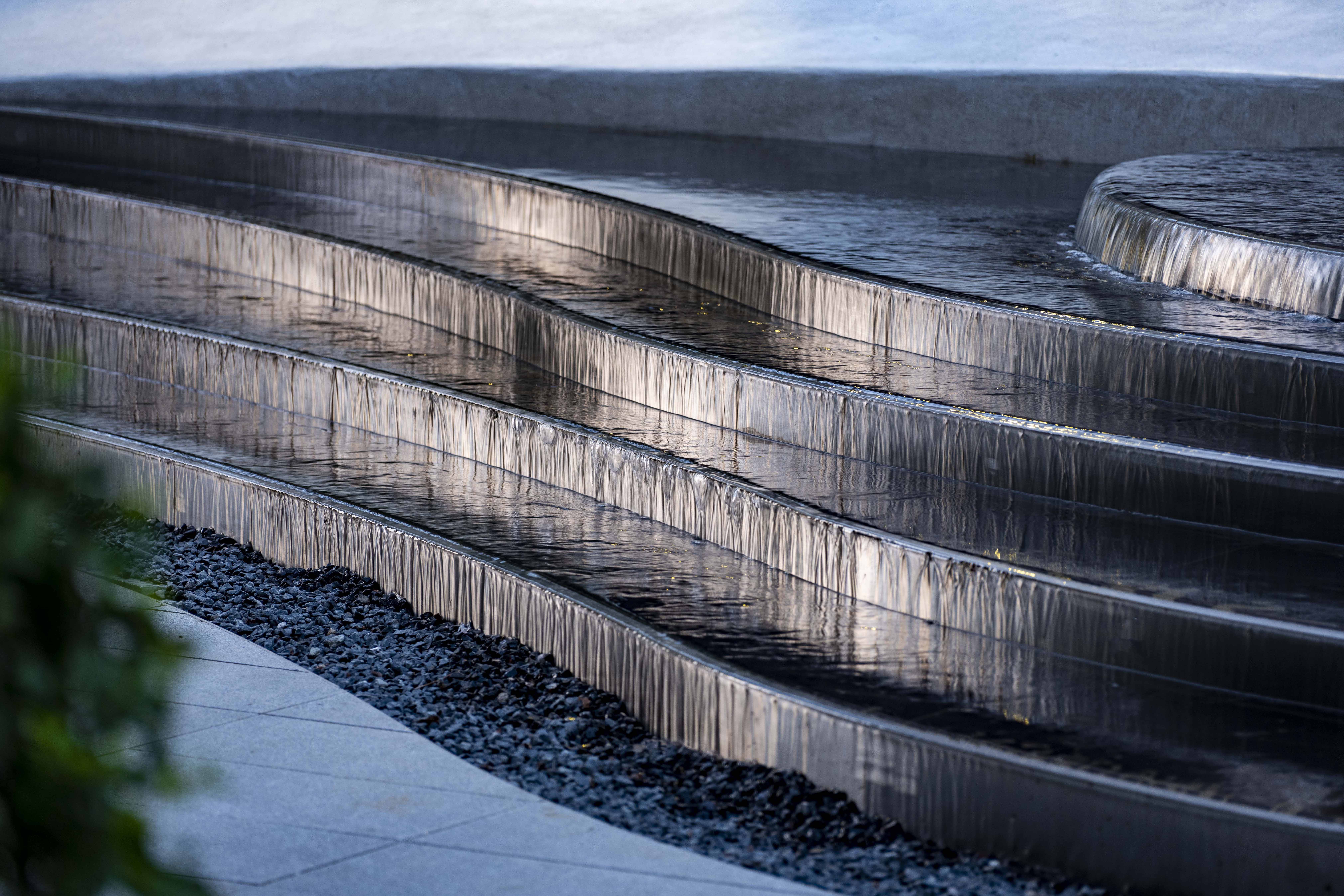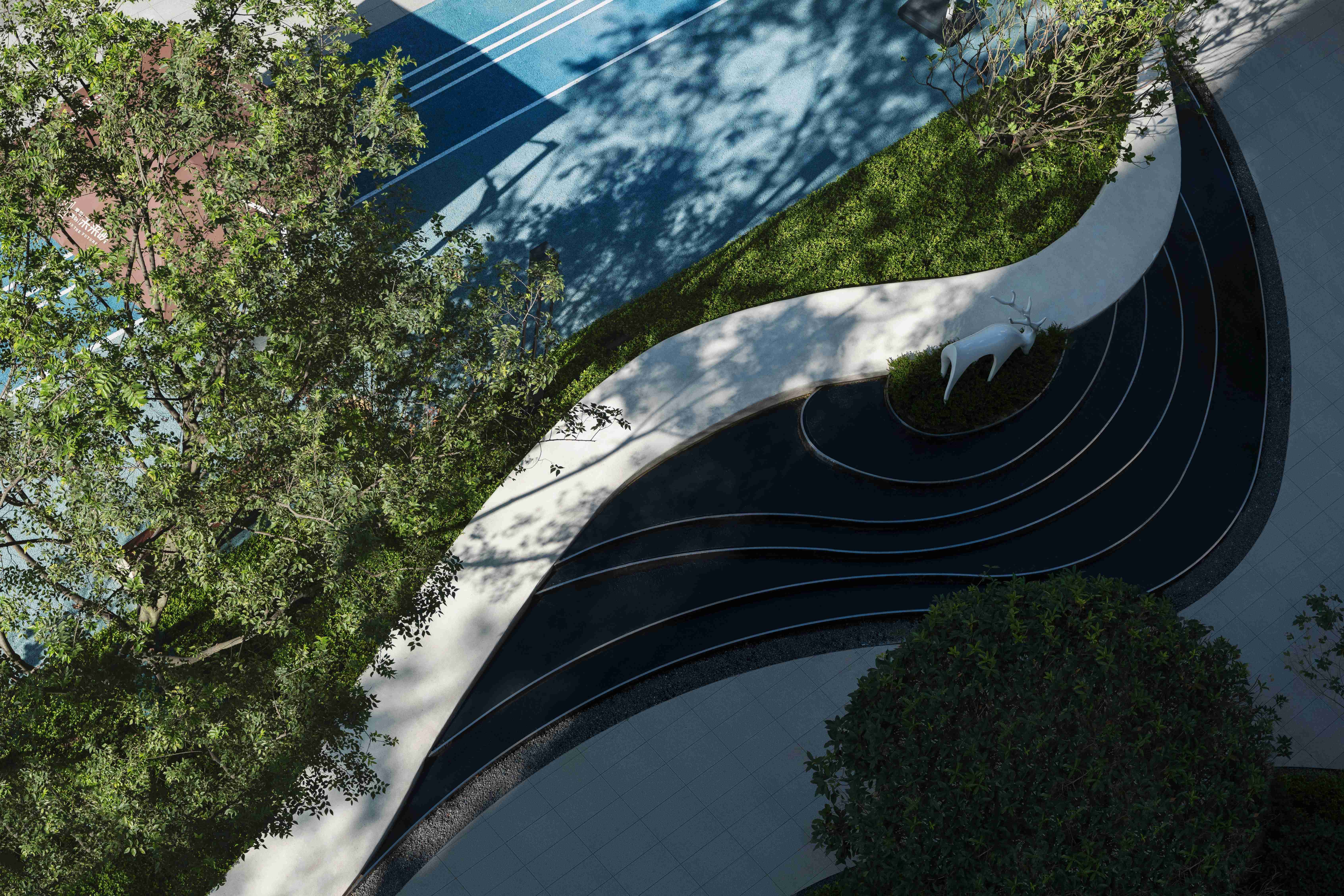 Entering the interior space, the elk sculpture and the textured water feature come into view. Smooth lines combined with hierarchical green plants create an open and grand site temperament. The combination of black gravel, imitation stone brick, terrazzo and other paving materials highlights the calm and deep sense in the contrast. With the pool water and the rich shrubs and vegetation in the four seasons, the visual experience of rich levels is formed, which leaves a deep impression on the residents at the beginning.