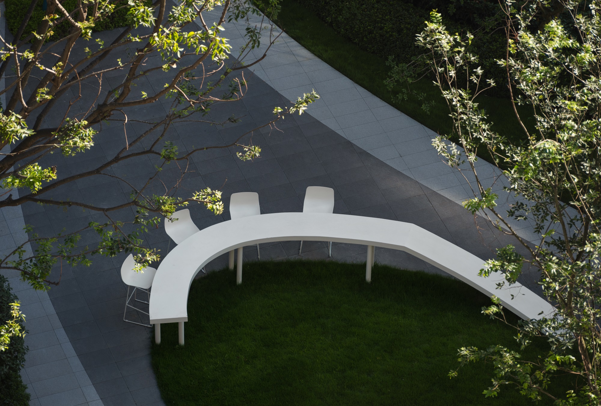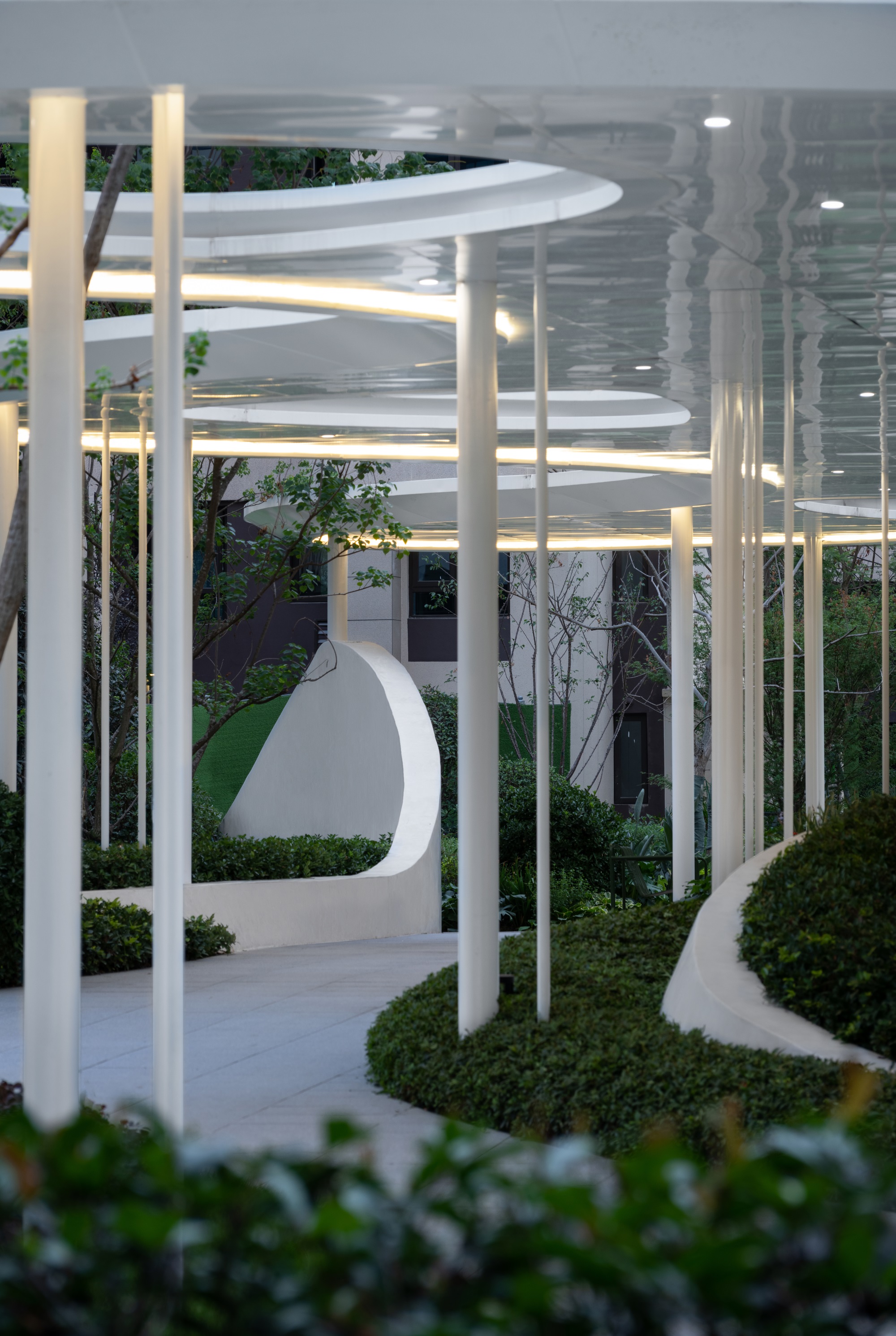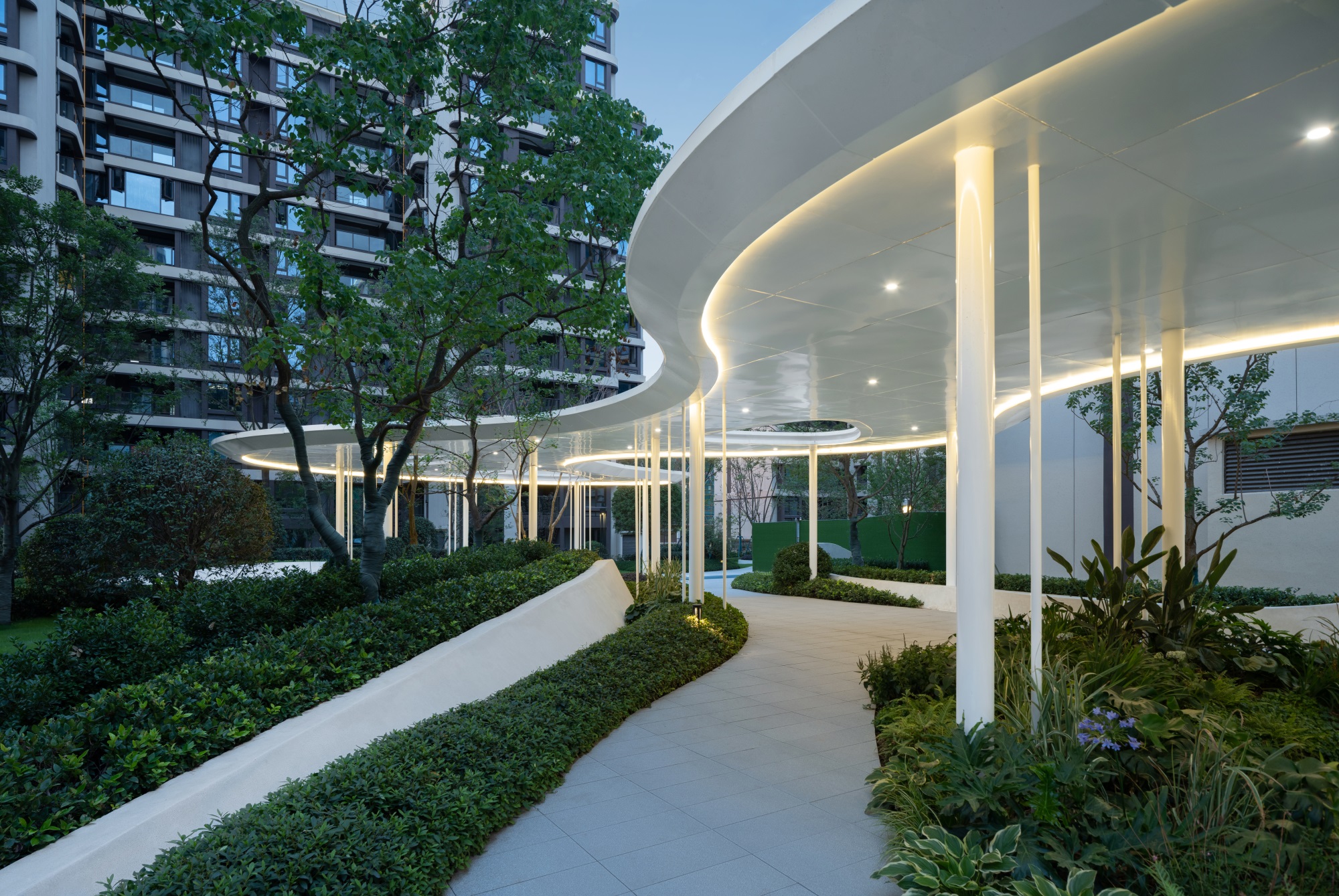 In the leisure meeting space of about 620 square meters, the large streamline landscape corridor and the curved landscape wall are combined to create a semi-enclosed sunshine ecological community outdoor meeting room, elegant, comfortable, quiet and comfortable. Under the limited spatial scale, through the opening and closing of the landscape, the transformation and inheritance of the scene, the characteristics of the site are maximized from the visual and spiritual level, and a more modern artistic and poetic space is created.