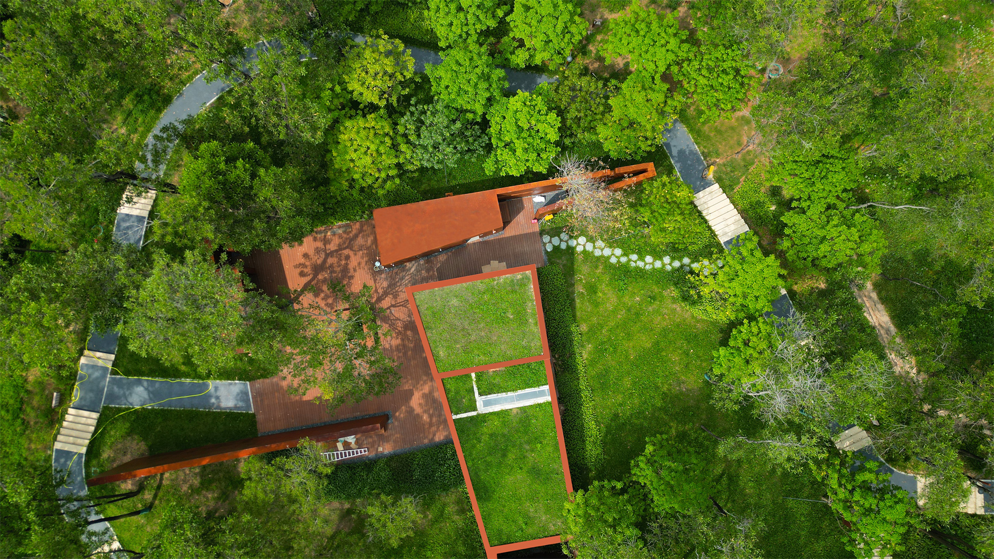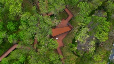 依山就勢(shì),扶搖而上,一條安靜悠遠(yuǎn),貫穿于場(chǎng)地的木棧道赫然可見,棧道隨地勢(shì)起伏,穿林而過,引導(dǎo)訪客穿梭于山林之中。景觀深度踐行“無痕山林”的生態(tài)可持續(xù)設(shè)計(jì)理念,以輕介入的手法,打造人與自然共生的詩意走廊。
