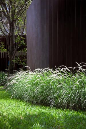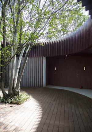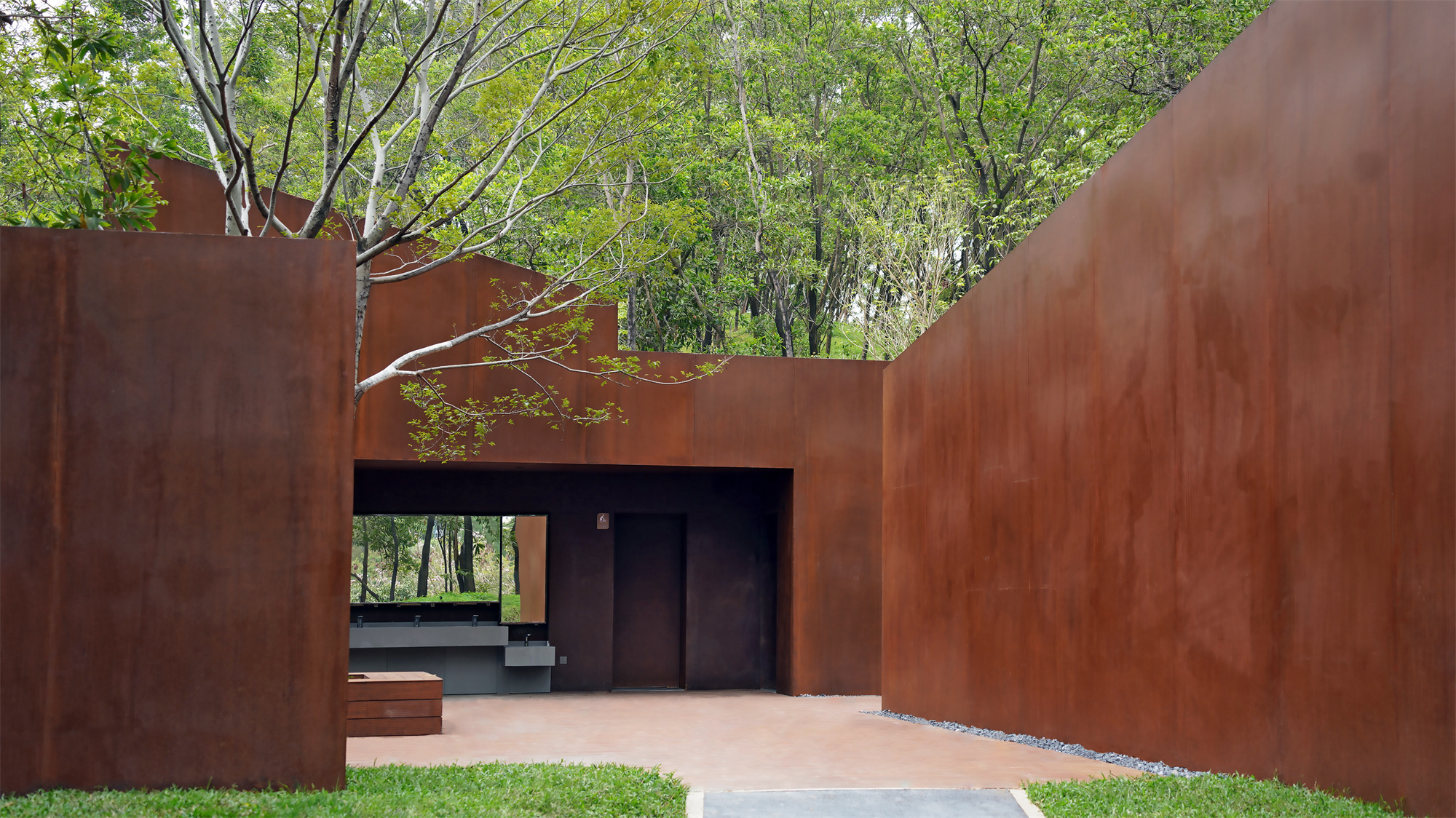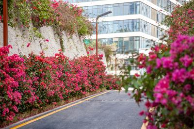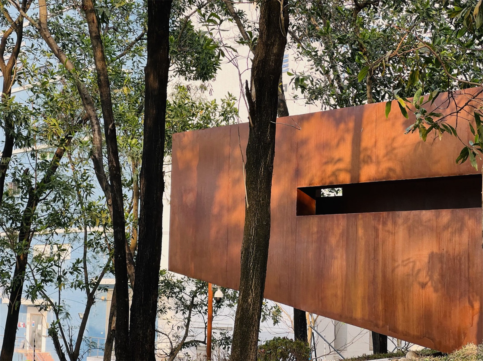 行至主入口,遠(yuǎn)遠(yuǎn)望見高大挺拔的樸樹懸于半坡之上,自由伸展,仿佛以一種邀請(qǐng)的姿態(tài),引導(dǎo)人們進(jìn)入。簡(jiǎn)約的LOGO與高低起伏、前后錯(cuò)落的耐候鋼板造型花池相互映襯,遠(yuǎn)處的背景林和粉花風(fēng)鈴木、紫荊花矩陣形成交織,象征著自然與人文的融合。