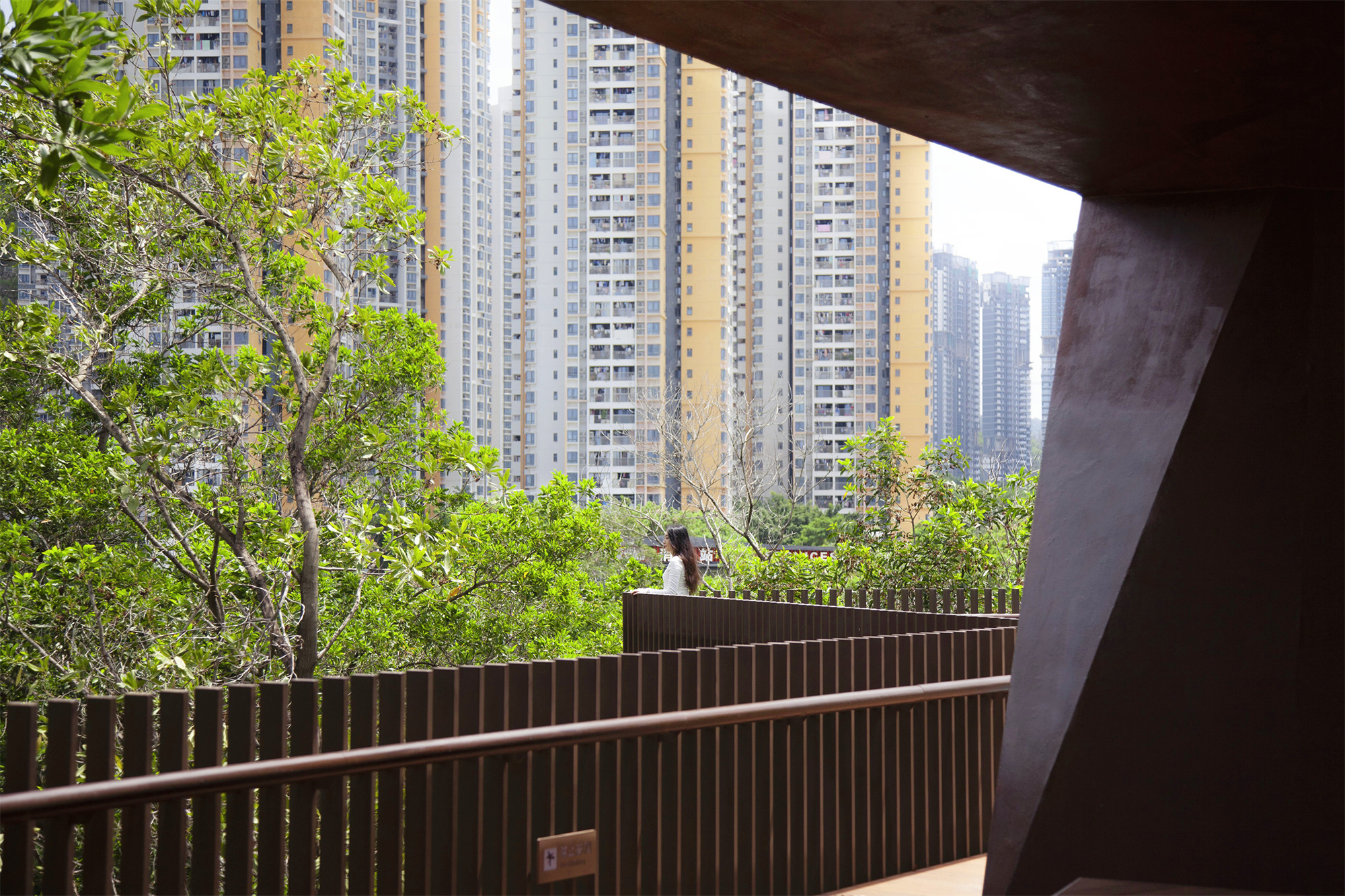 輕盈的連廊是自然的取景器,是相框,它懸浮于空中,又融于蔥蘢密集的樹冠群里,踏足于棧道之上的你與我,我與景,是看與被看的關(guān)系,停駐、放空,享受自然的療愈。