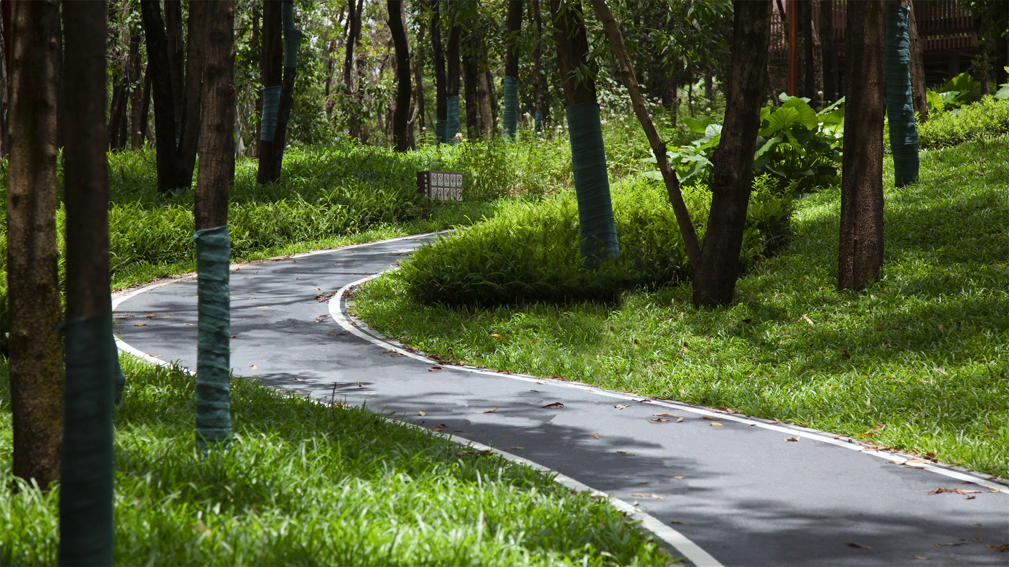 項(xiàng)目以“不砍一棵樹,不破一方土”為原則,最大限度尊重自然山體與現(xiàn)狀2600余棵喬木。設(shè)計(jì)前期多次現(xiàn)場(chǎng)踏勘,根據(jù)現(xiàn)有喬木點(diǎn)位調(diào)整園路走向,建立一樹一檔信息。通過現(xiàn)場(chǎng)放線、復(fù)尺避開10公分以上的大樹,遇山則繞,遇險(xiǎn)則架空,設(shè)計(jì)師在圖紙上一點(diǎn)一滴,反復(fù)推敲,最后經(jīng)坡度、給排水分析敲定最終的一、二級(jí)園路選線,過程中沒有捷徑與機(jī)械,只有實(shí)干與汗水。