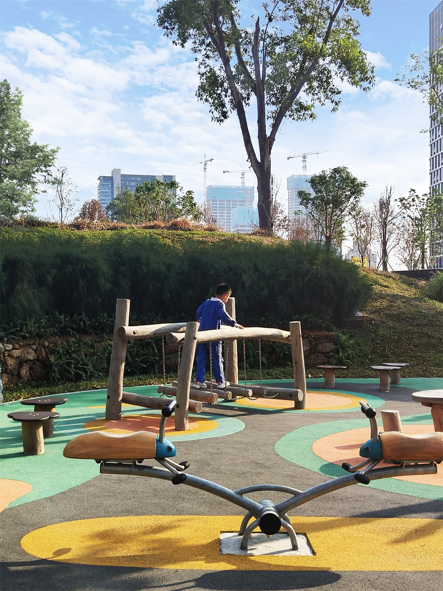 在公園的硬質(zhì)材料體系中,大量運(yùn)用耐候鋼板、木材,既展現(xiàn)了自然之貌,又為場(chǎng)地帶來溫暖的質(zhì)感,材料在陽光照射下,呈現(xiàn)出微妙動(dòng)人的紋理變化。