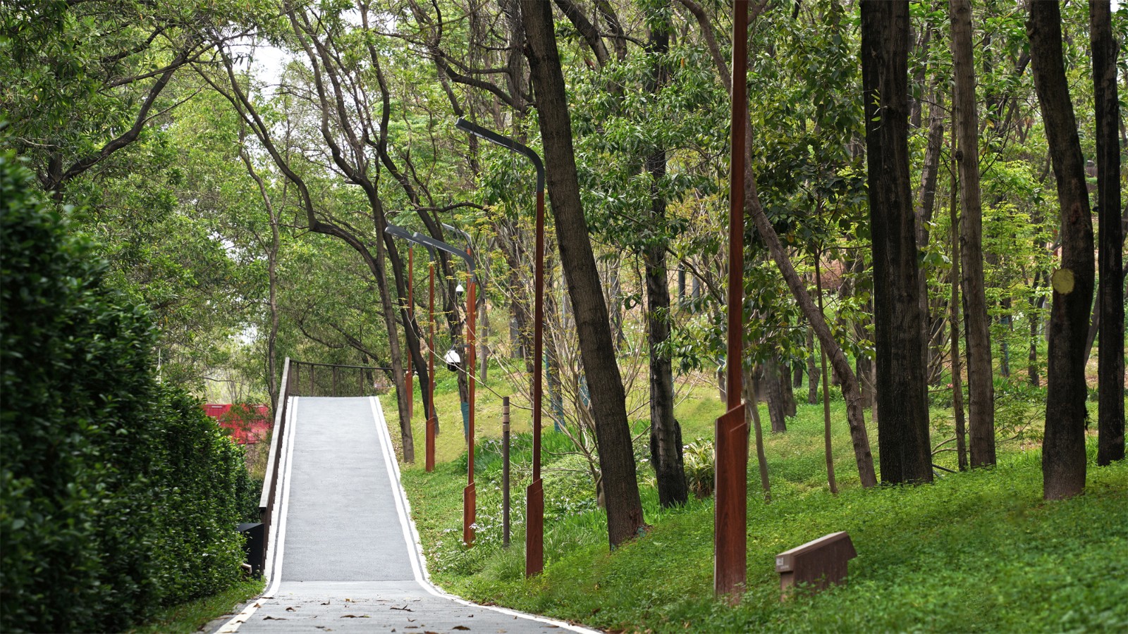 僑城北公園設(shè)有兩個(gè)出入口,沿東西兩側(cè)的城市主干道進(jìn)行了入口界面的設(shè)計(jì)。在城市道路轉(zhuǎn)角處,以“林”作為空間的起點(diǎn)將人流引入。撥開一抹綠意,半地下停車場(chǎng)消隱在繁茂的植被后,人性化的人車通行系統(tǒng),提升了訪客進(jìn)入公園的通達(dá)性和便民度。于此,開啟一段詩意的山林之旅。