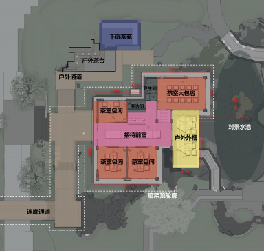 拾級而上,穿過山石界定的院門,進入茶室前庭,是一處安靜的院落,拙樸的踏步石,流水石,飄逸的紅楓,散置的礫石,緩緩的溪流。約180㎡茶室臨水而建,遍植蓮花,水岸藤蘿,幽靜的水院,以茶會友,感受風雅茶道氛圍。