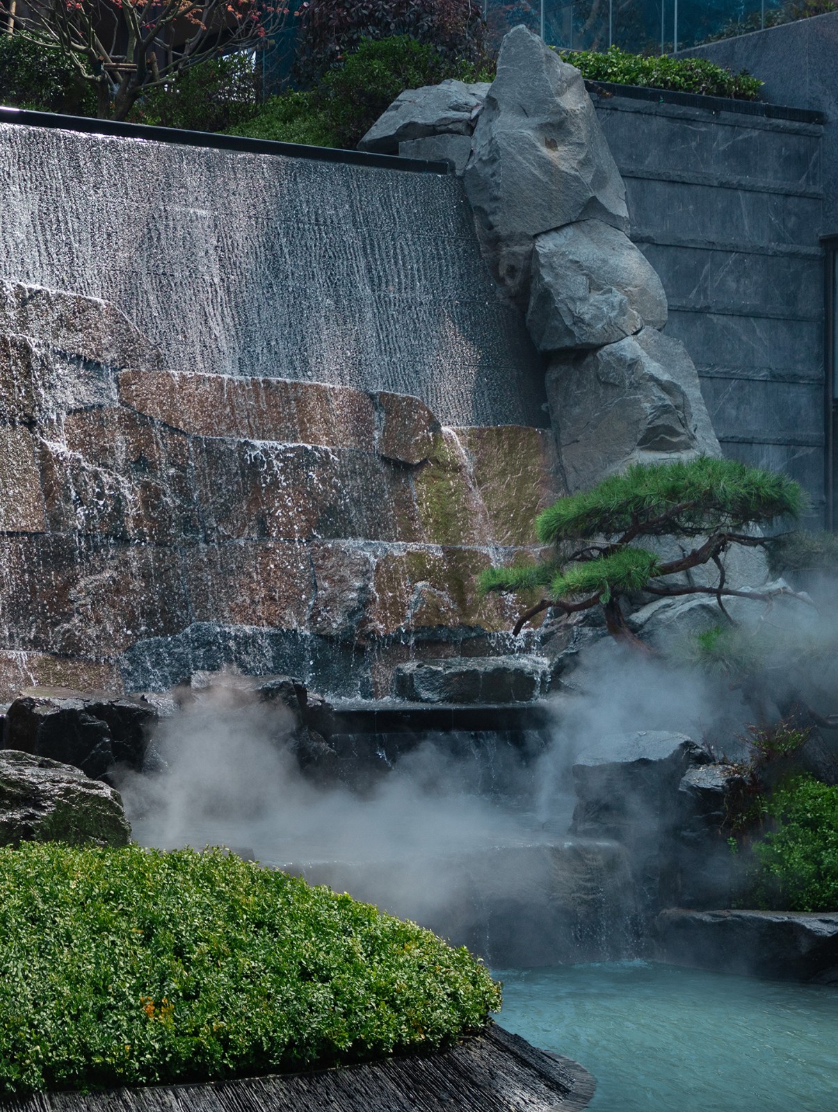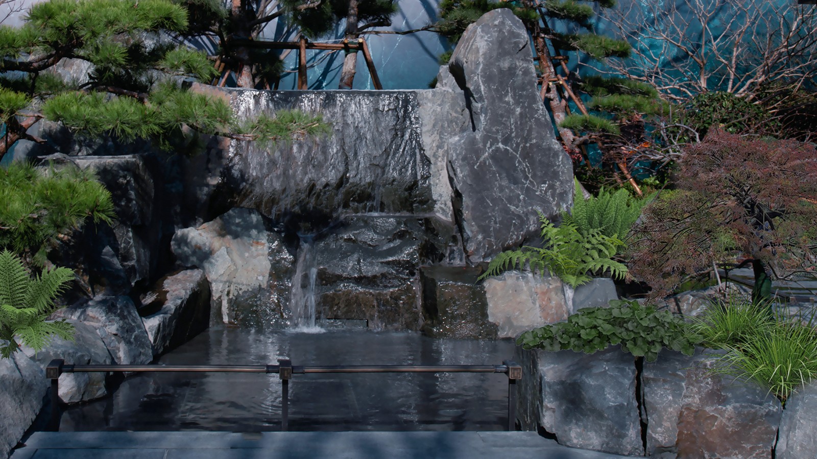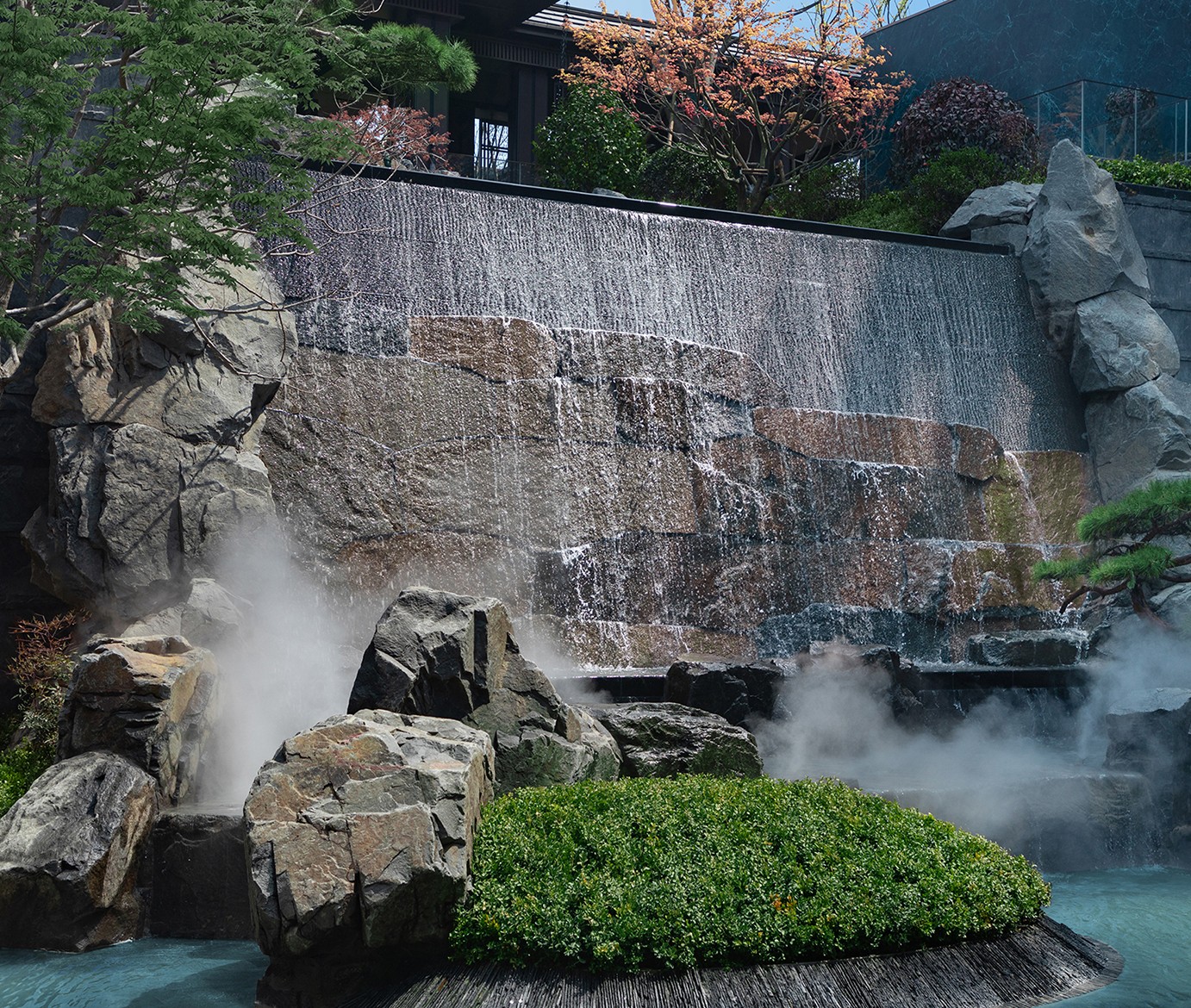 流水瀑布以太行山脈的河北黑景石雕琢,精選烏桕、造型松、紅楓及羽毛楓等名貴苗木。瀑布周邊種植了多棵象征運開時泰的造型烏桕和象征吉祥如意、鴻運當頭的精品紅楓,有聚水觀林(財),賓客如潮的“高門大園”典故。