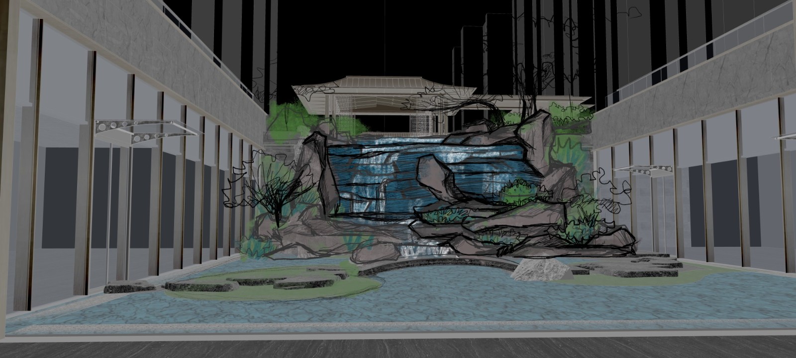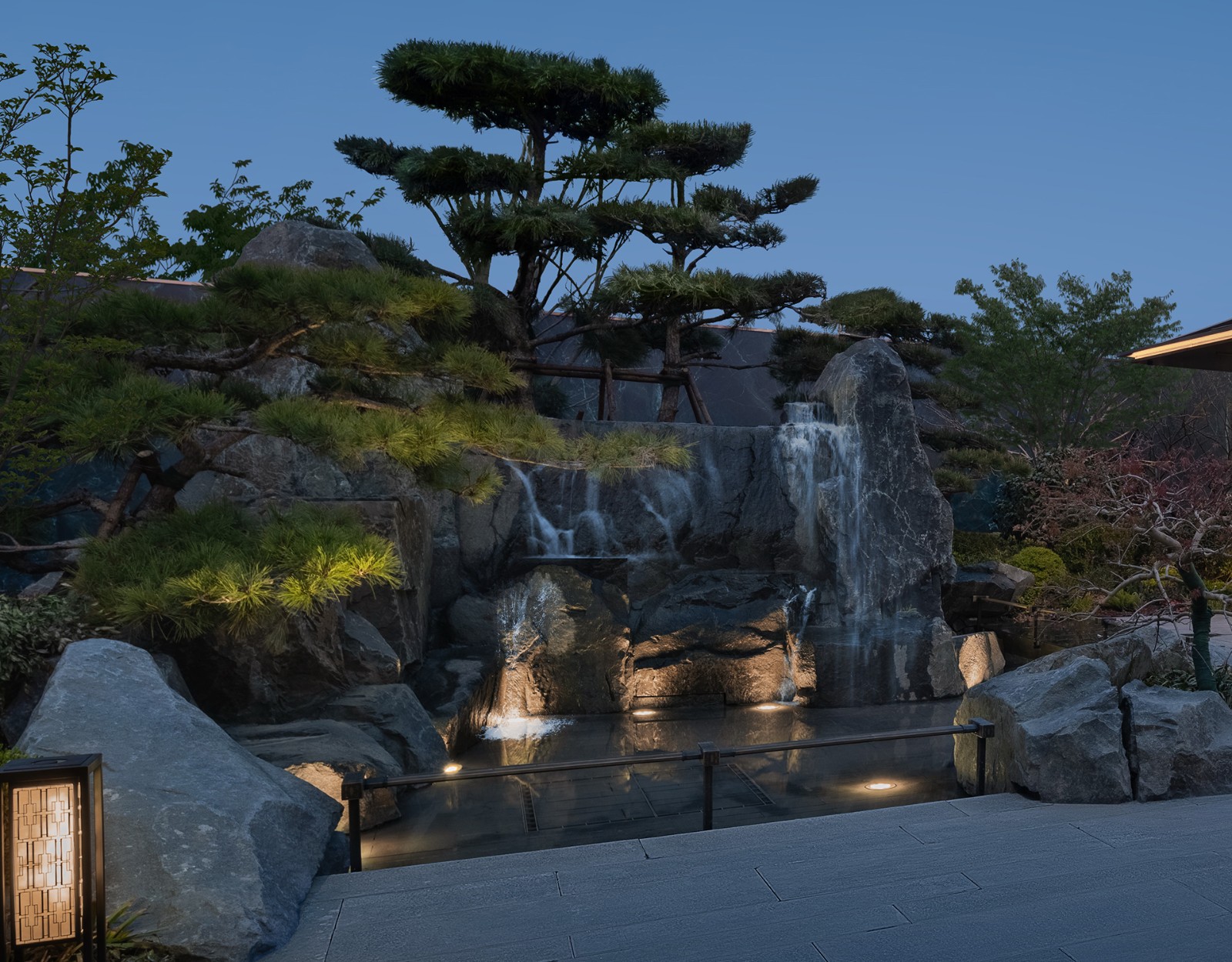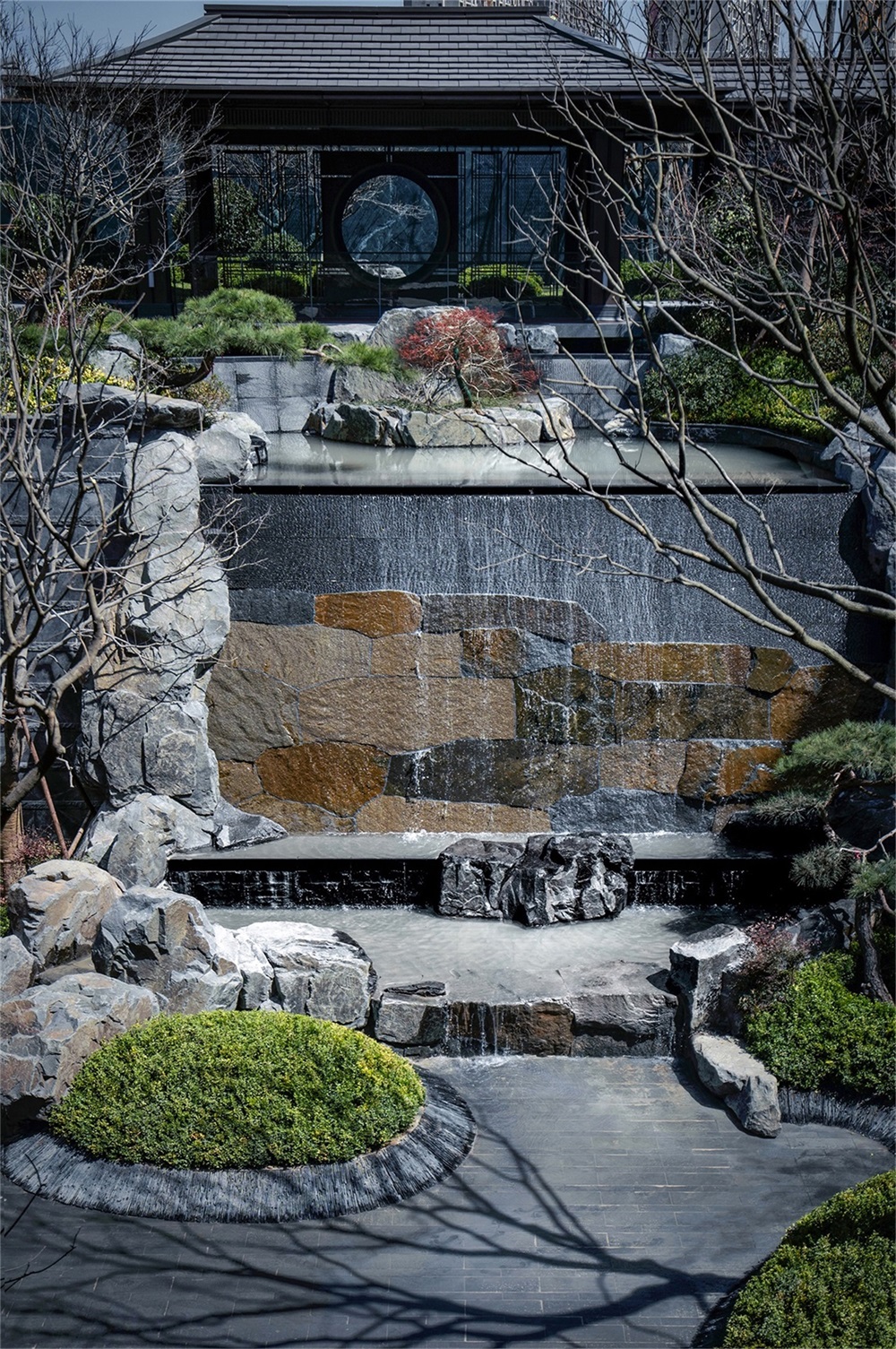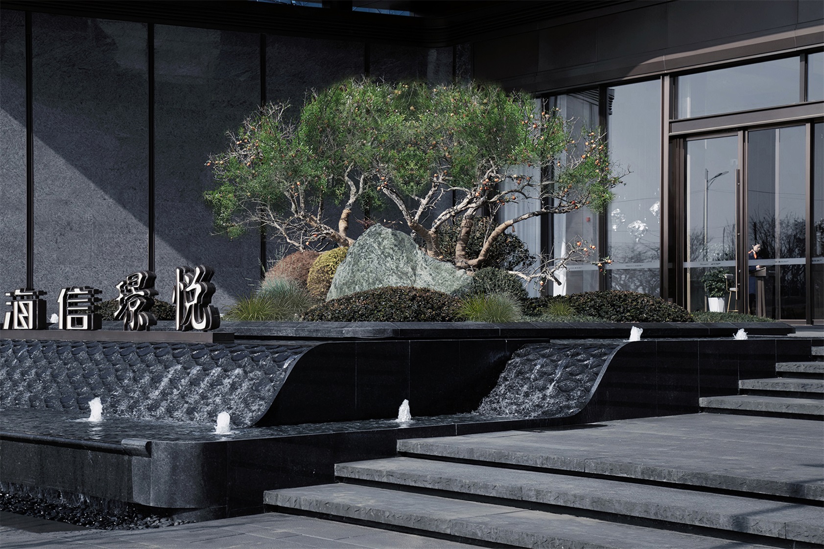 流水瀑布以太行山脈的河北黑景石雕琢,精選烏桕、造型松、紅楓及羽毛楓等名貴苗木。瀑布周邊種植了多棵象征運開時泰的造型烏桕和象征吉祥如意、鴻運當頭的精品紅楓,有聚水觀林(財),賓客如潮的“高門大園”典故。