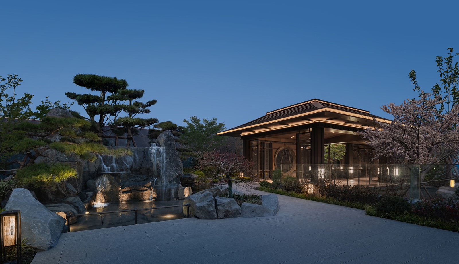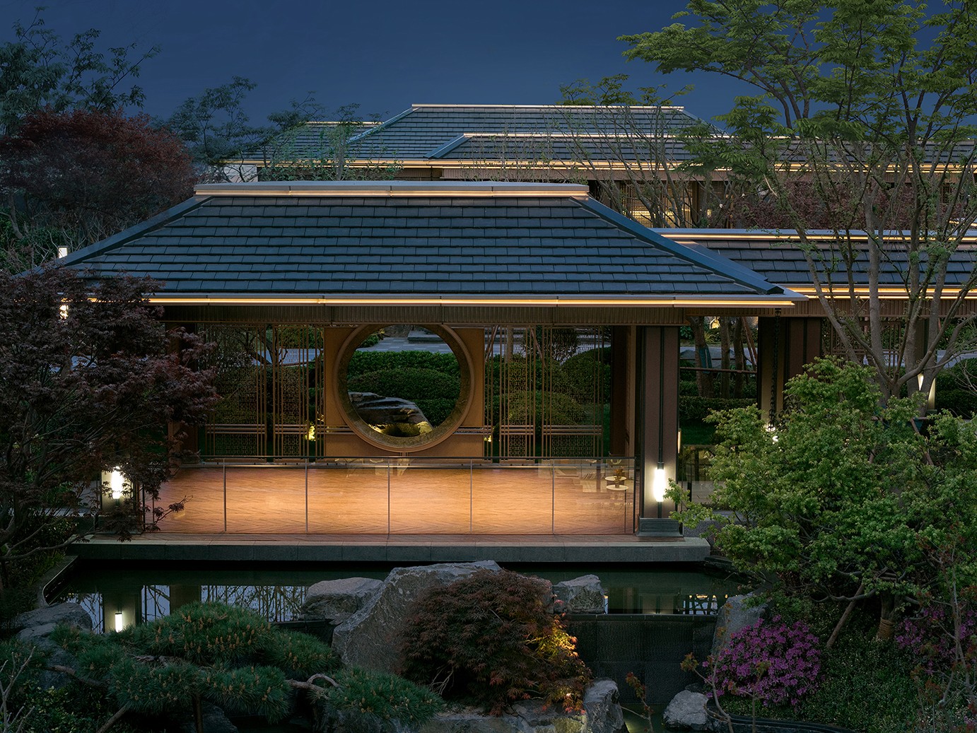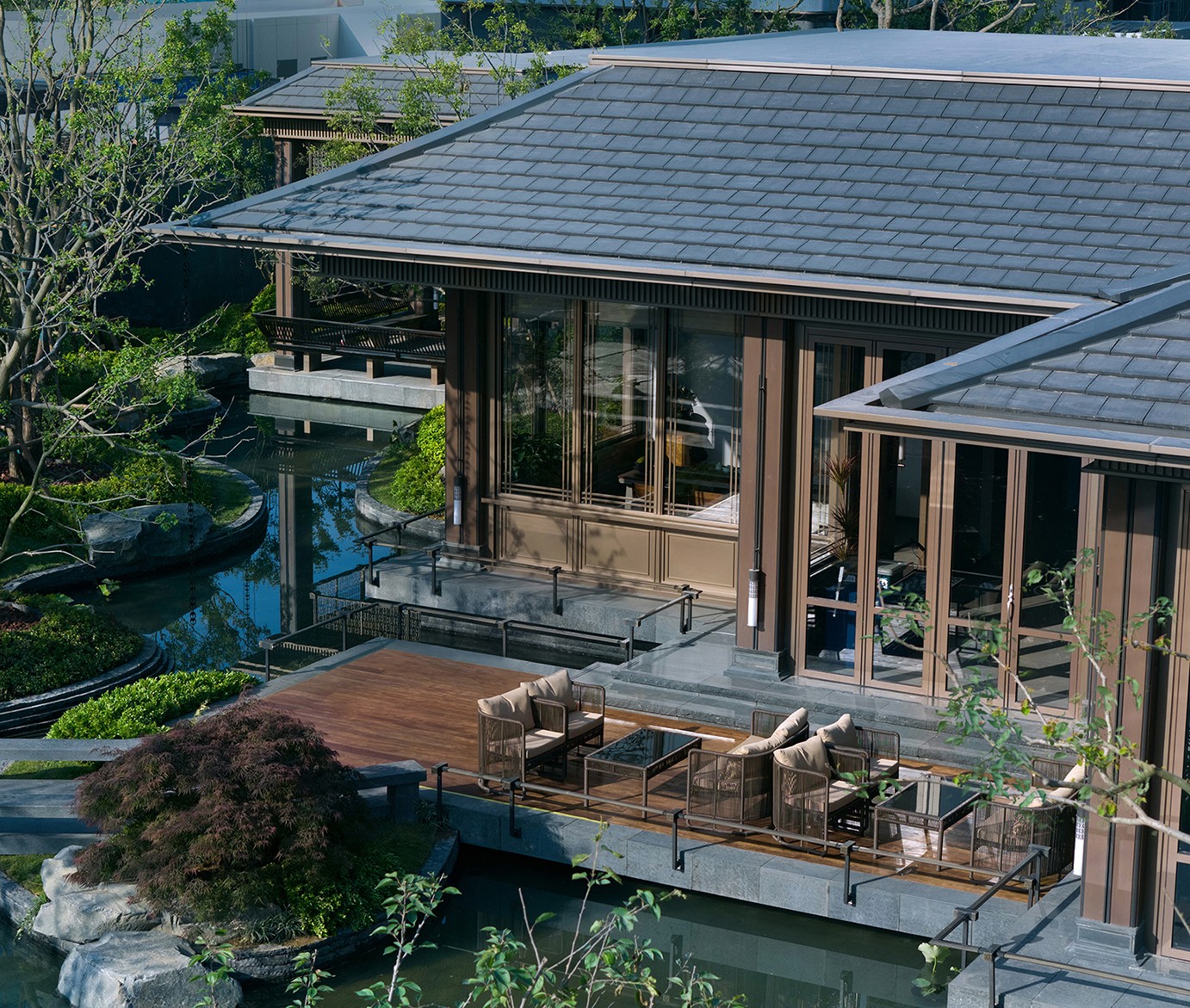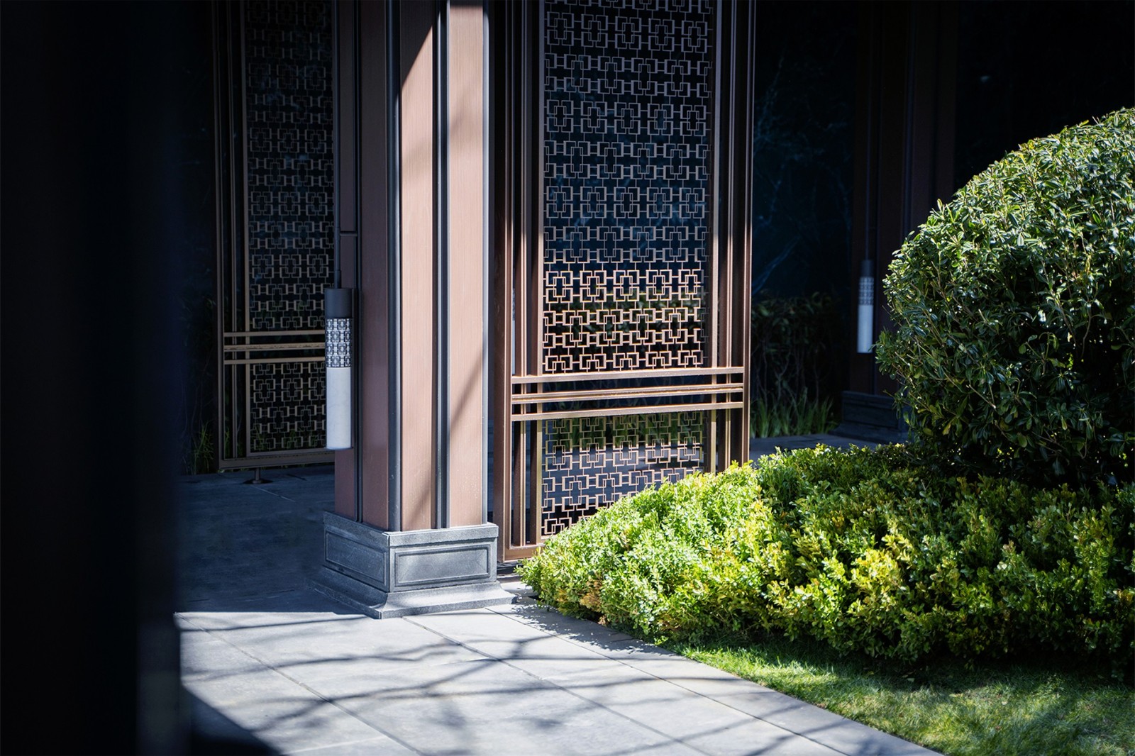 步移景異之中,以構筑、景墻形成框景,游園如觀畫,以空間禮序詮釋東方美學的格局。茶室、園林、連廊、清池、山石,形成軸院布局,層層遞進。斜倚亭邊美人靠小坐,天光云影,水間錦鯉遨游,營造專屬沉浸的自然奢想。