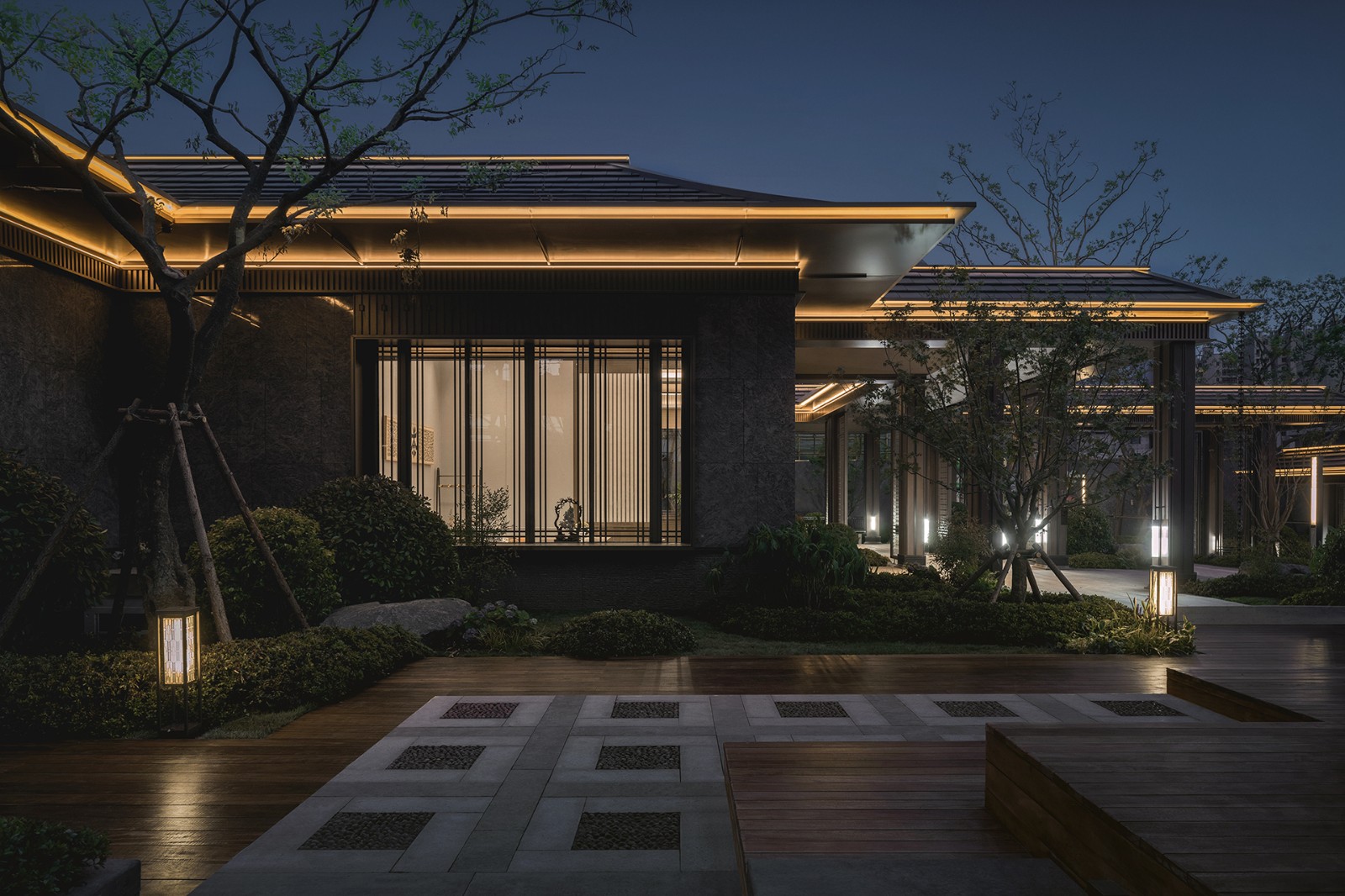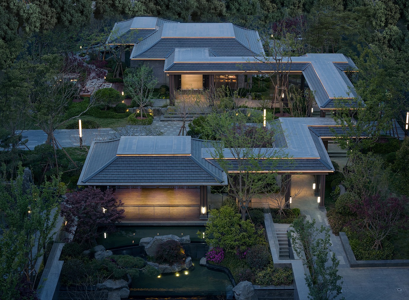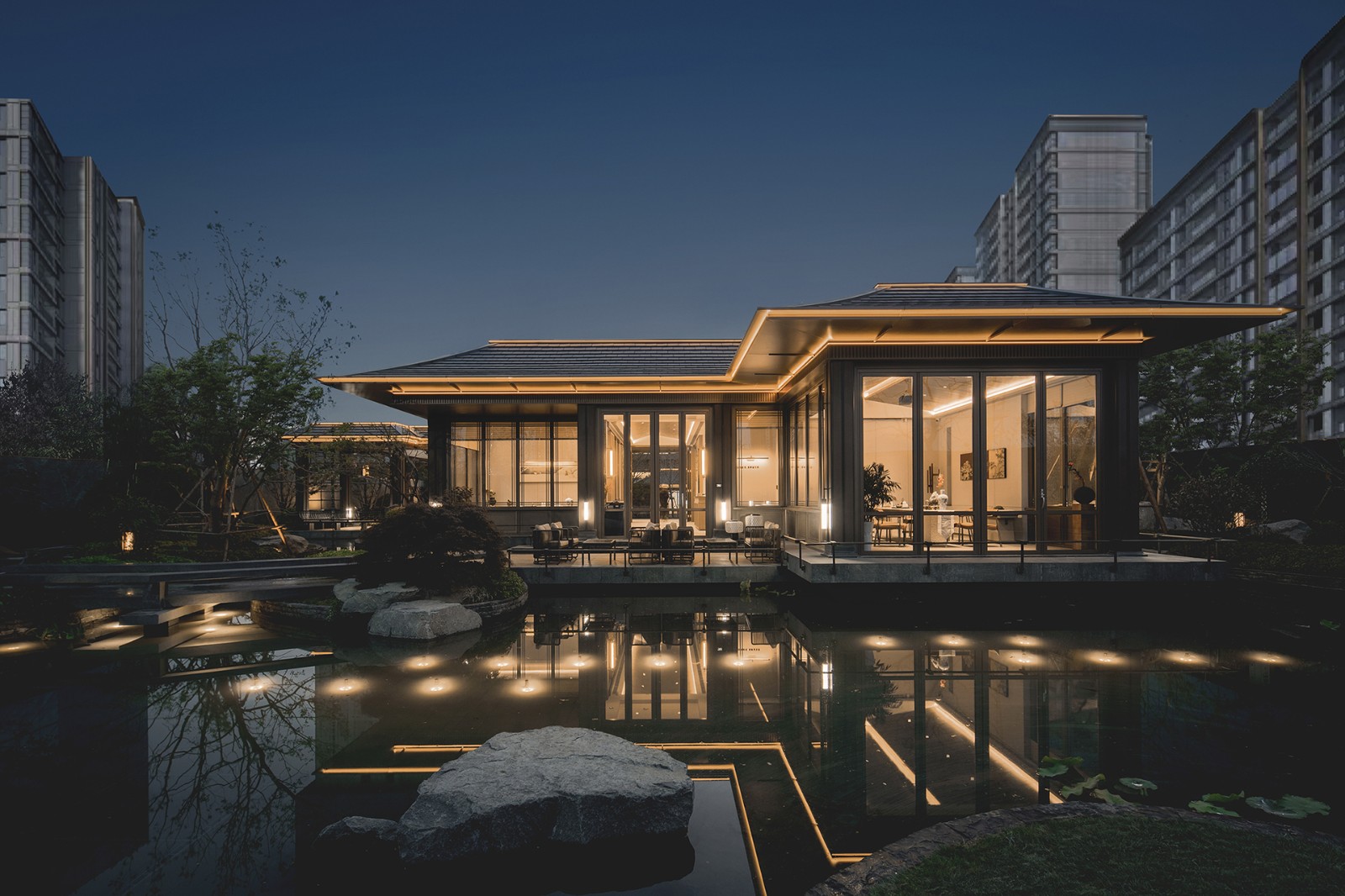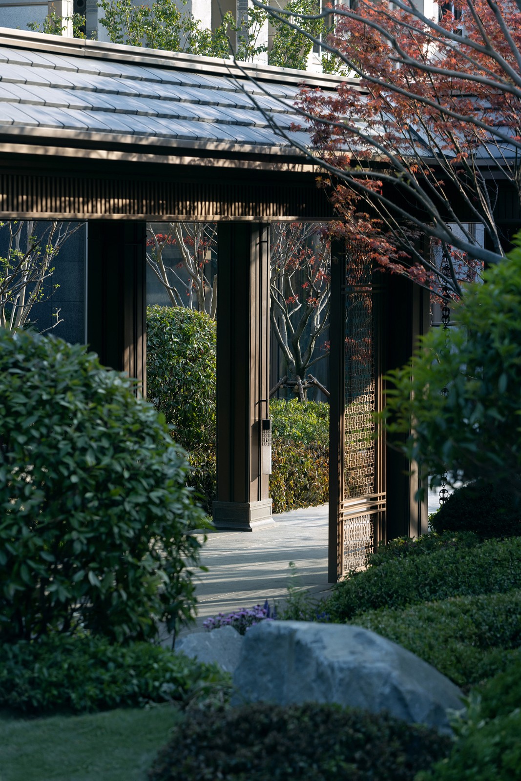 步移景異之中,以構筑、景墻形成框景,游園如觀畫,以空間禮序詮釋東方美學的格局。茶室、園林、連廊、清池、山石,形成軸院布局,層層遞進。斜倚亭邊美人靠小坐,天光云影,水間錦鯉遨游,營造專屬沉浸的自然奢想。