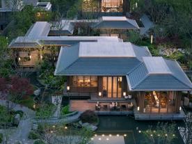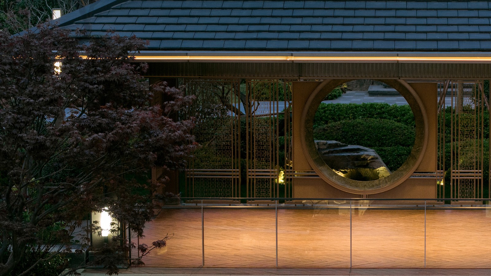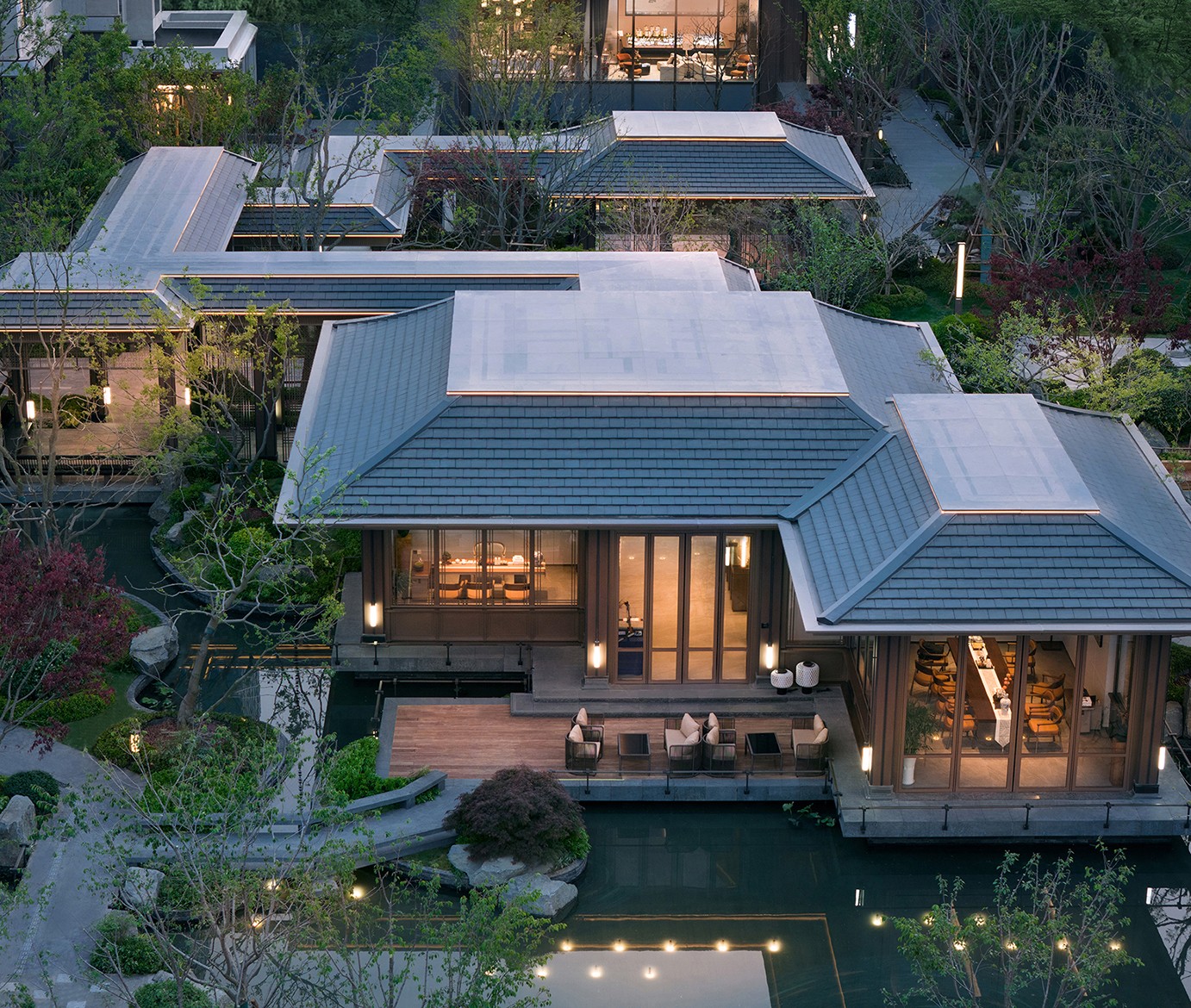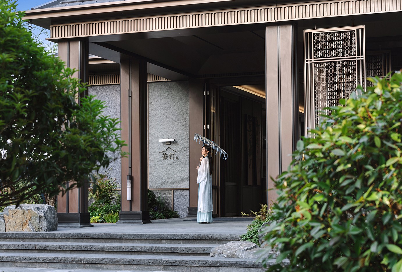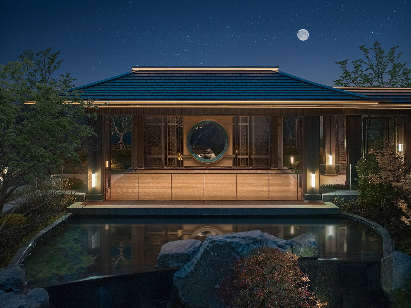 步移景異之中,以構筑、景墻形成框景,游園如觀畫,以空間禮序詮釋東方美學的格局。茶室、園林、連廊、清池、山石,形成軸院布局,層層遞進。斜倚亭邊美人靠小坐,天光云影,水間錦鯉遨游,營造專屬沉浸的自然奢想。