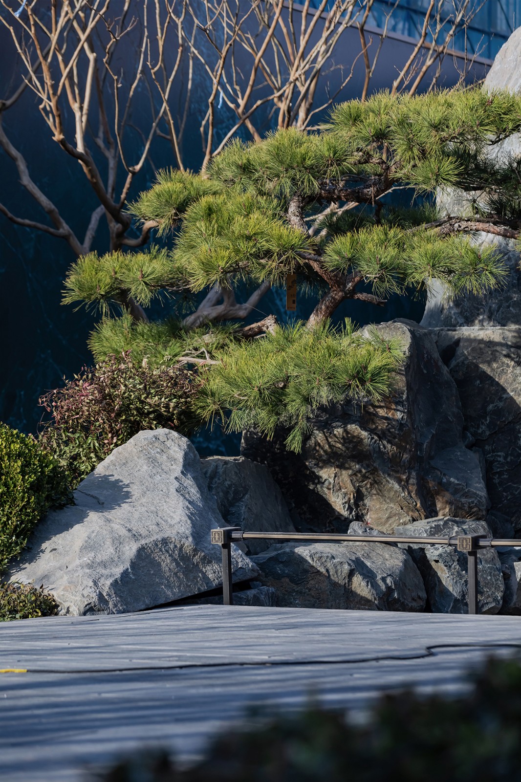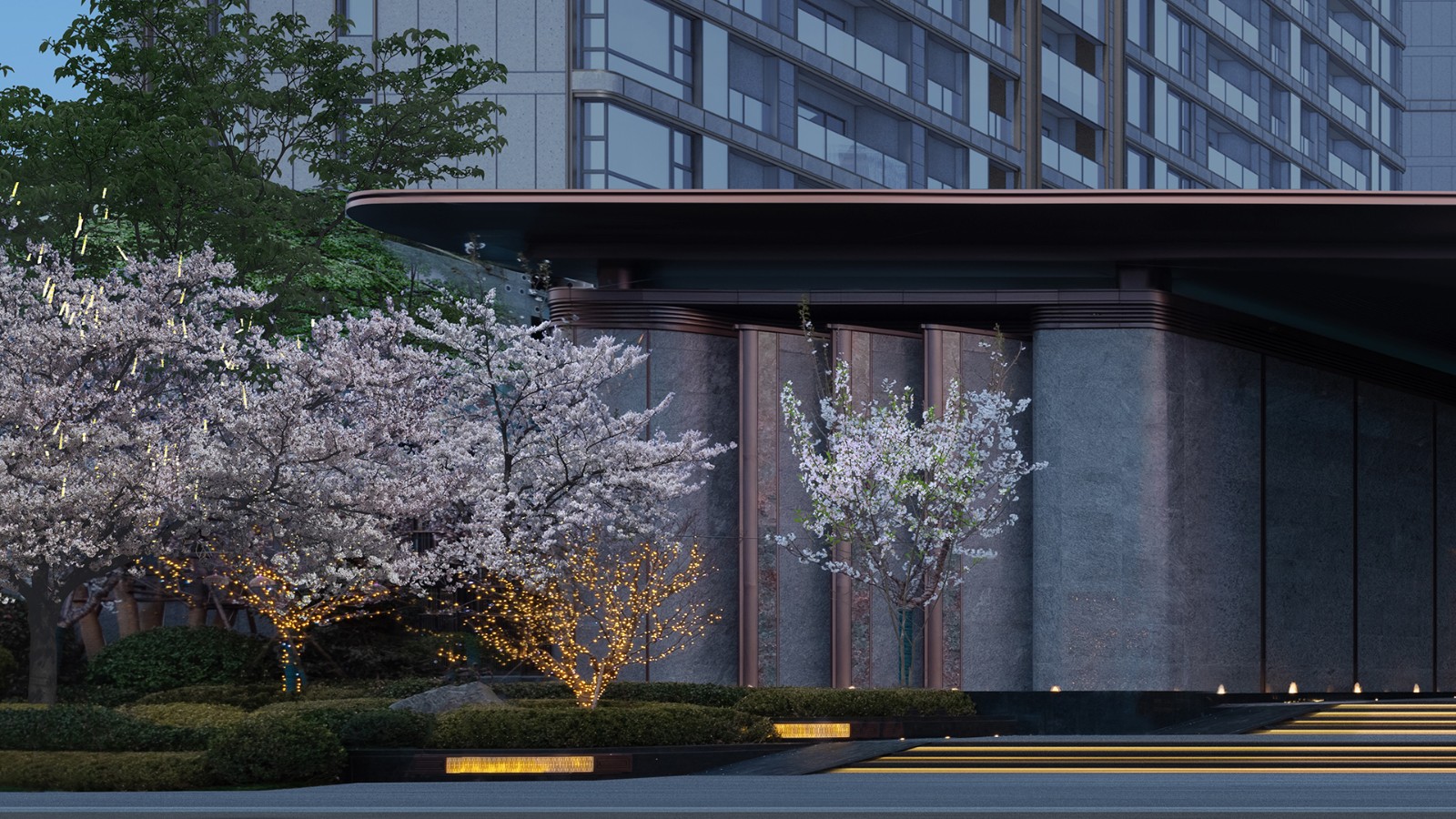 入口兩側特選的紅楓與藍杉,結合景墻特選12米超大規(guī)格叢生樸樹,營造大氣雅致的歸家禮序。