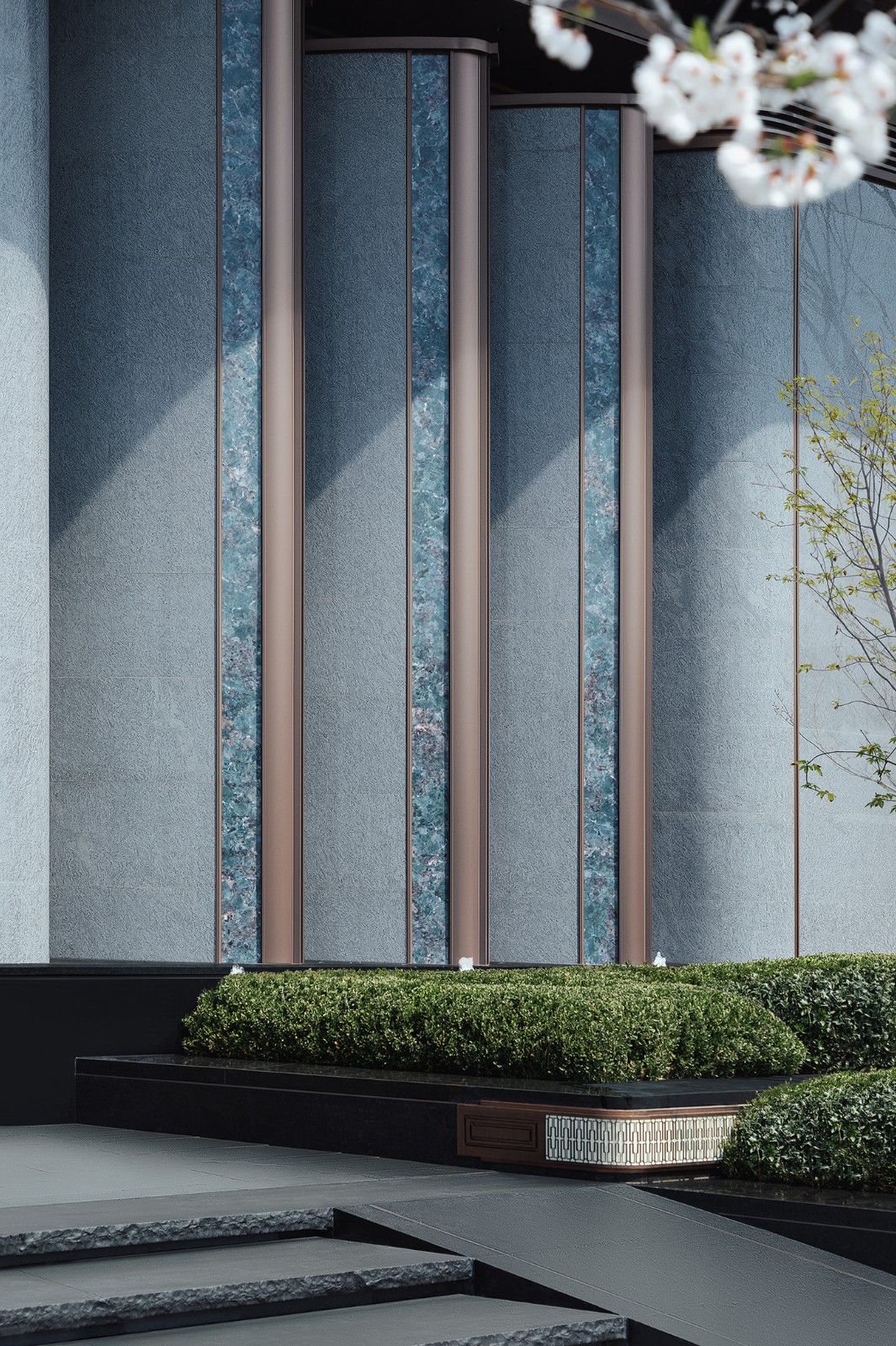 中島式迎賓水景,甄選青島獨有的嶗山玉石原石,石中嬌子,熠熠生輝。前場華麗地鋪及層層跌水,流水涓涓,恰如唐代王維的詩詞“行到水窮處,坐看云起時”,“清泉石上流”,山水與城市的和鳴,每一步都是璀璨的歸家禮序。